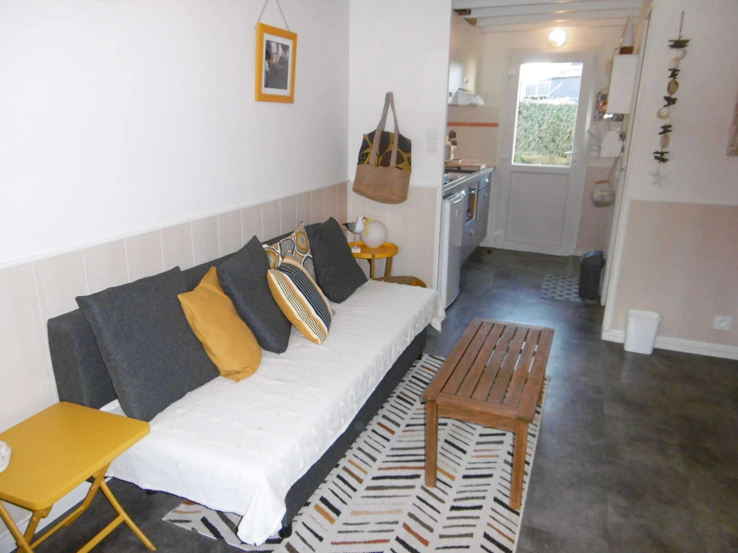 - Un séjour avec un canapé type clic-clac donnant sur le jardin