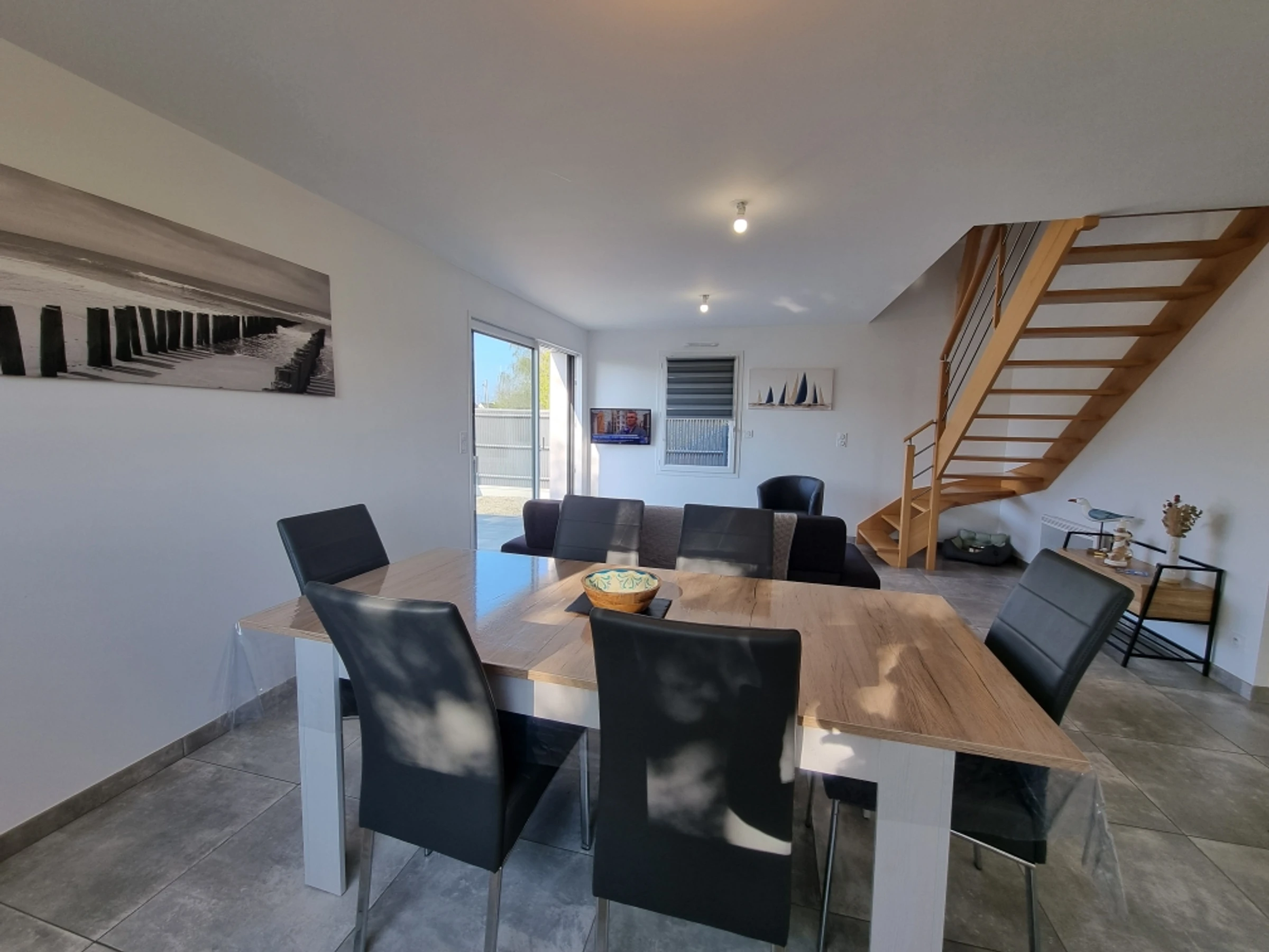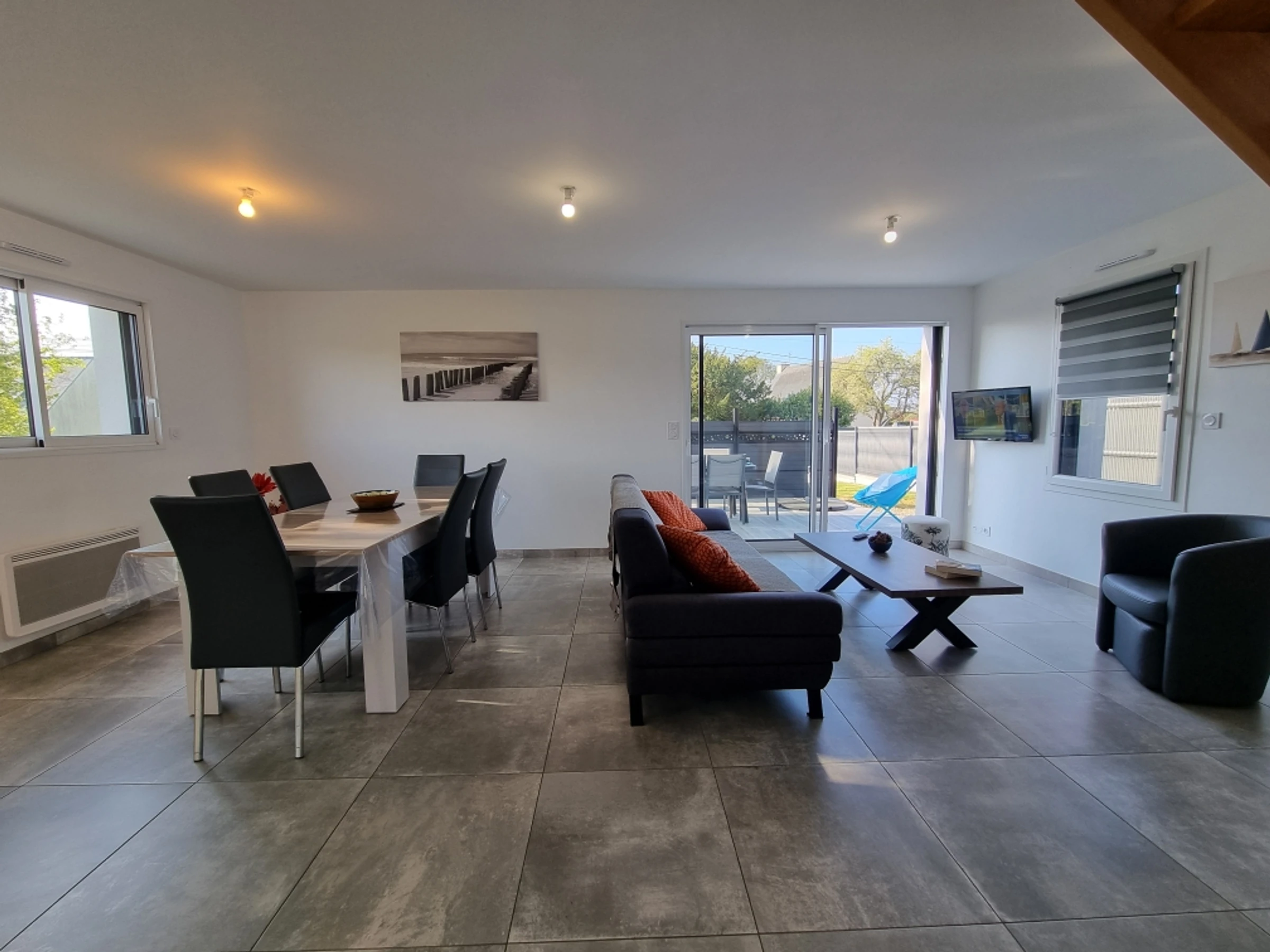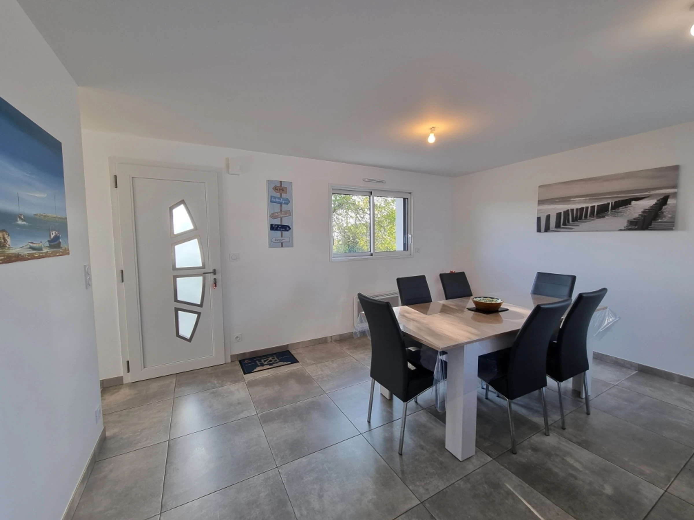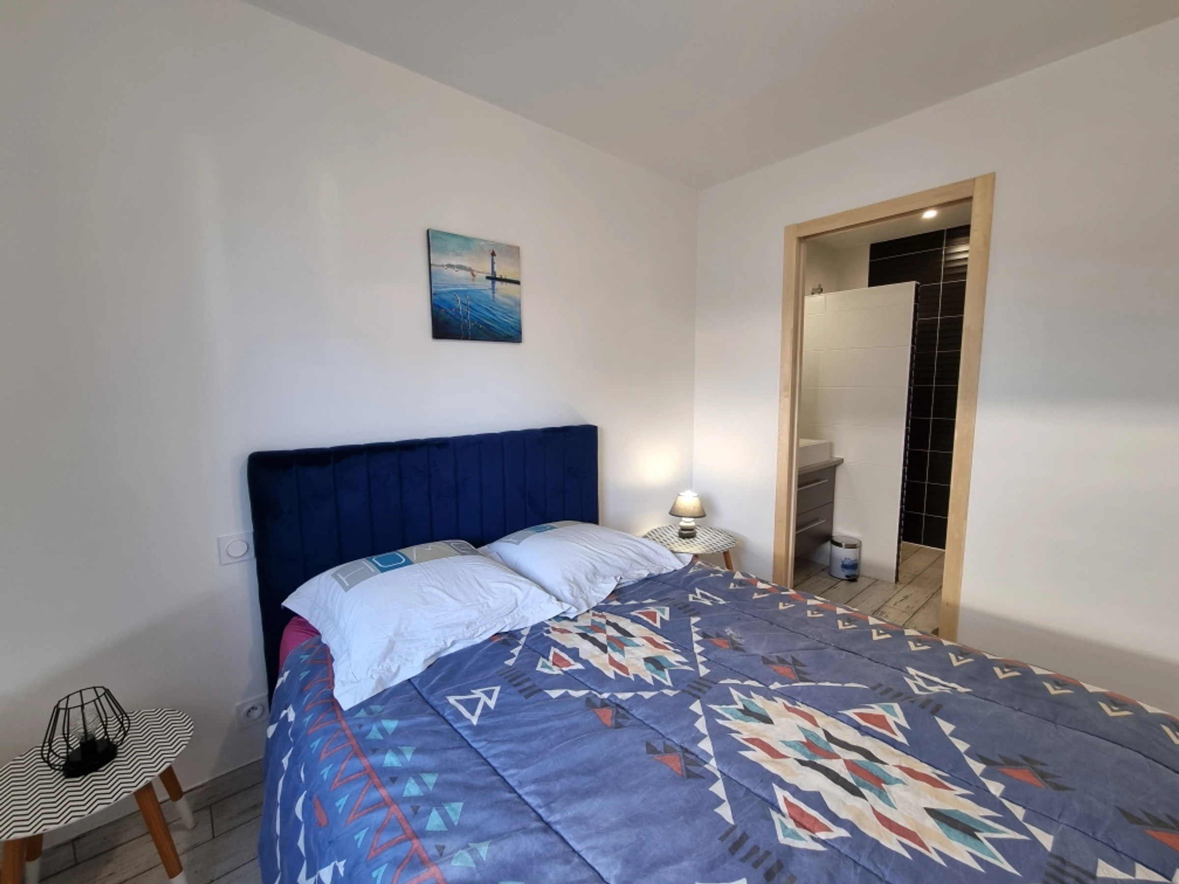 Au calme, proche plage, maison récente comprenant au rez-de-chaussée : entrée, séjour-salon avec TV, coin cuisine équipé et aménagé (réfrigérateur avec compartiment congélateur, plaque induction avec 3 feux, four, micro-ondes, lave-vaisselle, cafetière électrique à filtres), toilettes avec lave-mains, 1ère chambre (1 lit 140) avec placard (étagères et penderie) et salle de douche attenante.