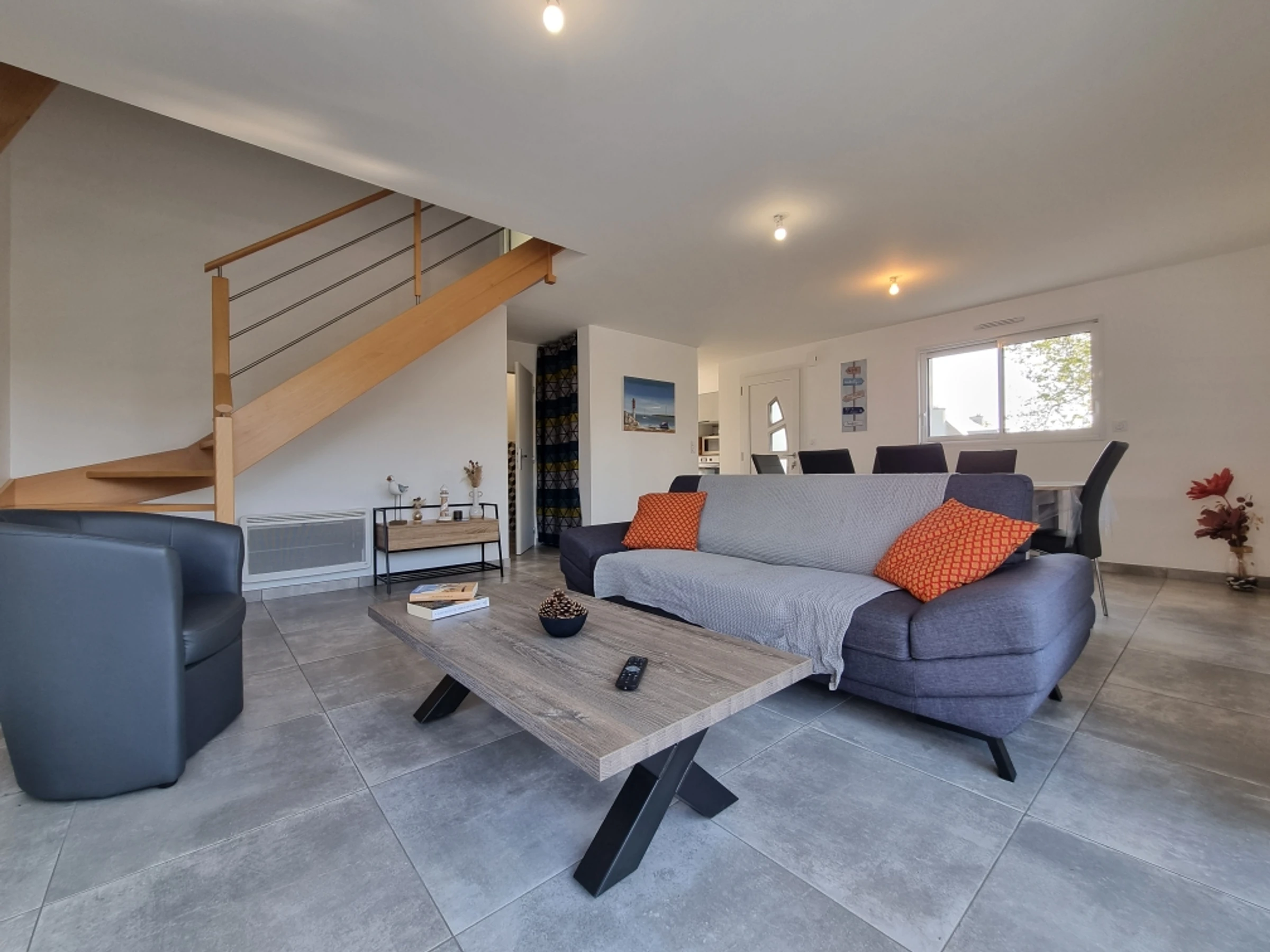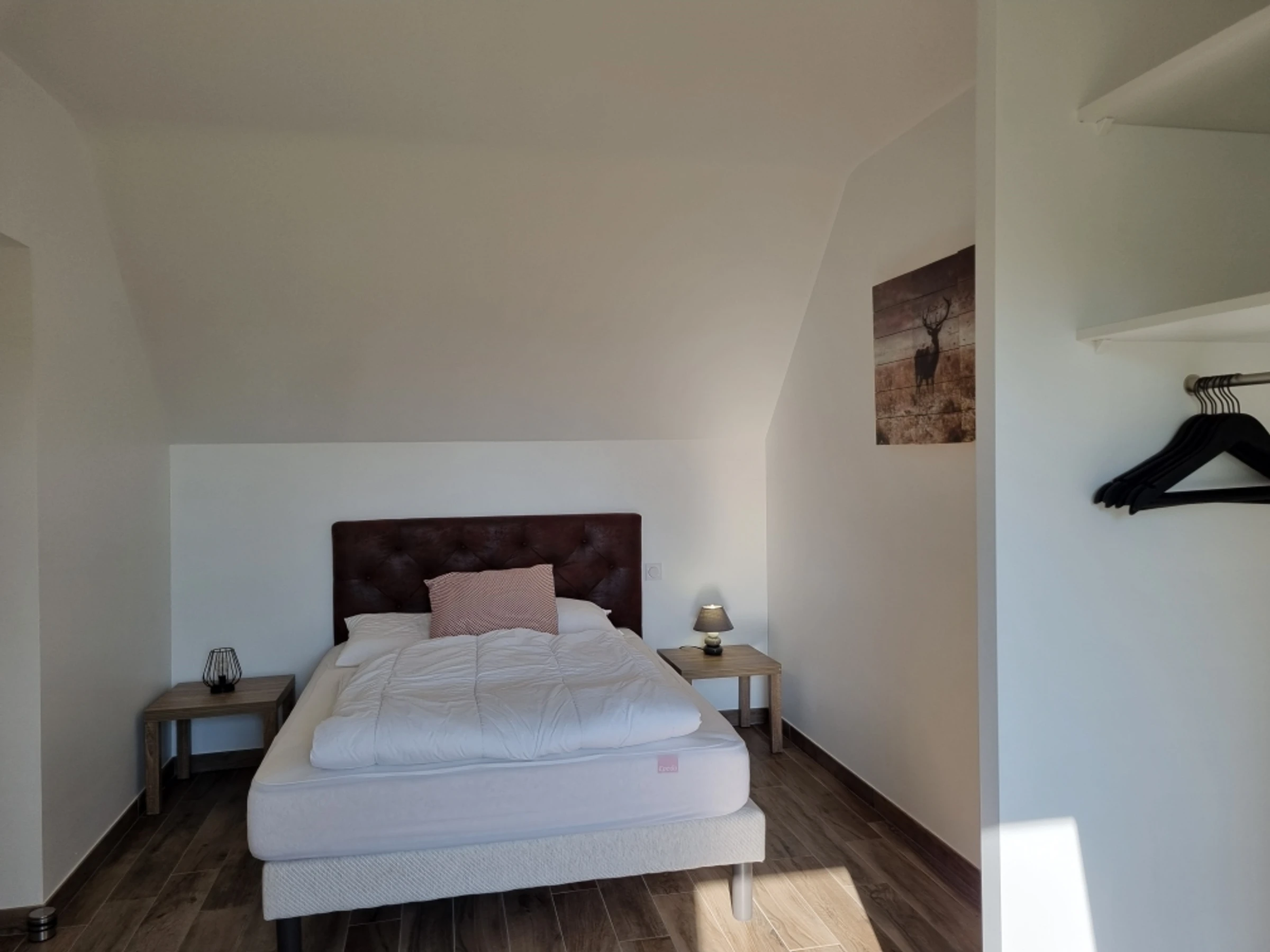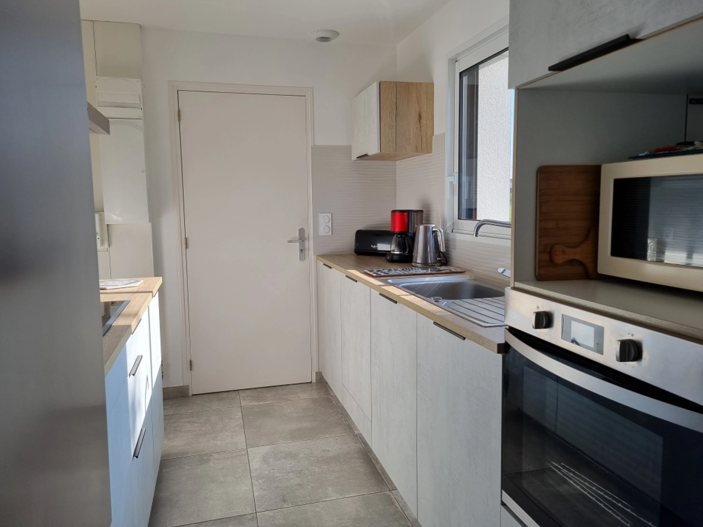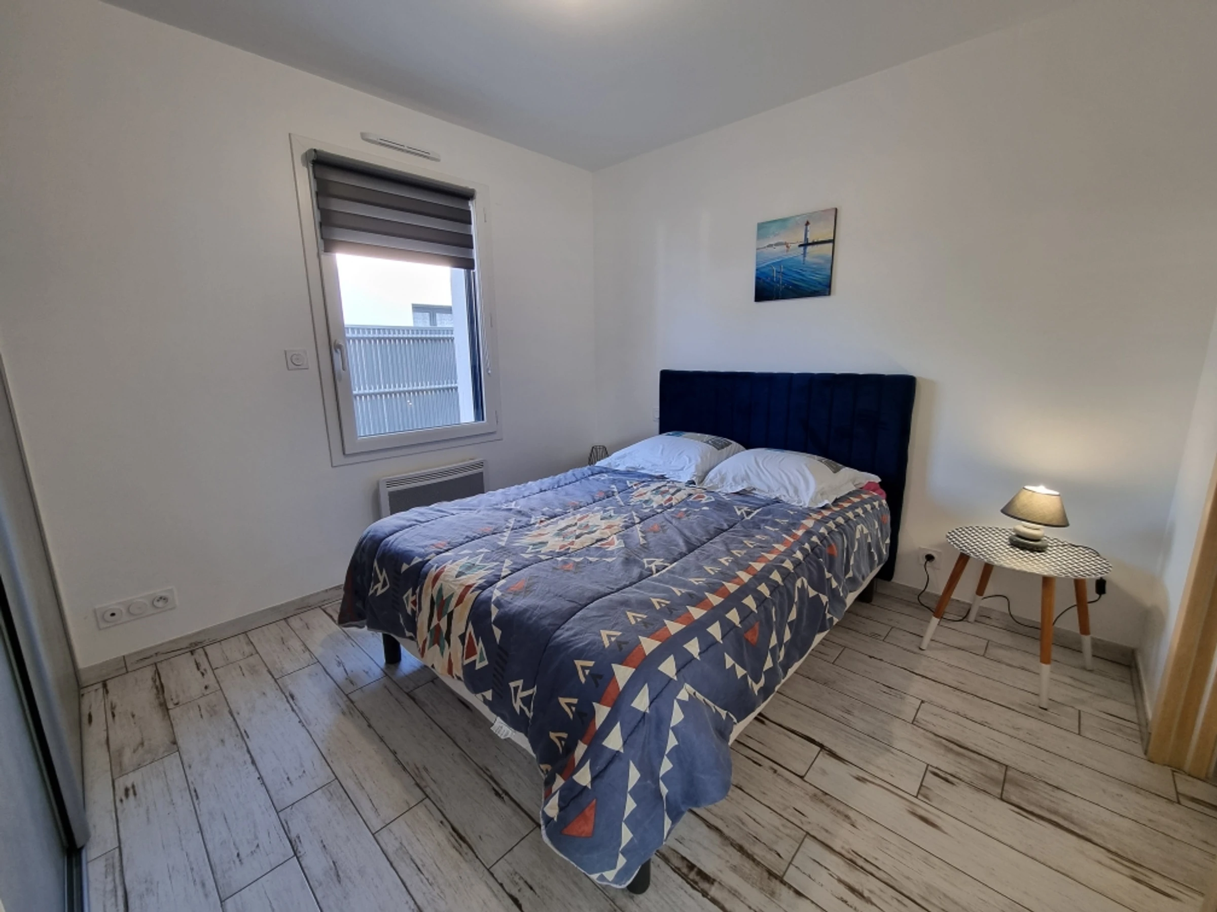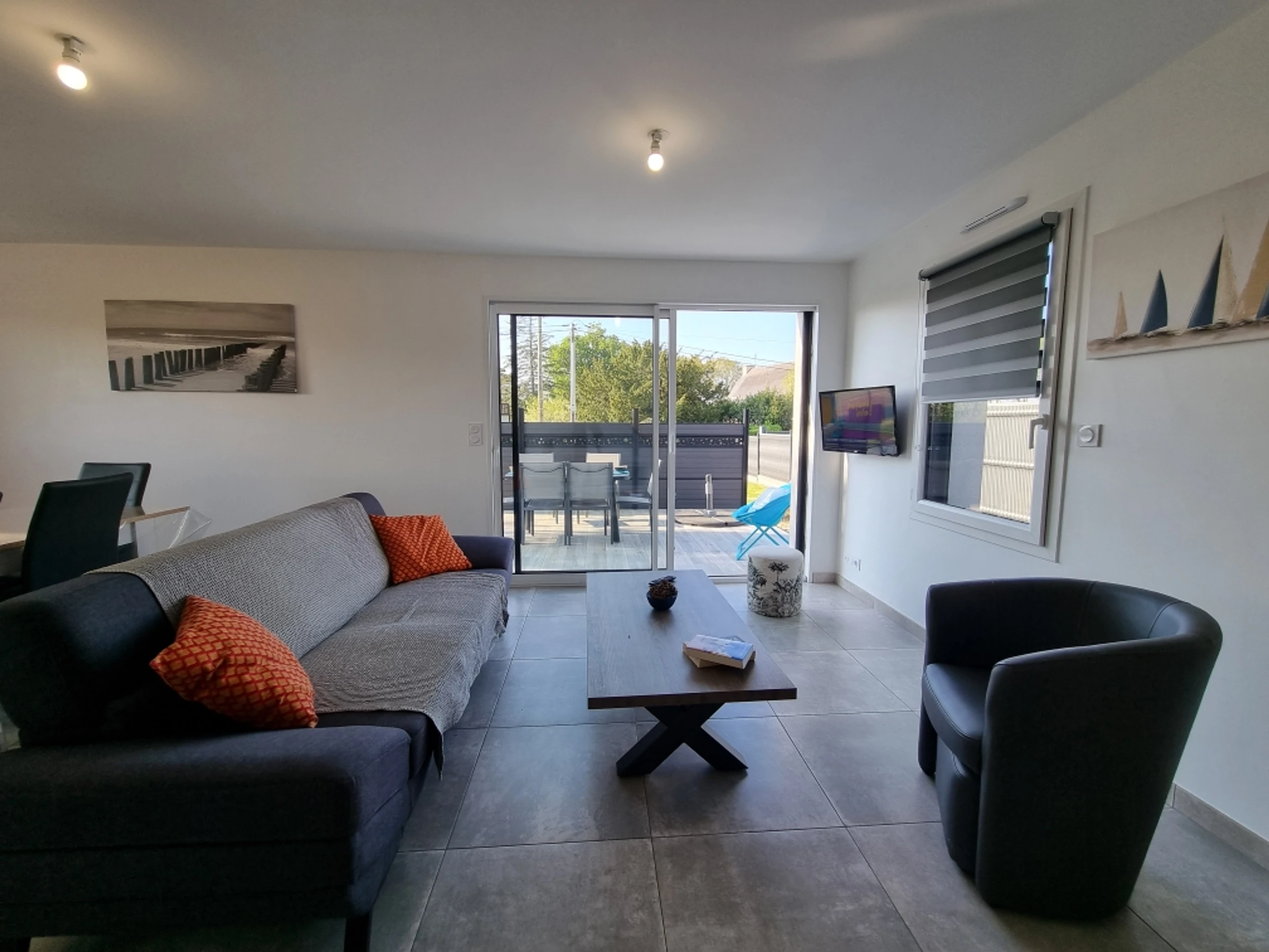 Au calme, proche plage, maison récente comprenant au rez-de-chaussée : entrée, séjour-salon avec TV, coin cuisine équipé et aménagé (réfrigérateur avec compartiment congélateur, plaque induction avec 3 feux, four, micro-ondes, lave-vaisselle, cafetière électrique à filtres), toilettes avec lave-mains, 1ère chambre (1 lit 140) avec placard (étagères et penderie) et salle de douche attenante.
