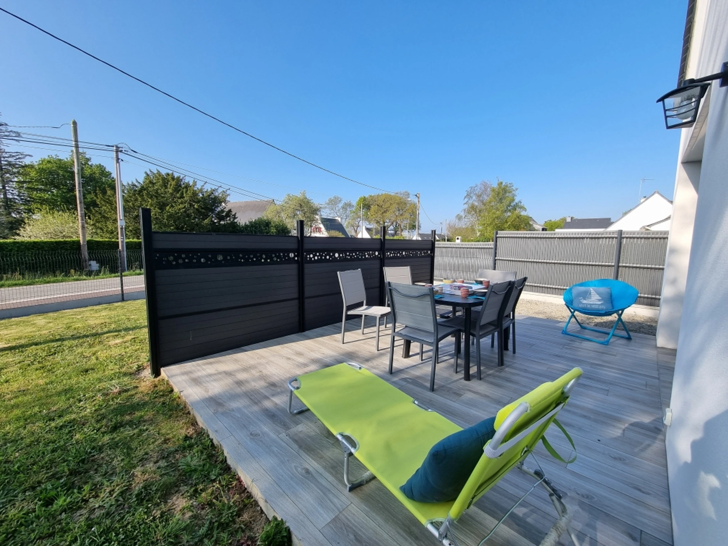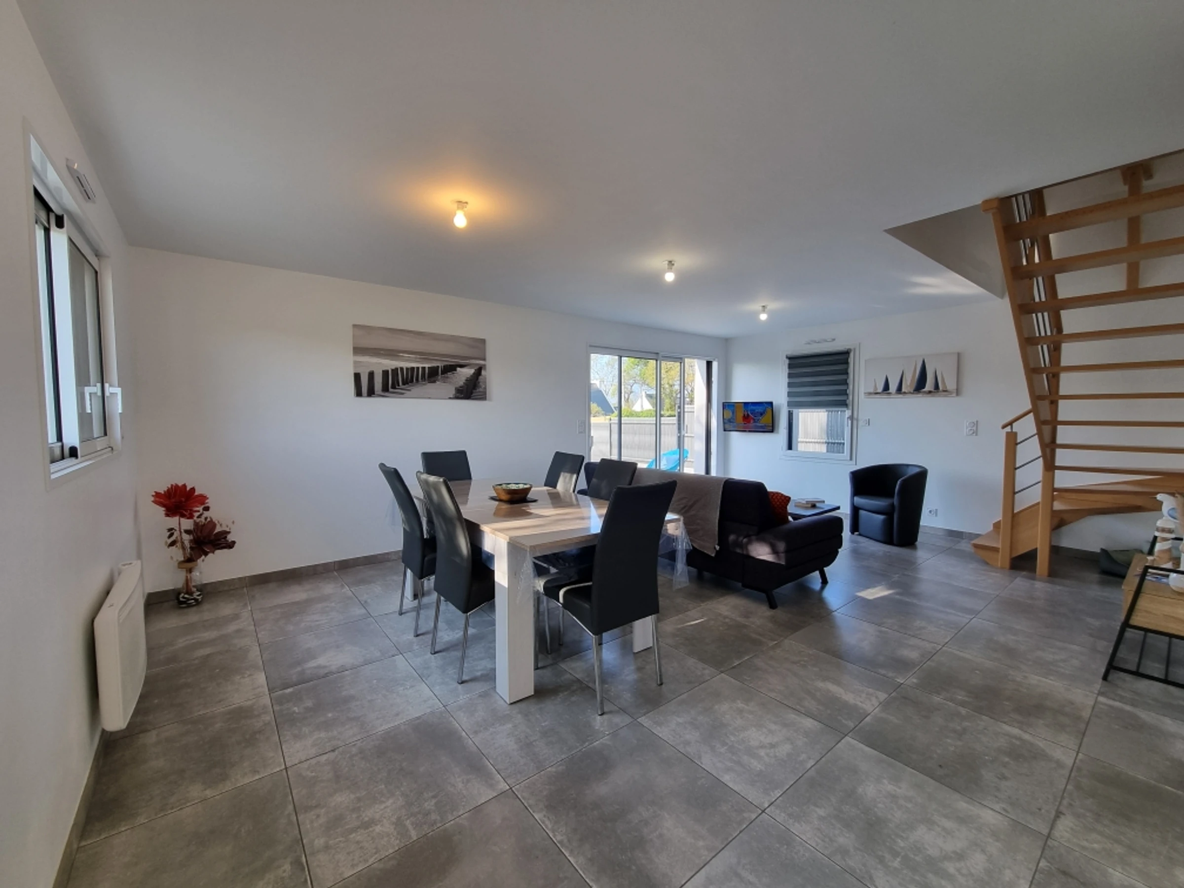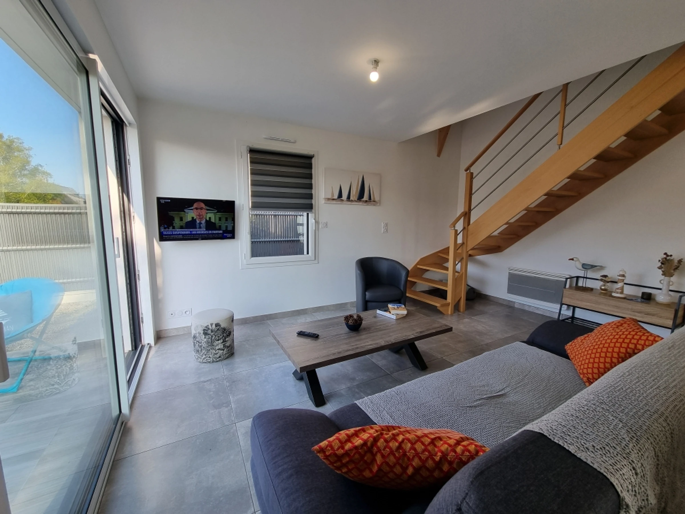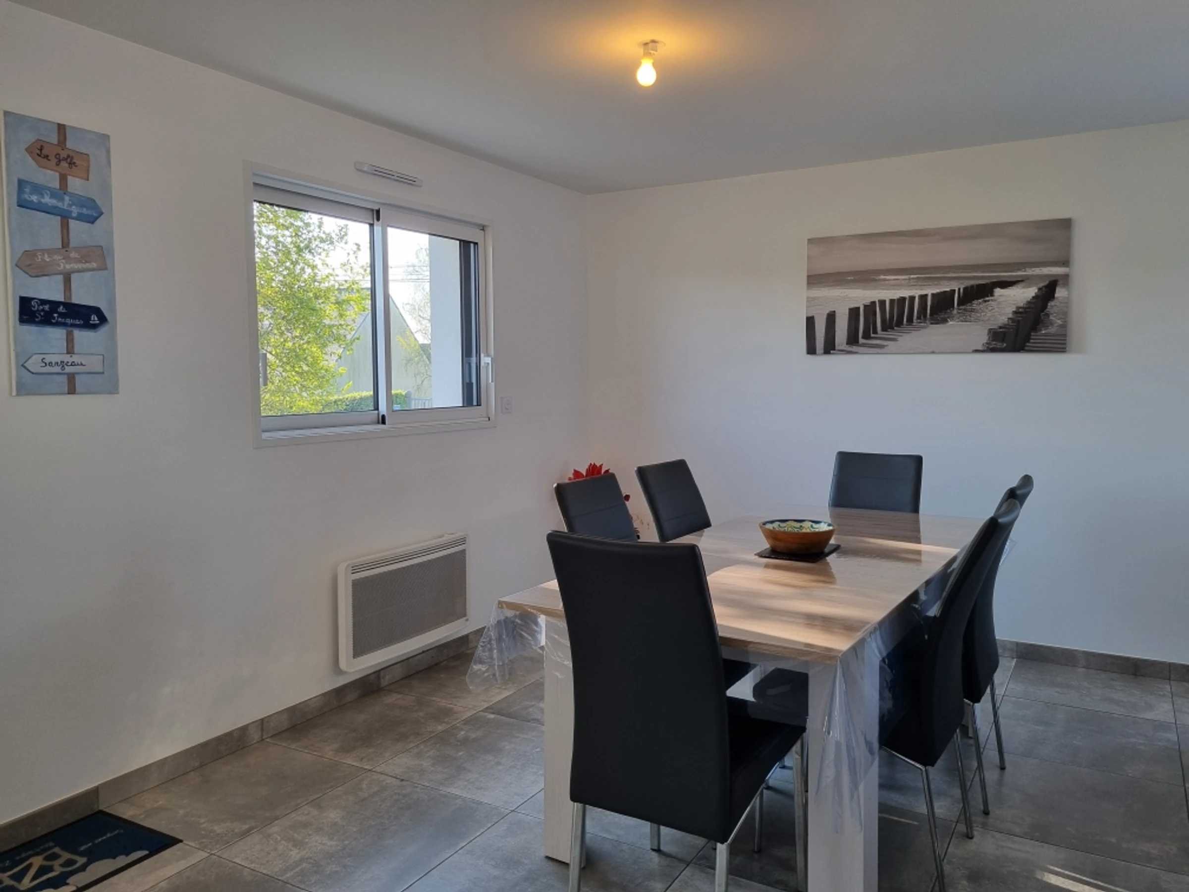 Au calme, proche plage, maison récente comprenant au rez-de-chaussée : entrée, séjour-salon avec TV, coin cuisine équipé et aménagé (réfrigérateur avec compartiment congélateur, plaque induction avec 3 feux, four, micro-ondes, lave-vaisselle, cafetière électrique à filtres), toilettes avec lave-mains, 1ère chambre (1 lit 140) avec placard (étagères et penderie) et salle de douche attenante.