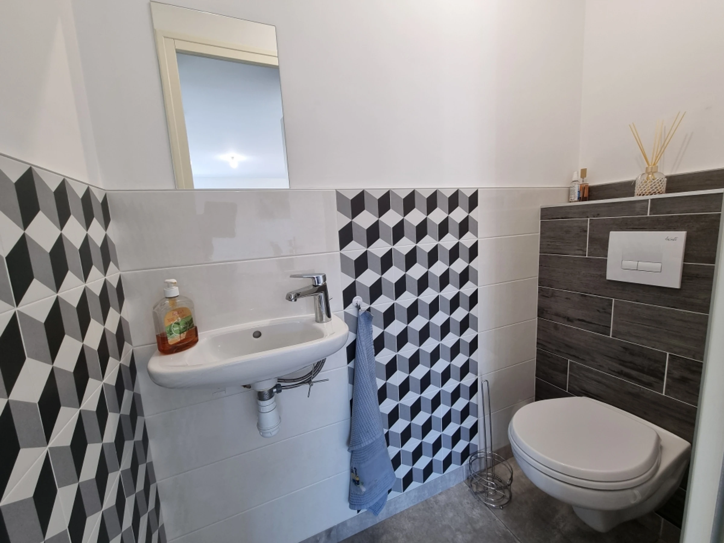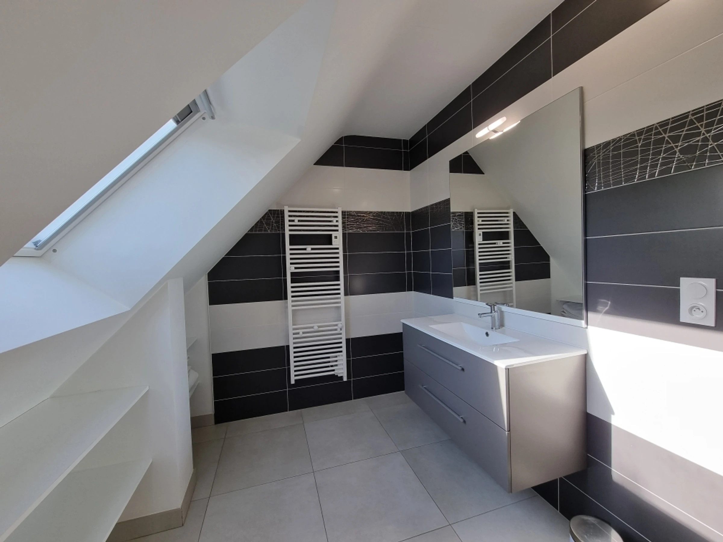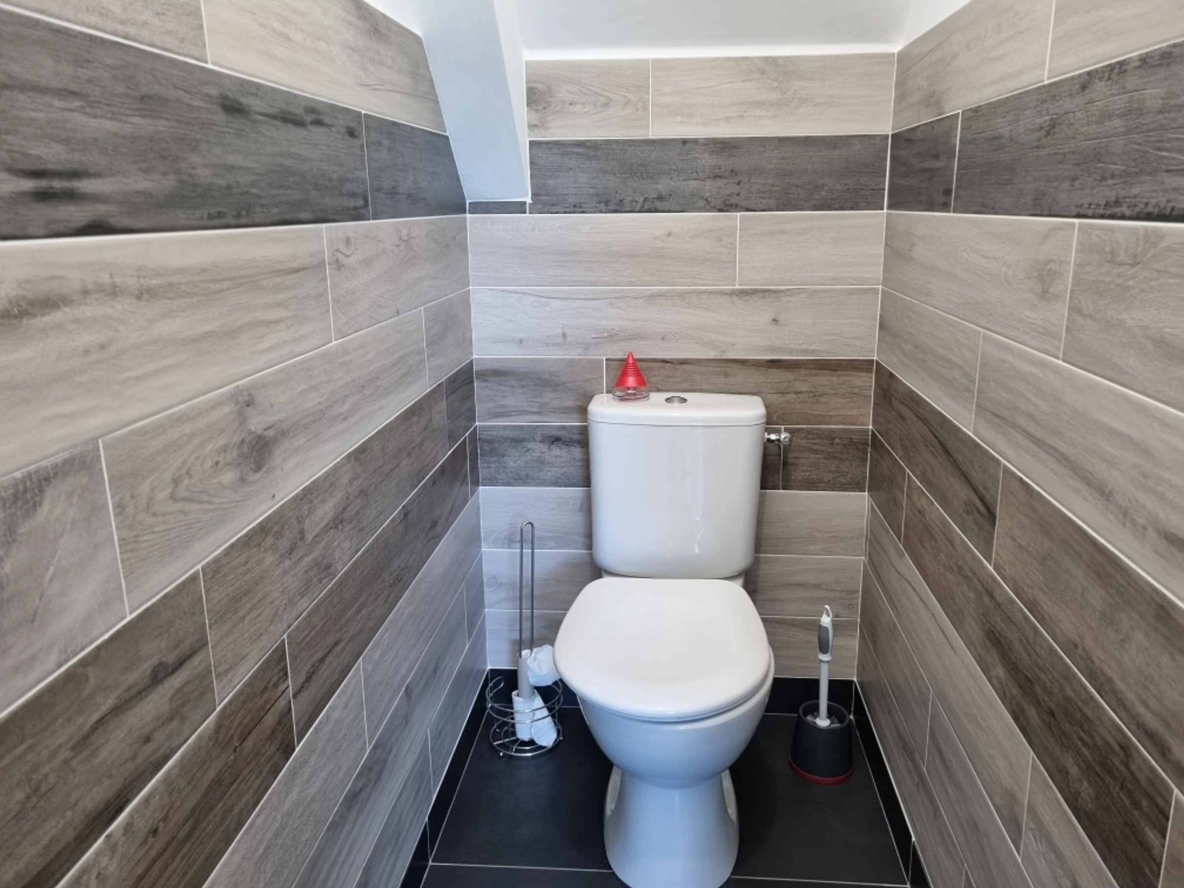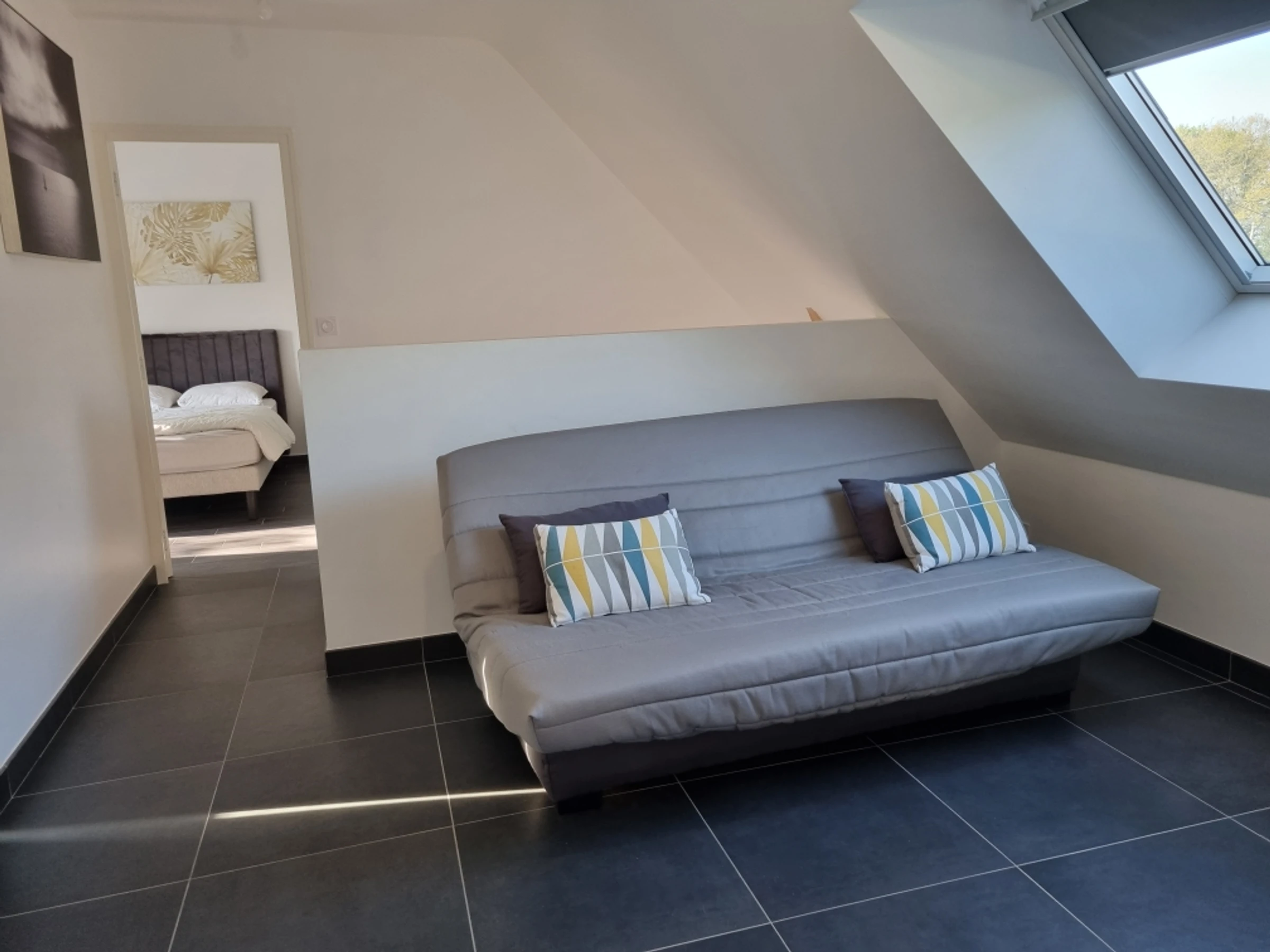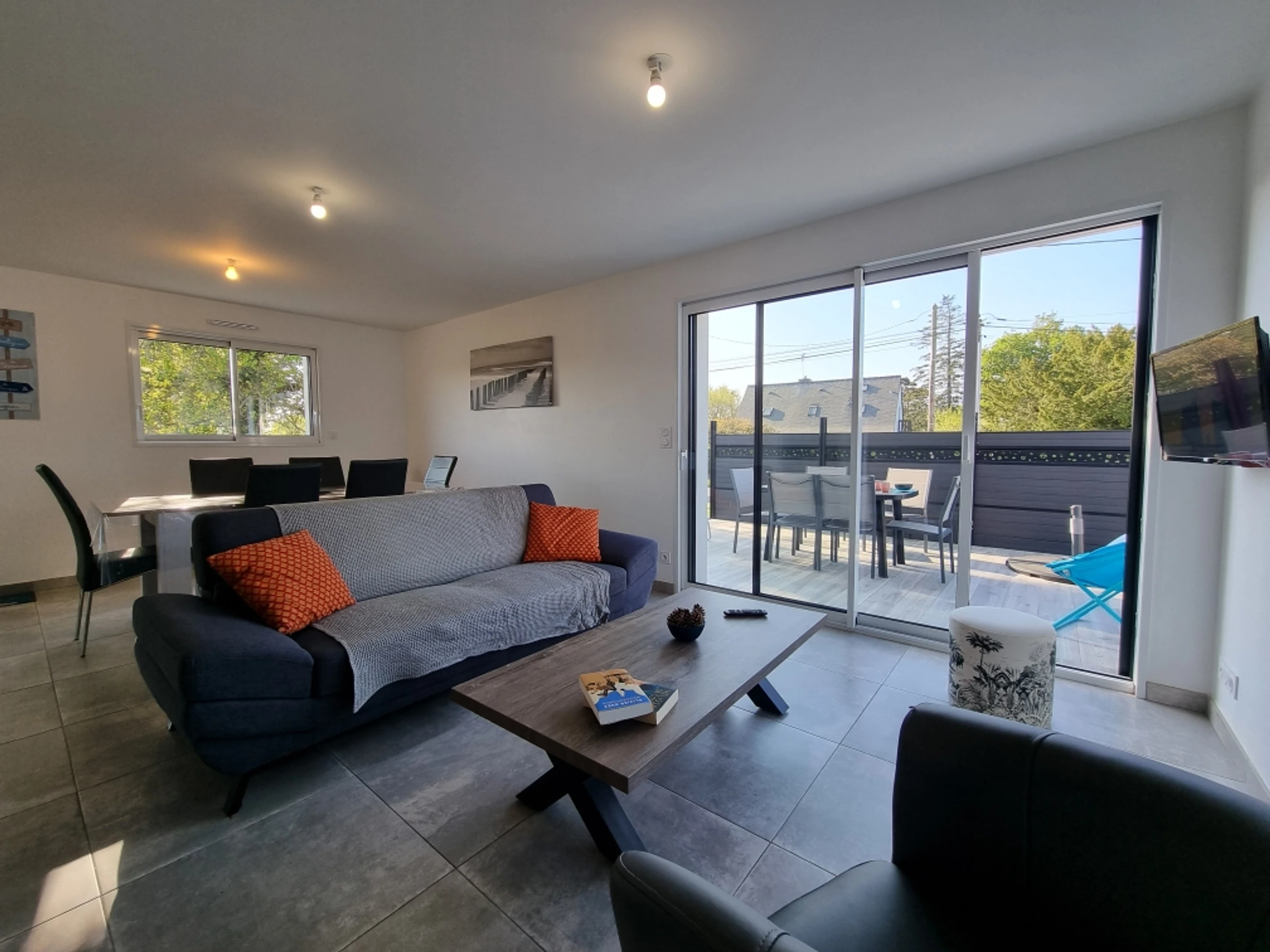Au calme, proche plage, maison récente comprenant au rez-de-chaussée : entrée, séjour-salon avec TV, coin cuisine équipé et aménagé (réfrigérateur avec compartiment congélateur, plaque induction avec 3 feux, four, micro-ondes, lave-vaisselle, cafetière électrique à filtres), toilettes avec lave-mains, 1ère chambre (1 lit 140) avec placard (étagères et penderie) et salle de douche attenante.
