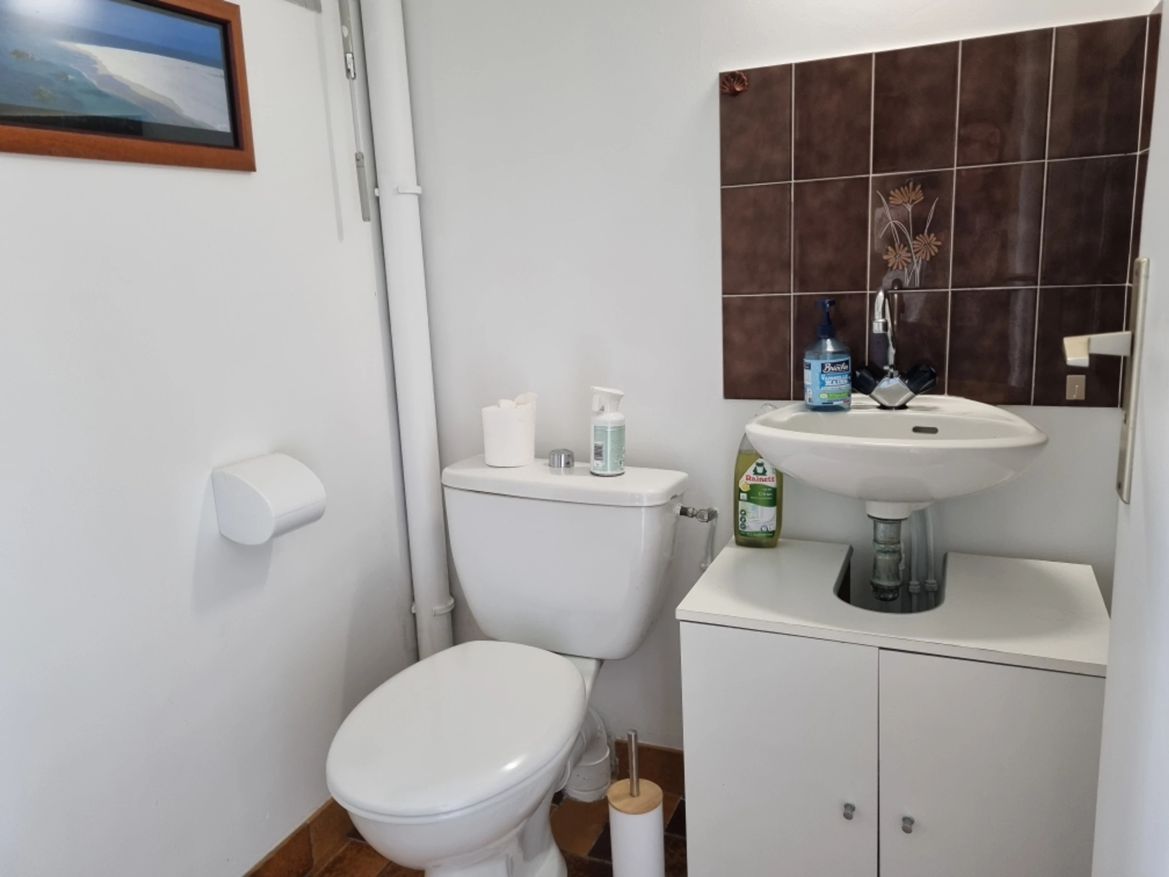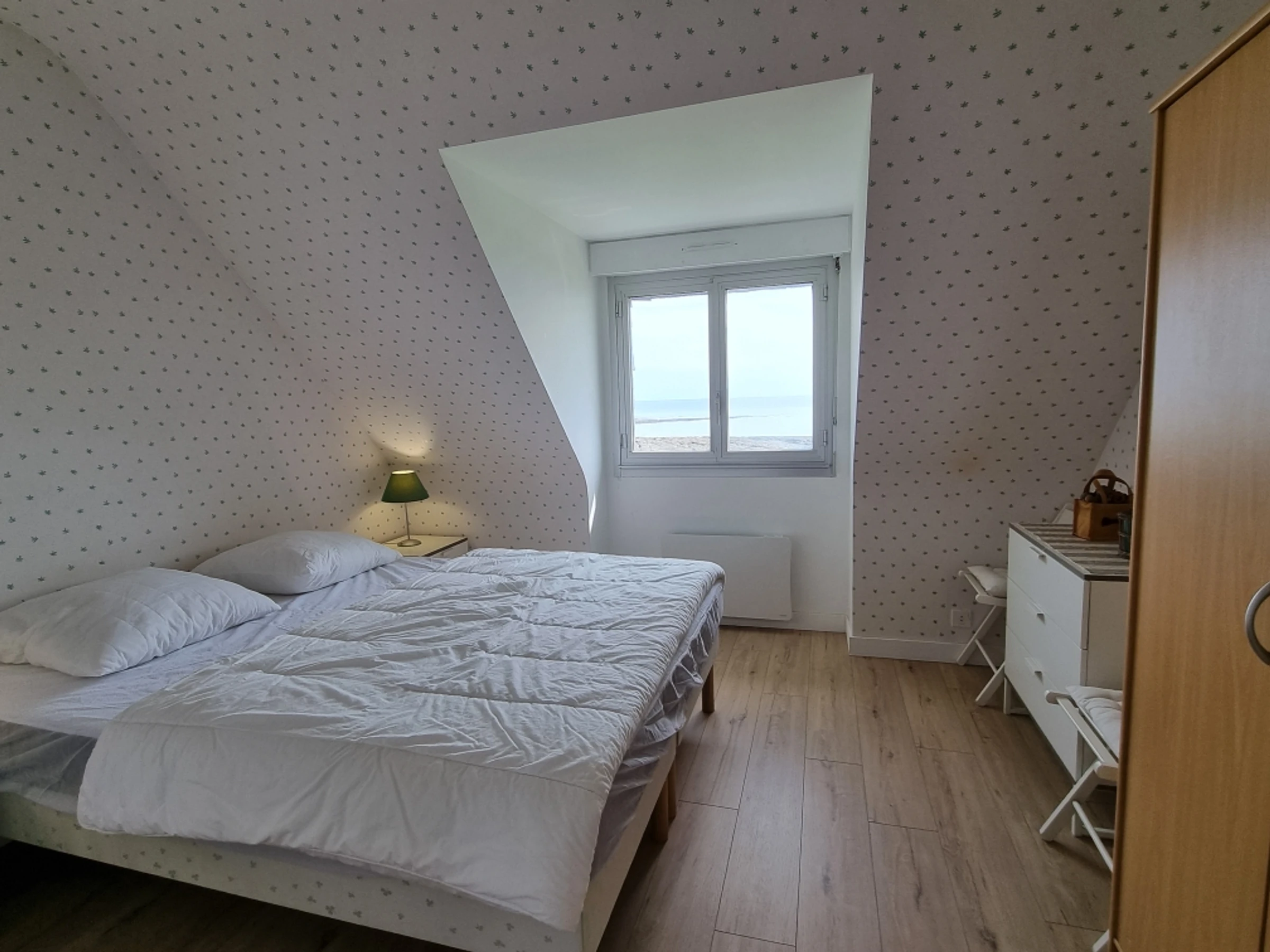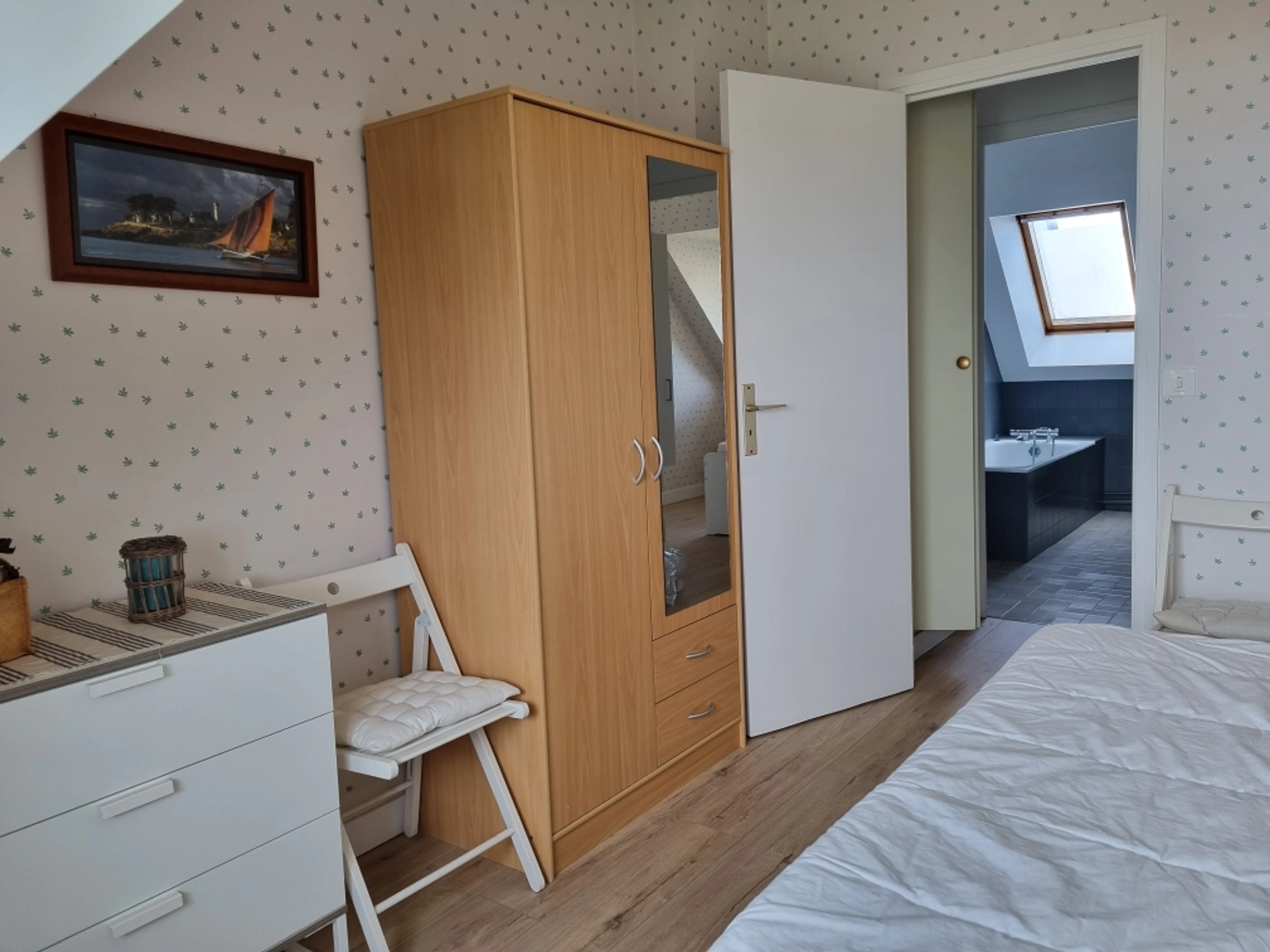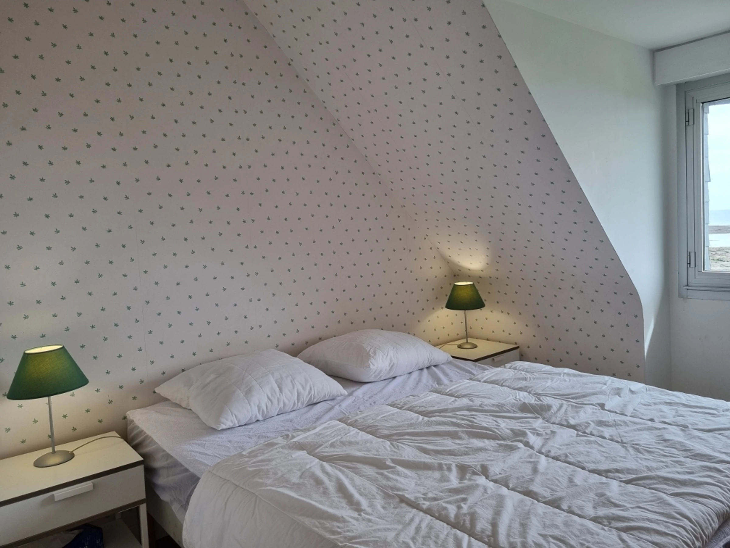 A l'étage : 1ère chambre VUE MER (1 lit 160 avec une armoire penderie), placard sur palier, salle de bains , 2ème chambre (2 lits gigognes soit 2 couchages 90) avec armoire penderie. Parking privé n° 105 (2ème emplacement en arrivant à droite, face porte d'entrée). Local à vélo situé côté parking, à 20 m sur la gauche (bâtiment des Sinagots 2).