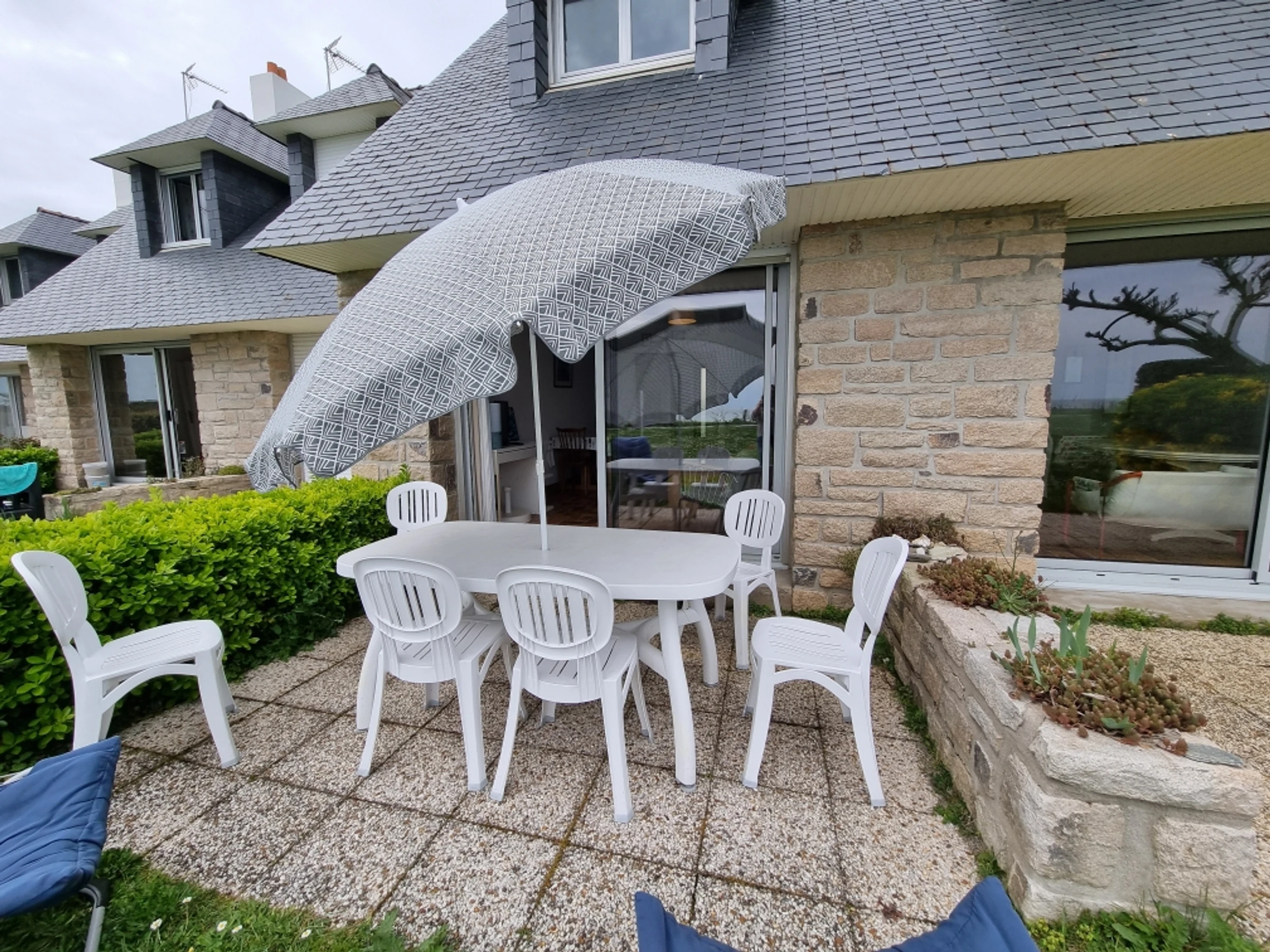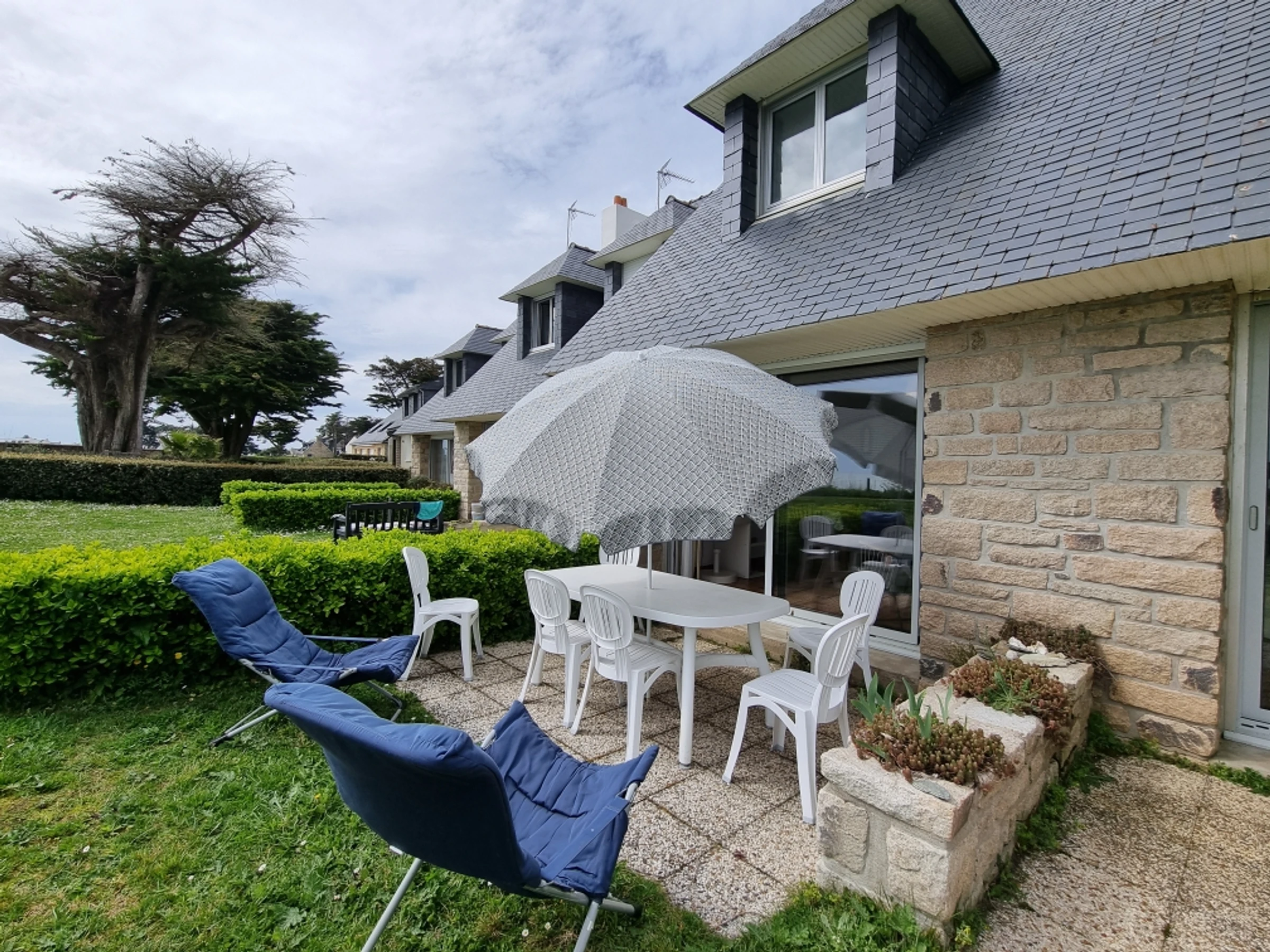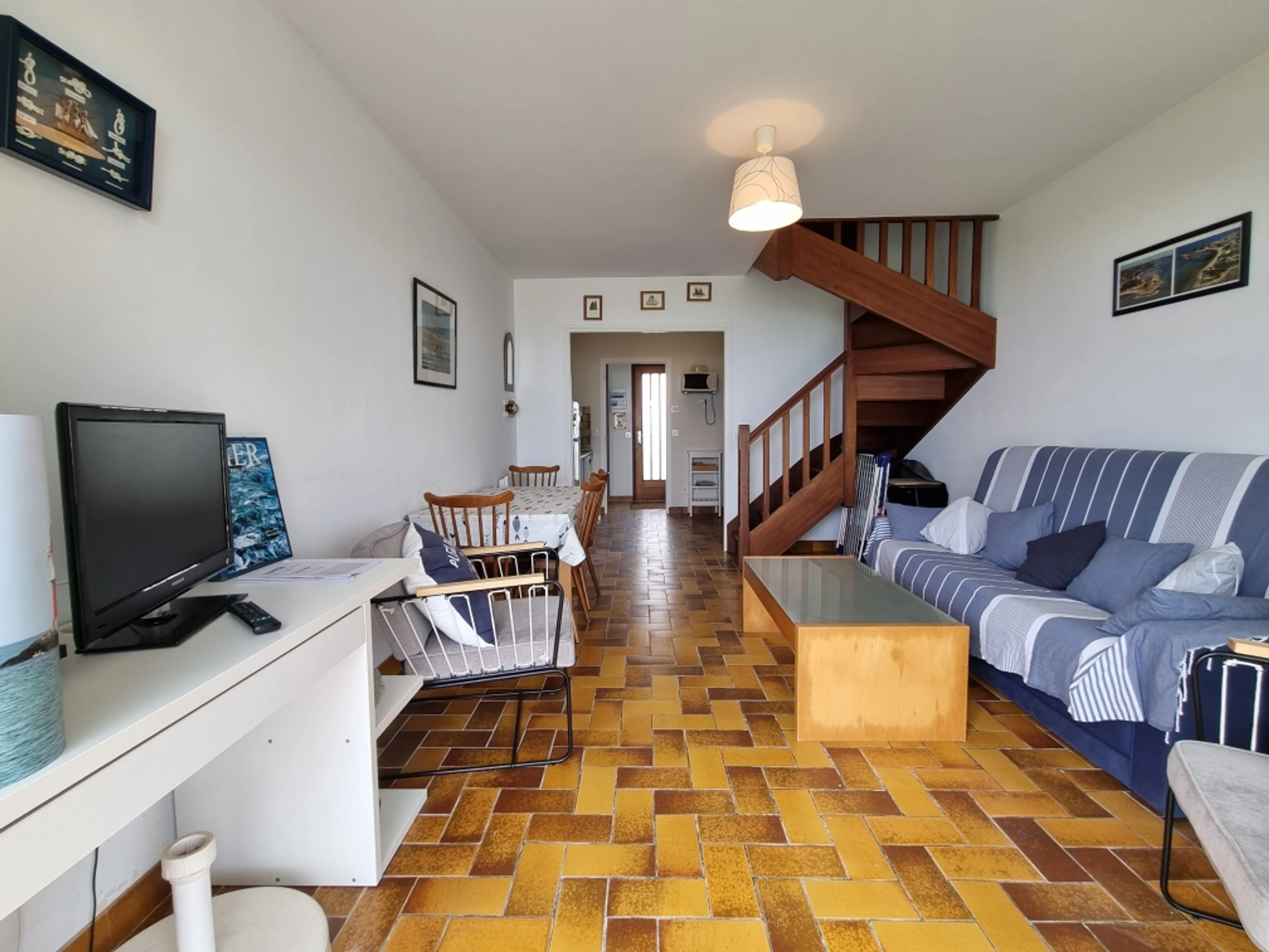 Accès direct mer, dans petite résidence, une maison en duplex d'environ 50 m², comprenant au rez-de-chaussée : Entrée avec placard et lave-linge, toilettes avec lave-mains, cuisine ouverte (réfrigérateur avec compartiment congélateur, lave vaisselle, plaque à induction 4 feux, four, micro-ondes, cafetière électrique à filtres), séjour (TV avec TNT, lecteur CD) avec canapé convertible 140 donnant sur terrasse, non clos, VUE MER. Mobilier de jardin.