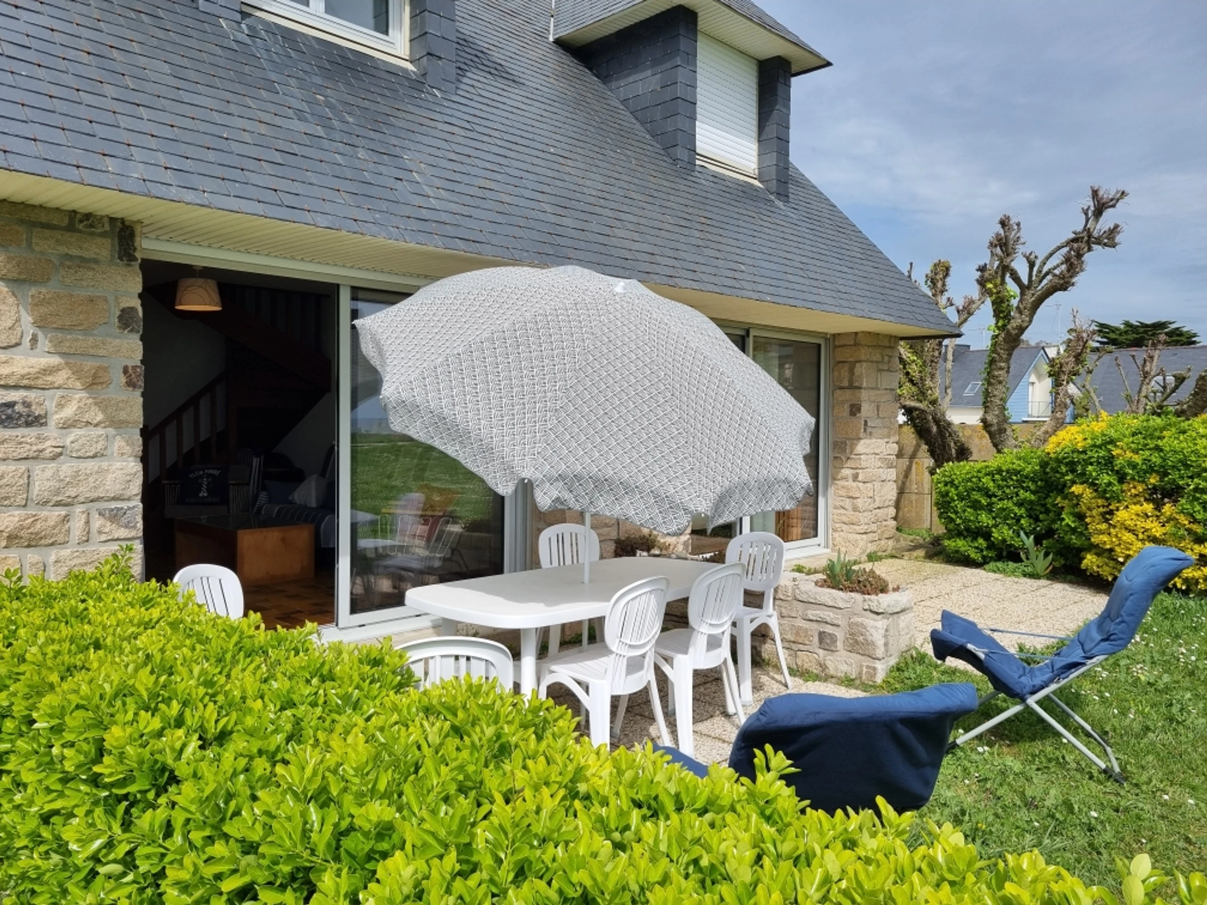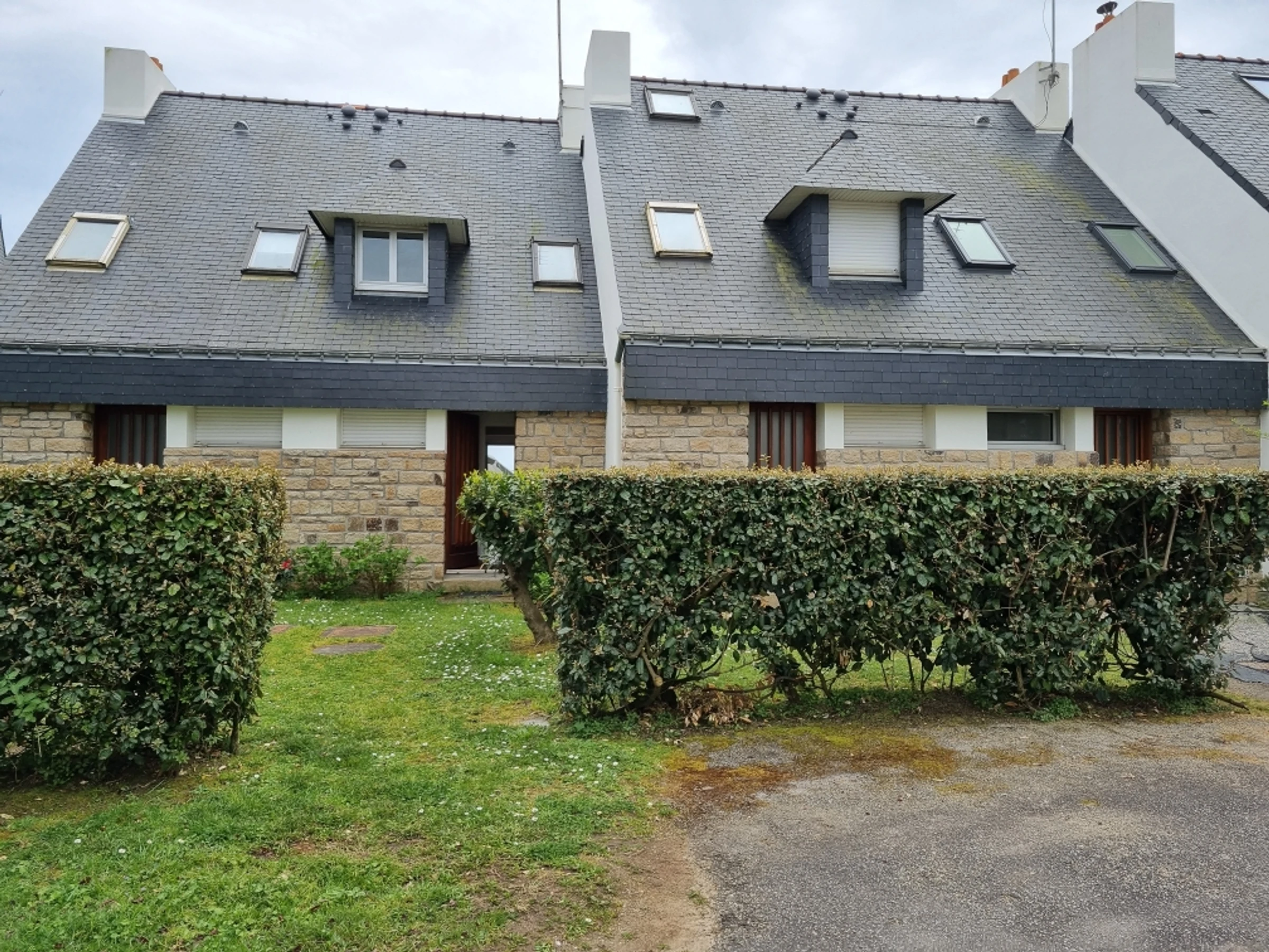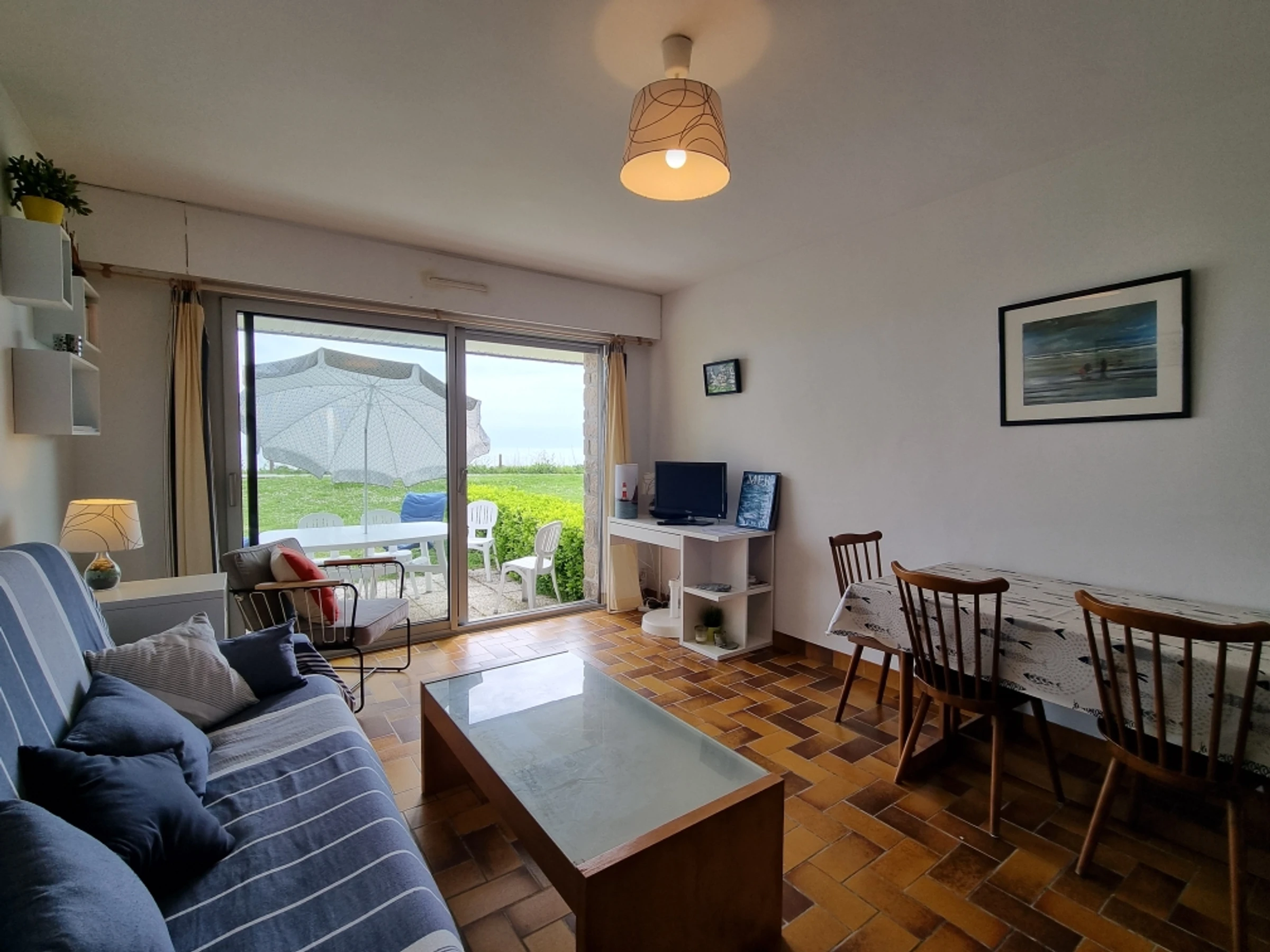 Accès direct mer, dans petite résidence, une maison en duplex d'environ 50 m², comprenant au rez-de-chaussée : Entrée avec placard et lave-linge, toilettes avec lave-mains, cuisine ouverte (réfrigérateur avec compartiment congélateur, lave vaisselle, plaque à induction 4 feux, four, micro-ondes, cafetière électrique à filtres), séjour (TV avec TNT, lecteur CD) avec canapé convertible 140 donnant sur terrasse, non clos, VUE MER. Mobilier de jardin.