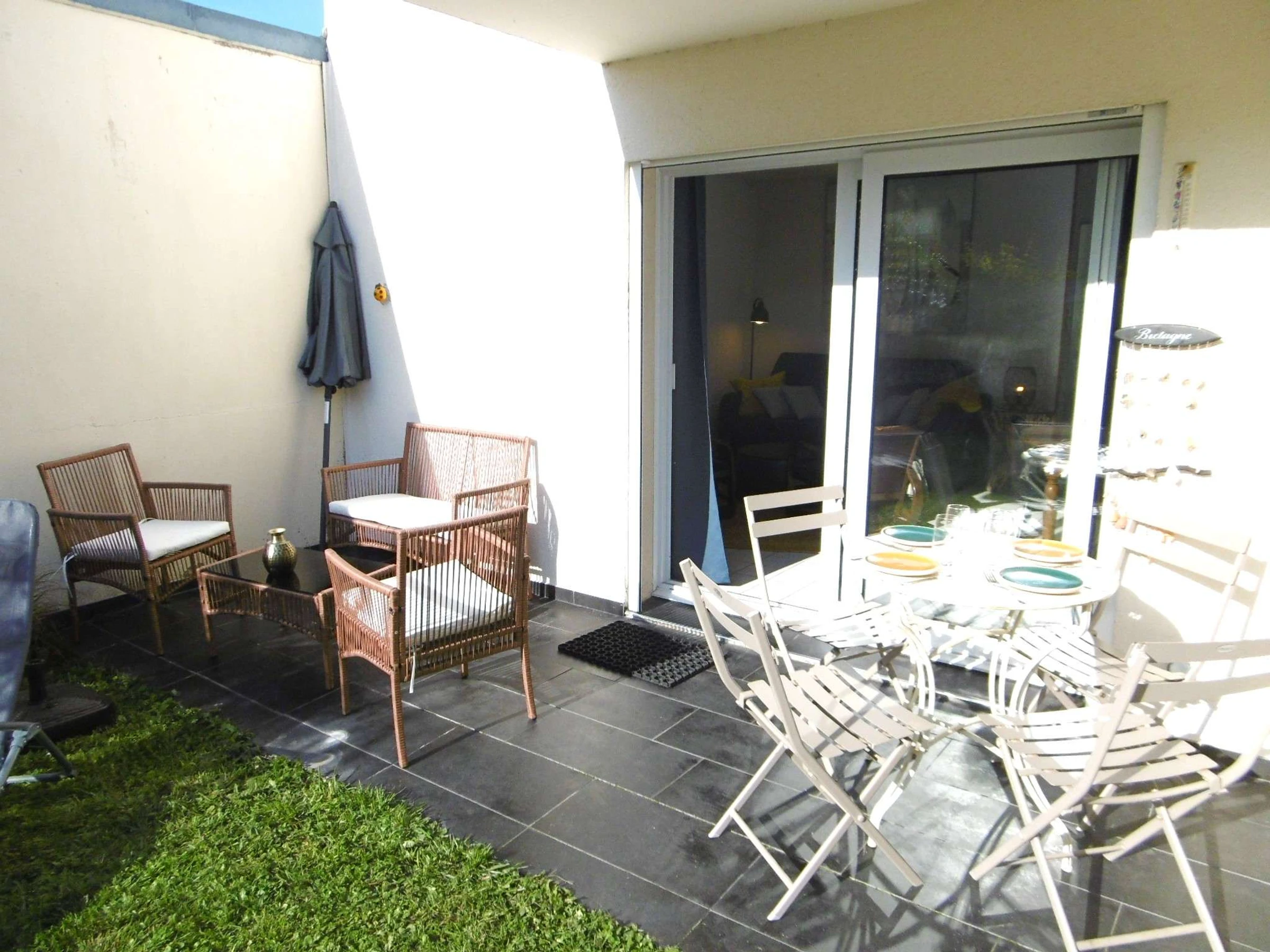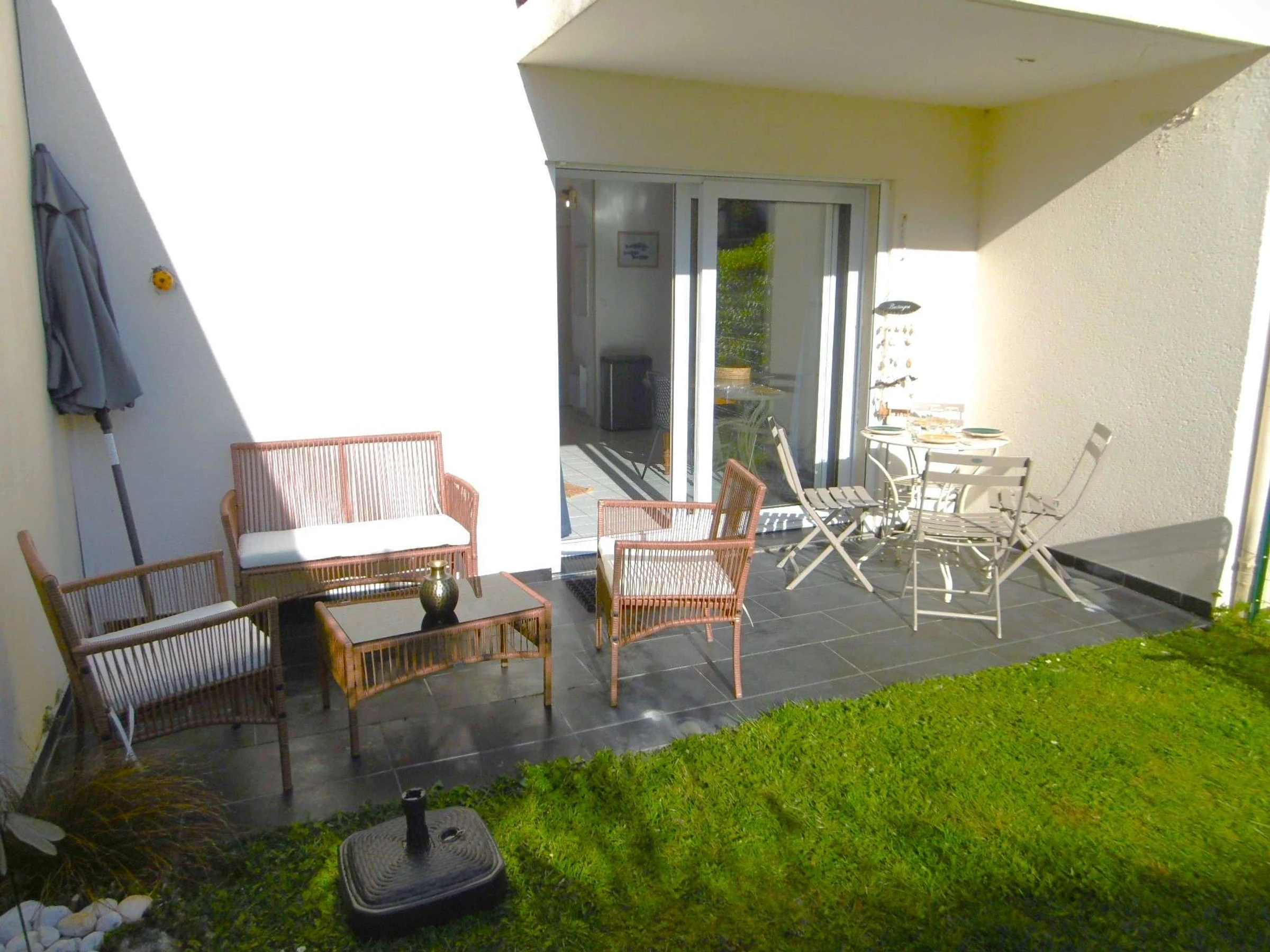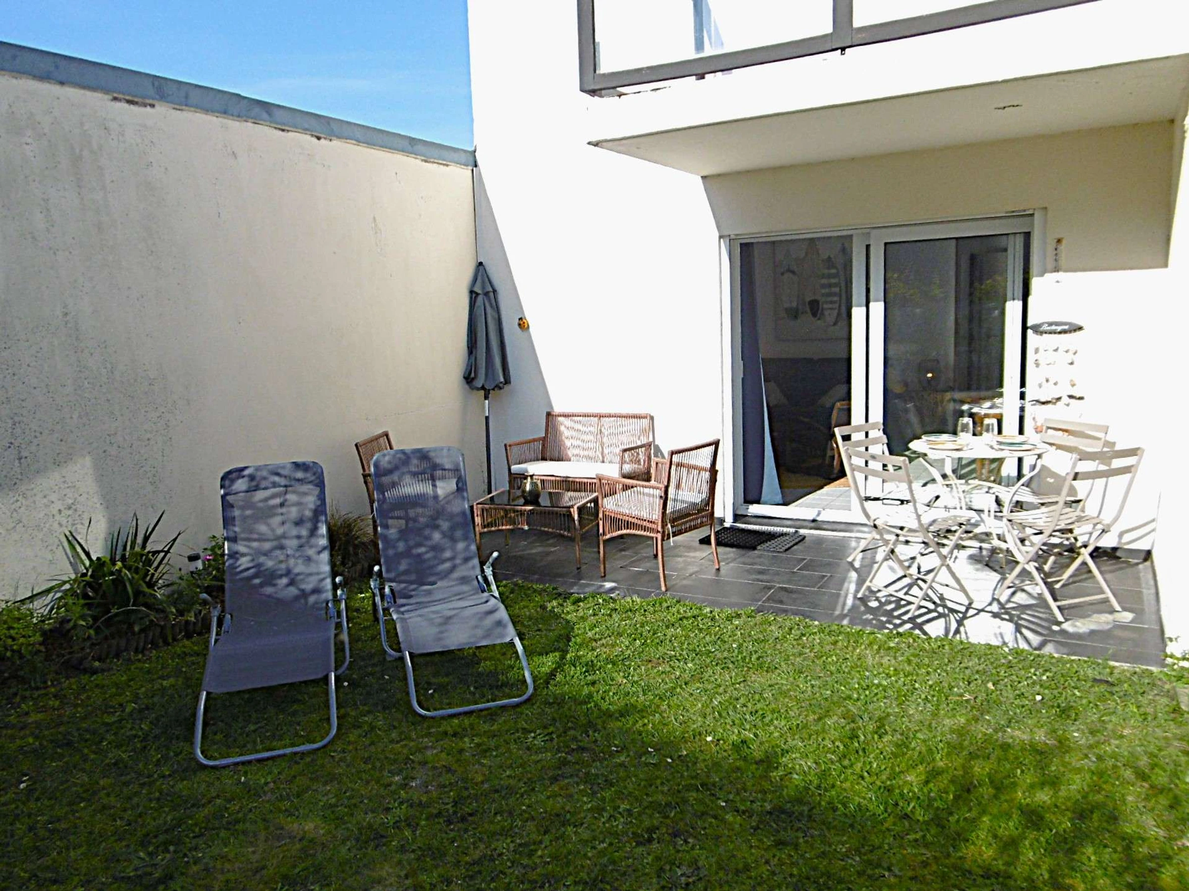 - Jardin clos avec terrasse équipée d'un salon de jardin, de 2 transats et d'un parasol.