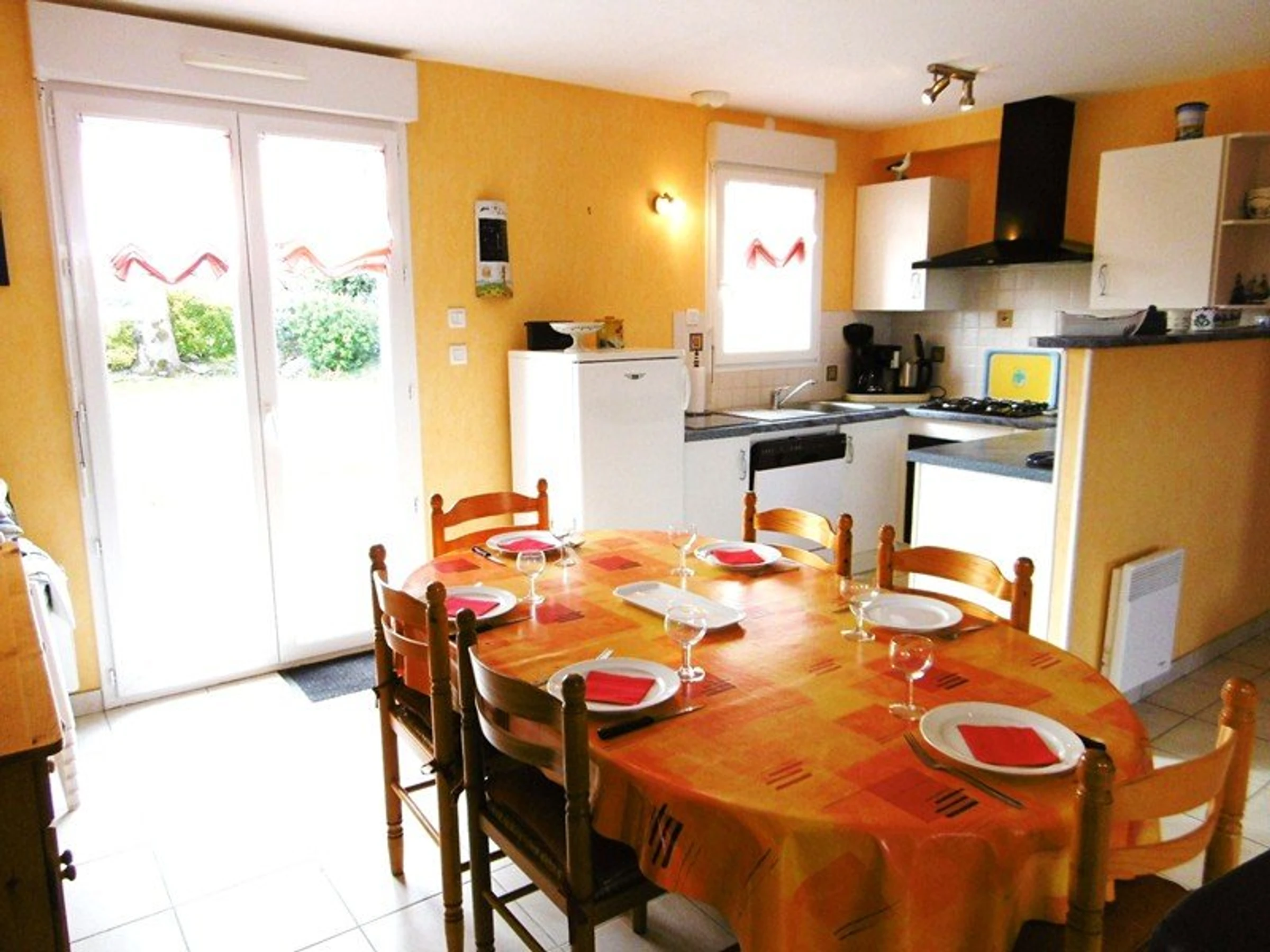 Equipement : réfrigérateur avec partie congélateur, four, micro-ondes, table de cuisson gaz, lave-vaisselle, lave-linge, cafetière, grille-pain, TV.