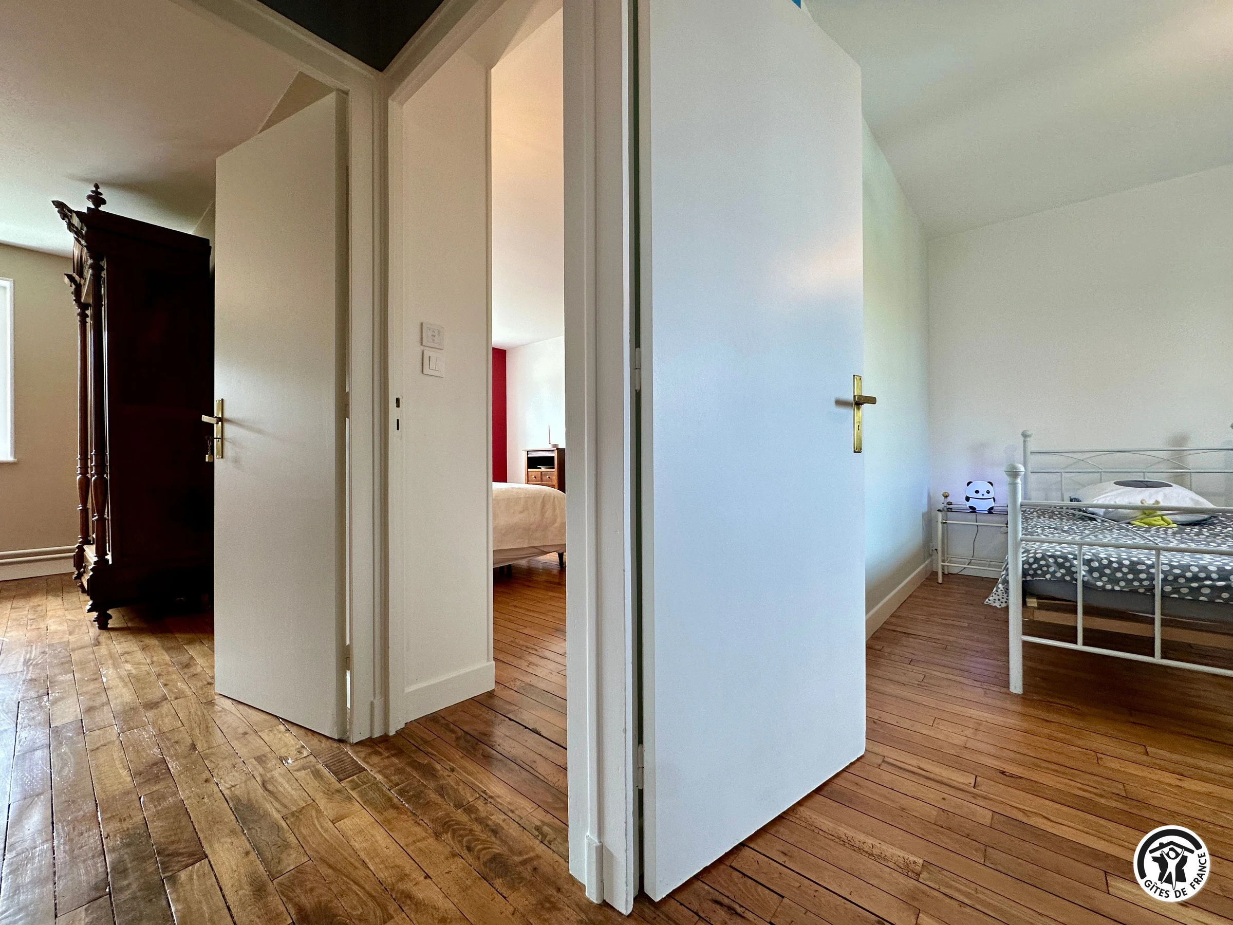 À l’étage : 4 chambres : 1 chambre avec lit double (140 cm), une seconde chambre avec lit 160x200cm et 1 lit simple (80x190 cm), une chambre avec lit 90x190cm et lit bébé à barreaux et une dernière chambre dotée d’un lit 160x200. Une salle d’eau (avec machine à laver), une salle de bain et 1 WC indépendant.