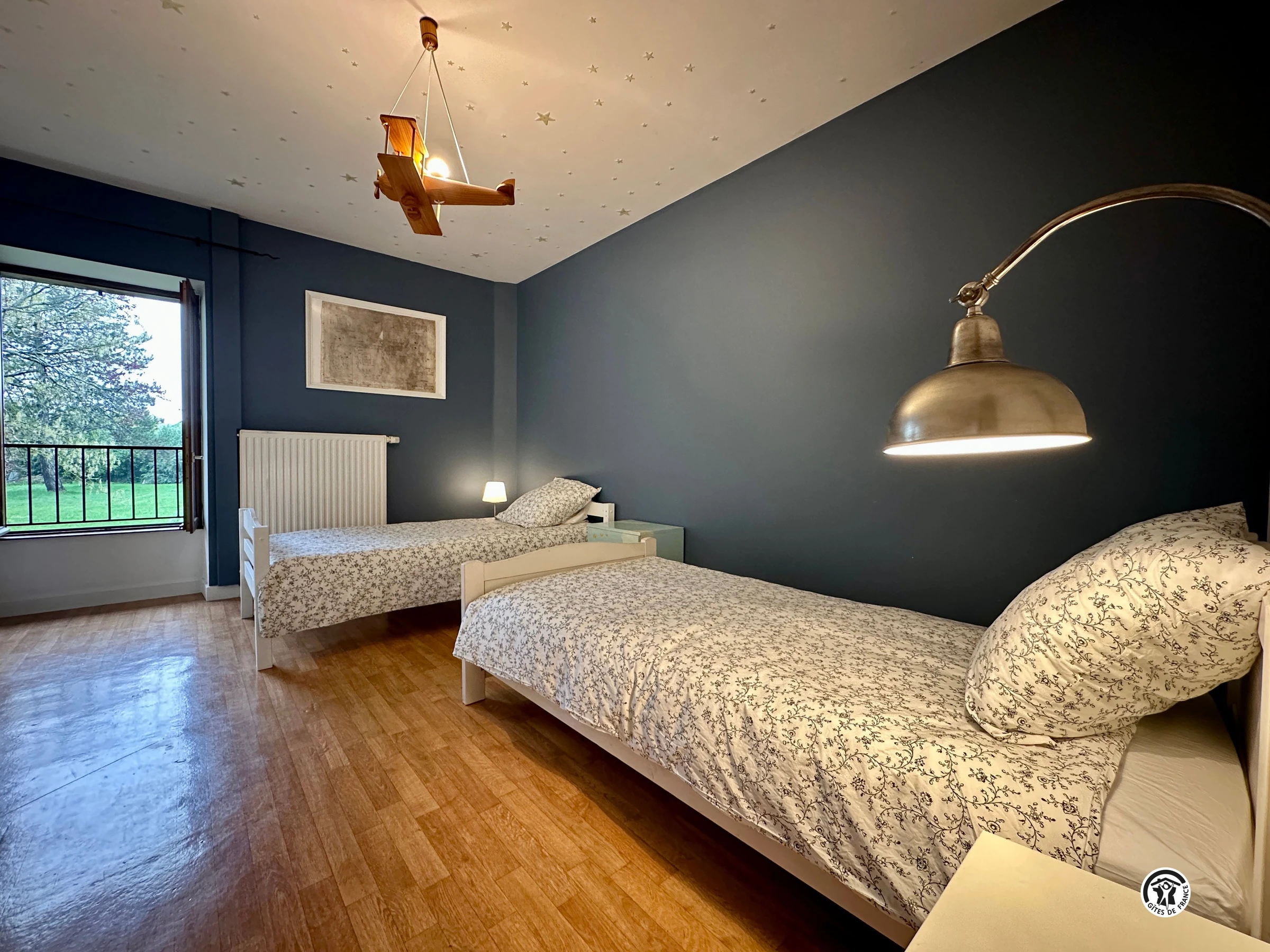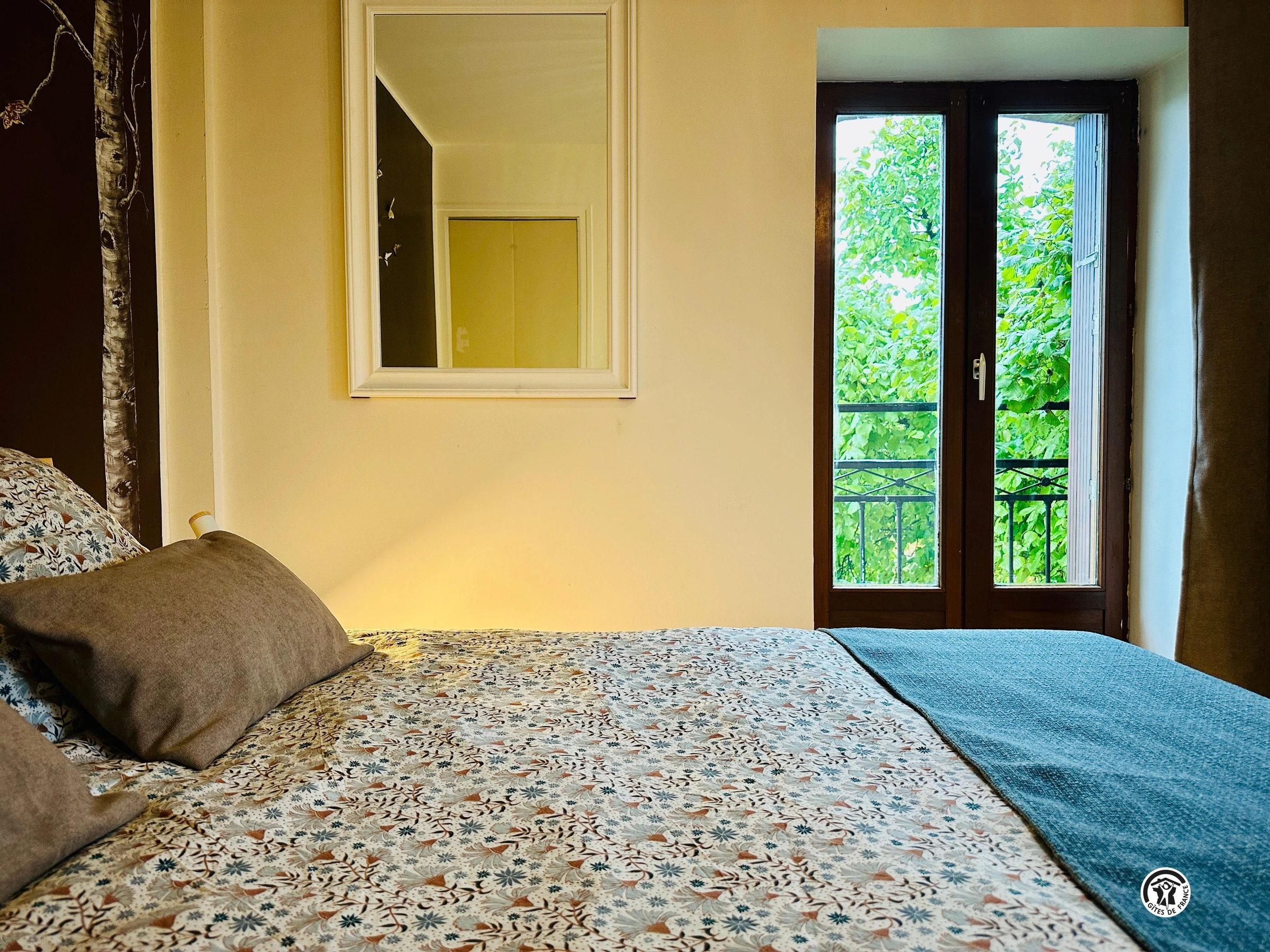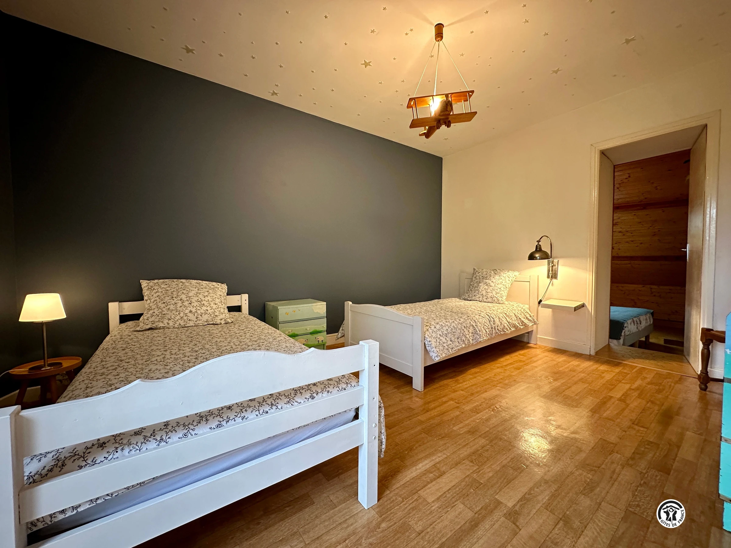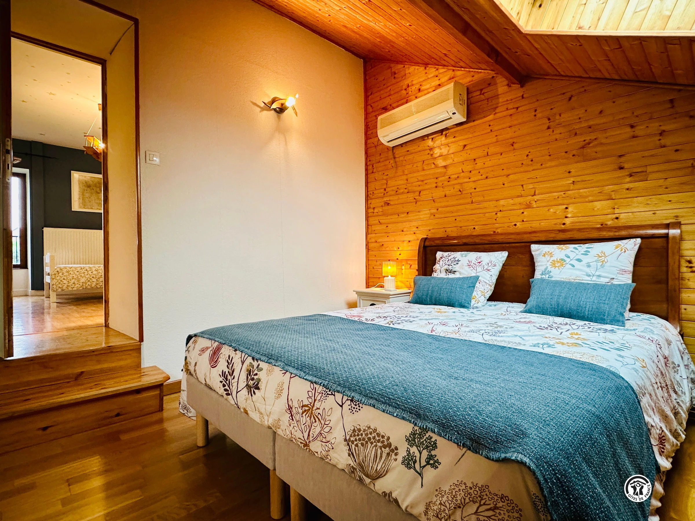 À l’étage, le palier distribue : une chambre avec un lit double de 140 x 190cm, une salle d’eau avec douche et WC. Une deuxième chambre avec deux lits simples (90 x 190 cm), que l’on traverse pour accéder à une grande chambre mansardée climatisée dotée d’un coin nuit avec un lit double (160 cm) et d’un coin bibliothèque / salle de jeux (séparé par un rideau) équipé d’un clic-clac (couchage supplémentaire 15 €/nuit/pax).