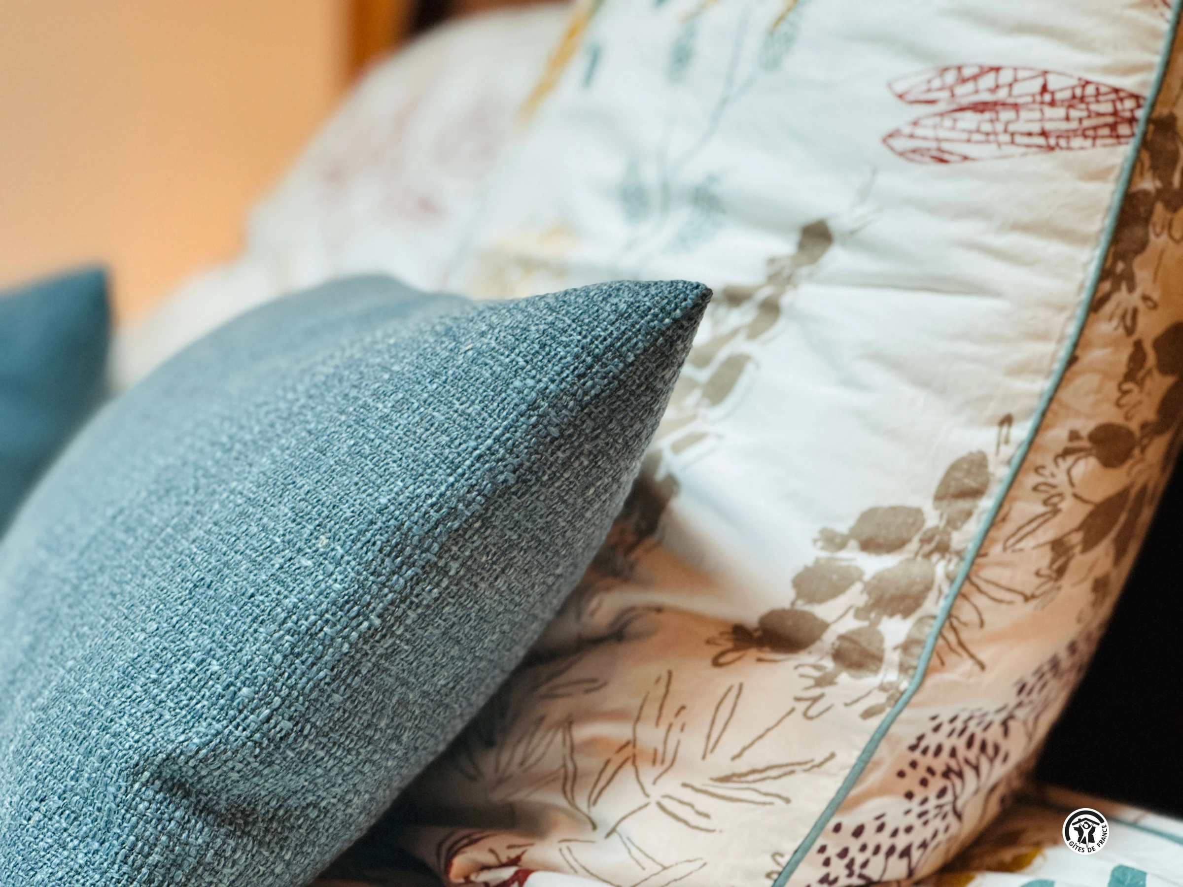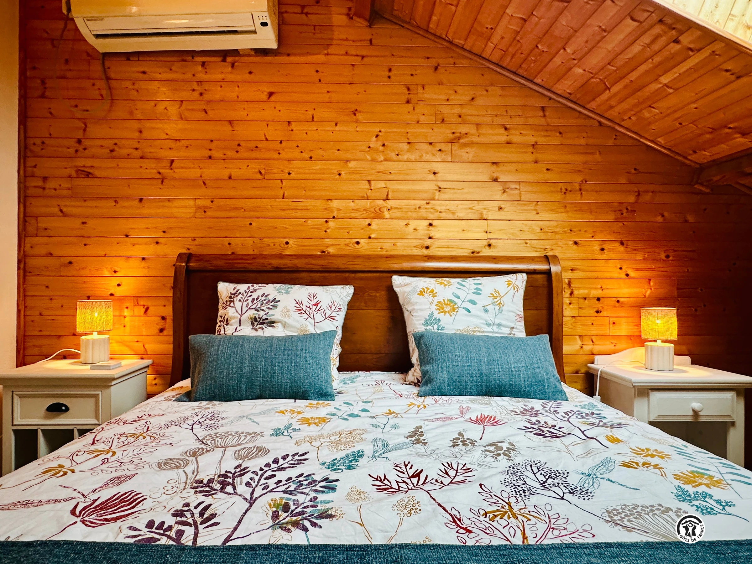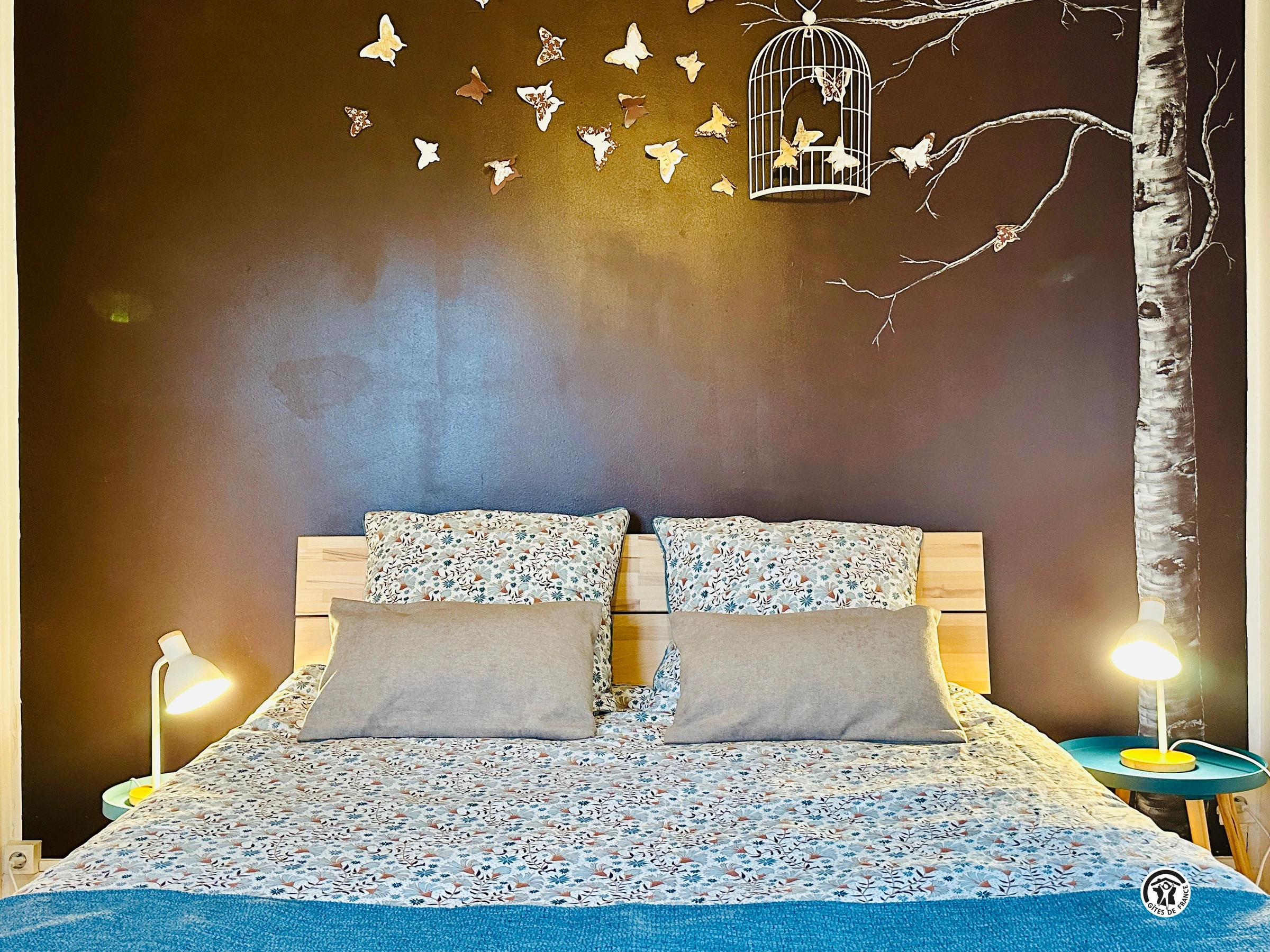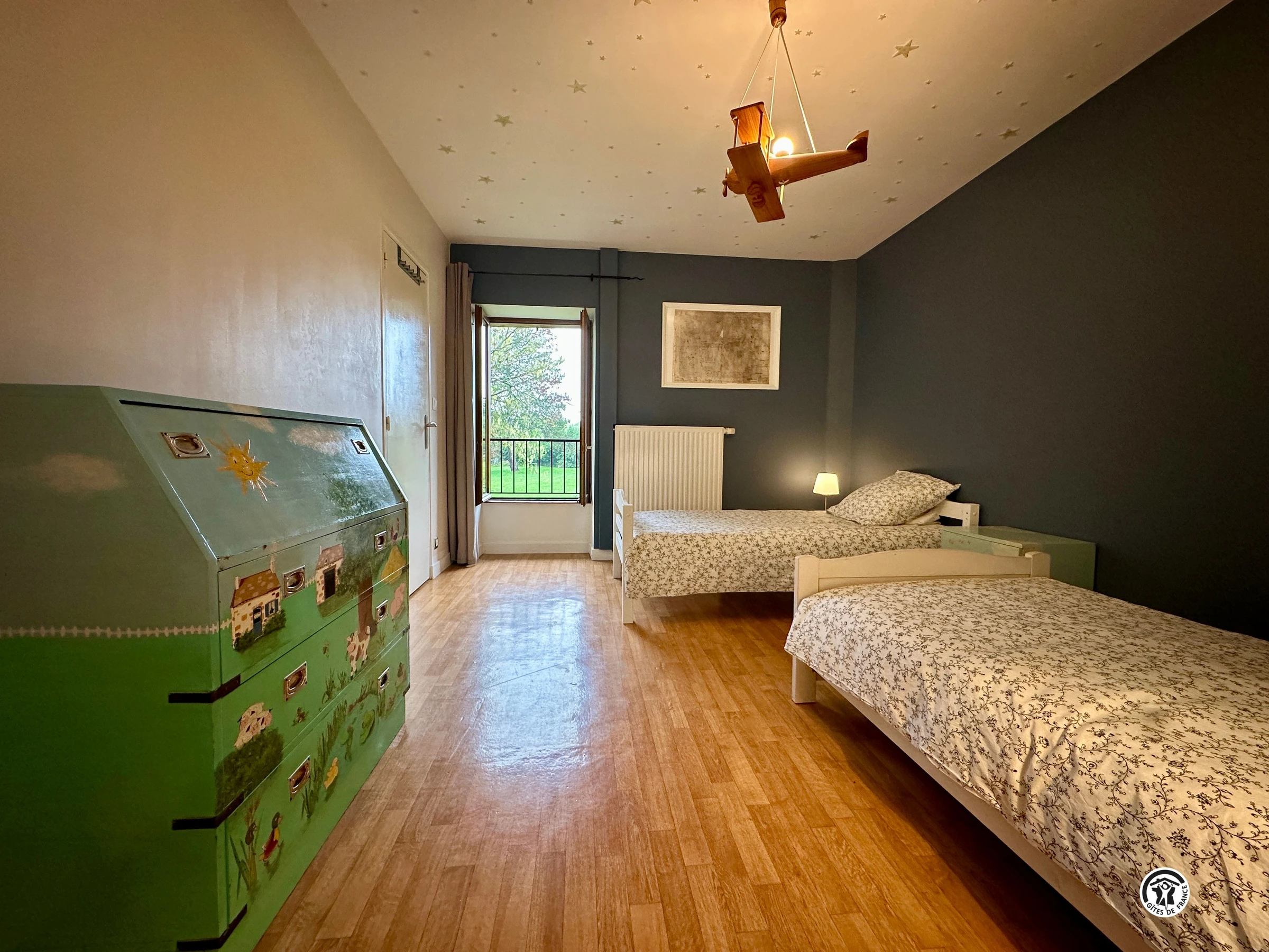À l’étage, le palier distribue : une chambre avec un lit double de 140 x 190cm, une salle d’eau avec douche et WC. Une deuxième chambre avec deux lits simples (90 x 190 cm), que l’on traverse pour accéder à une grande chambre mansardée climatisée dotée d’un coin nuit avec un lit double (160 cm) et d’un coin bibliothèque / salle de jeux (séparé par un rideau) équipé d’un clic-clac (couchage supplémentaire 15 €/nuit/pax).