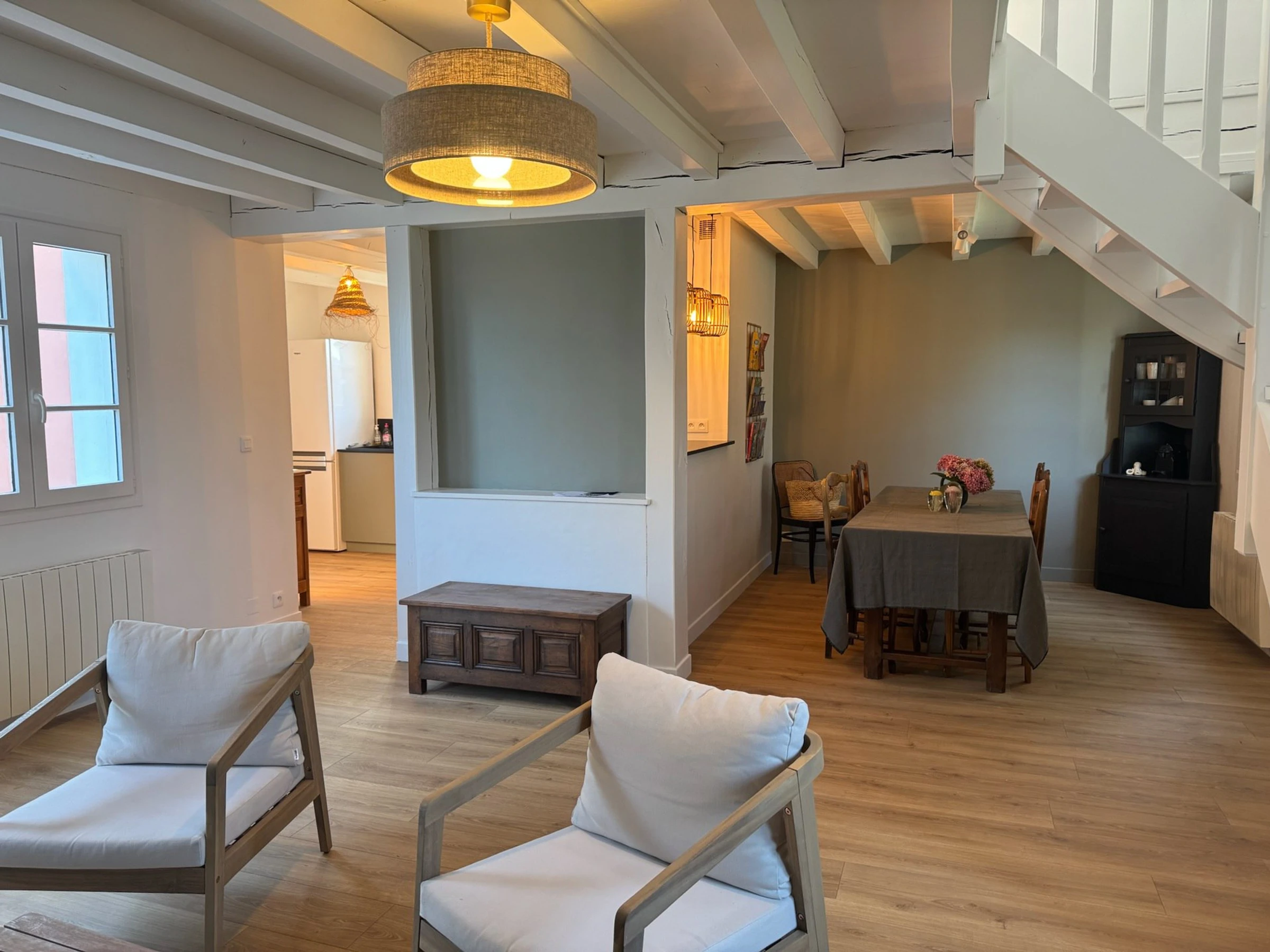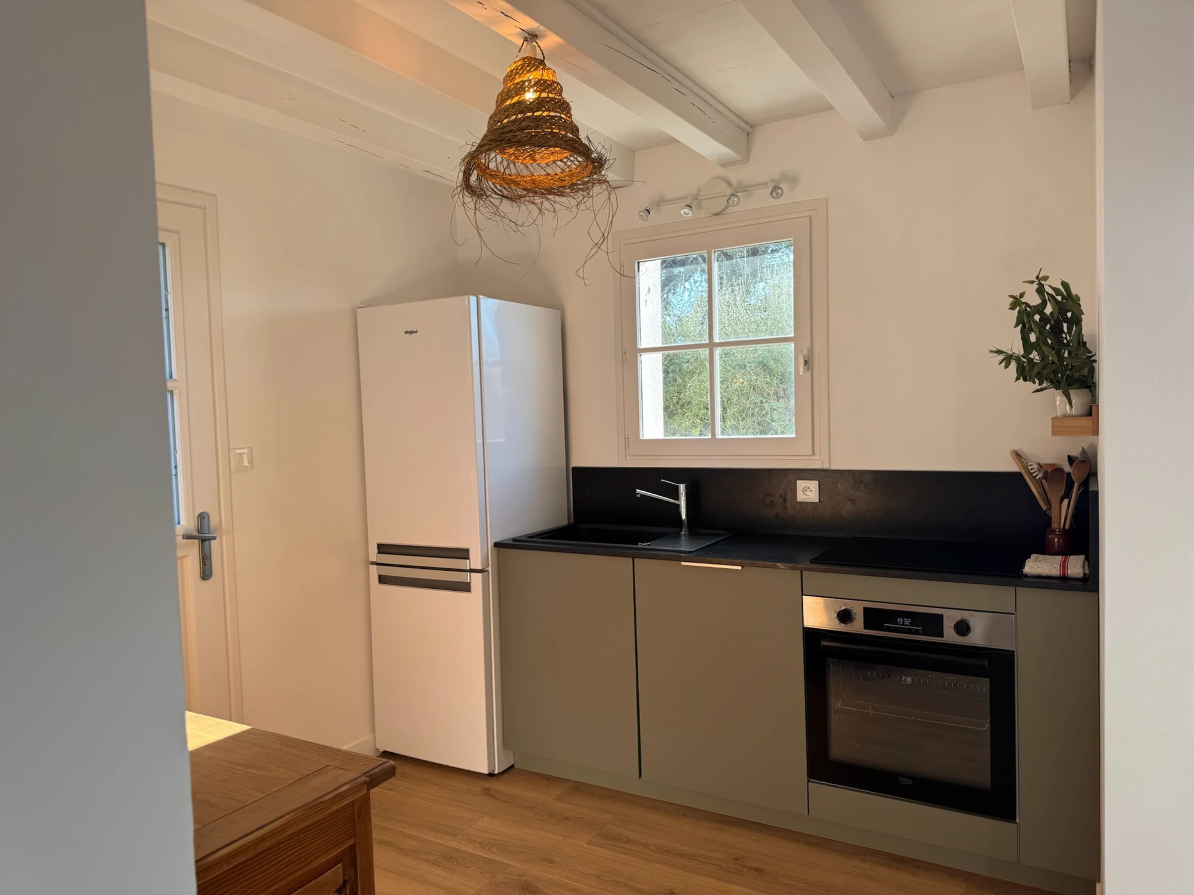 - Une cuisine ouverte (9 m²) avec plaques à induction, lave-vaisselle, réfrigérateur, cafetière + nespresso. chaise bébé dans le garage.