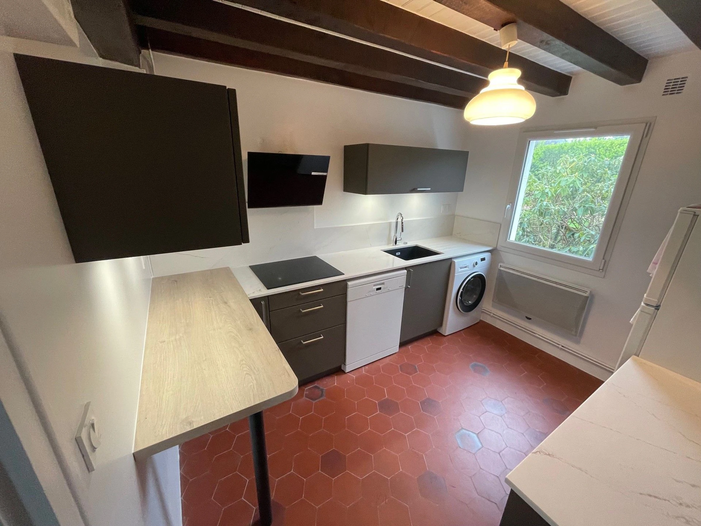 - Une cuisine (8m²) séparée avec réfrigérateur avec compartiment congélateur, four, micro ondes, plaques vitrocéramique, lave-linge, lave-vaisselle, hotte, cafetière filtre, grille-pain, boulloire.