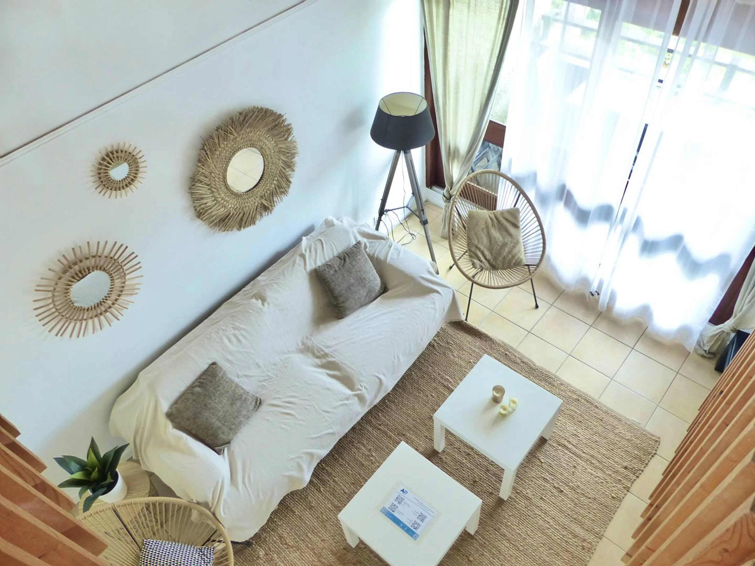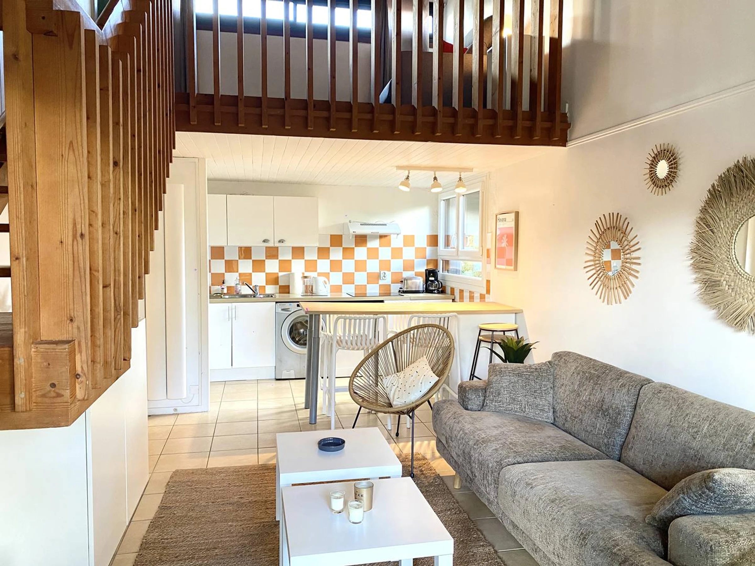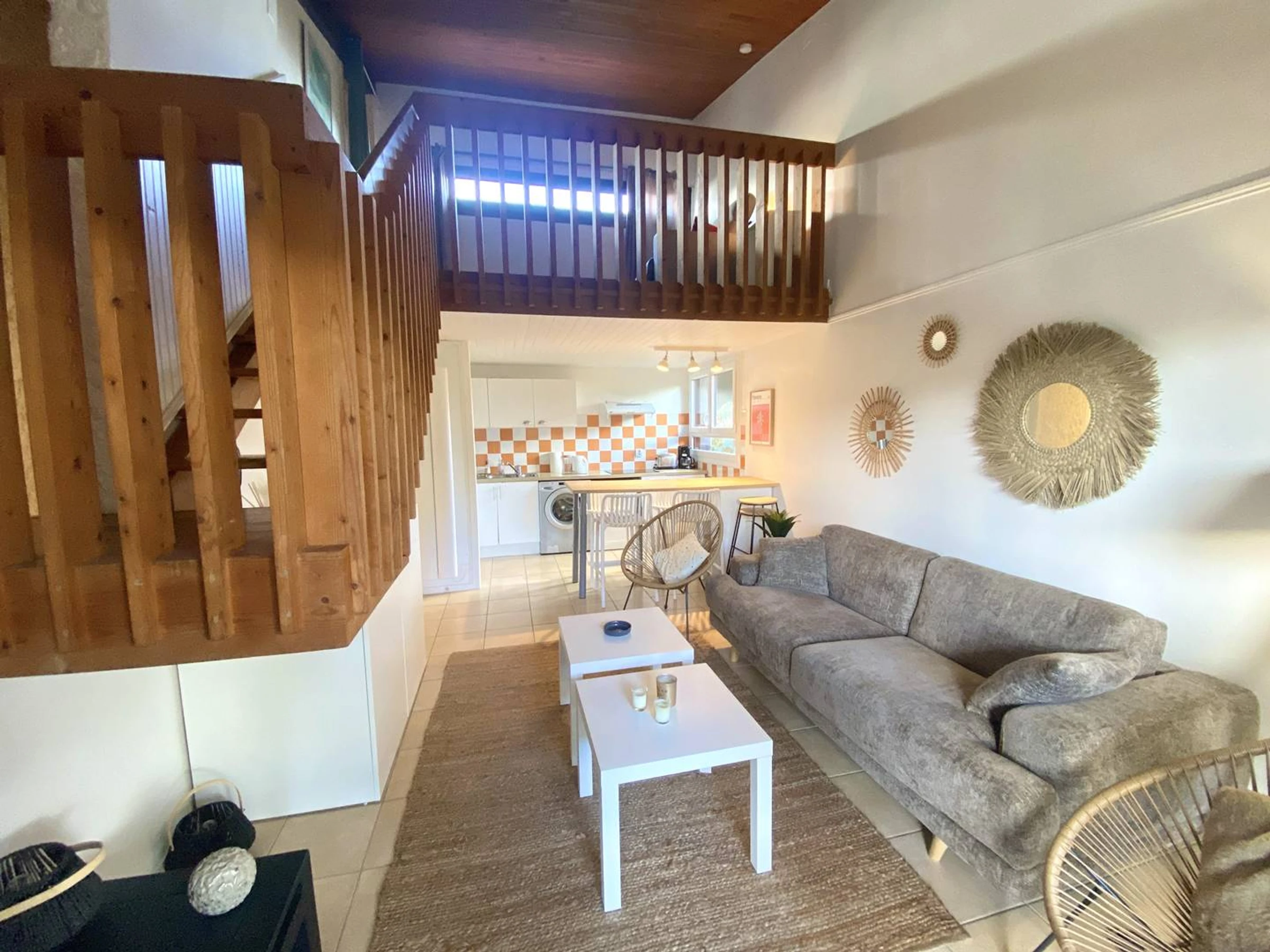 Escalier intérieur menant à une grande mezzanine de 10.5 m2 environ, 1 espace chambre avec 1 lit en 140 et au dessu du séjour en mezzanine un canapé-lit convertible en 140.