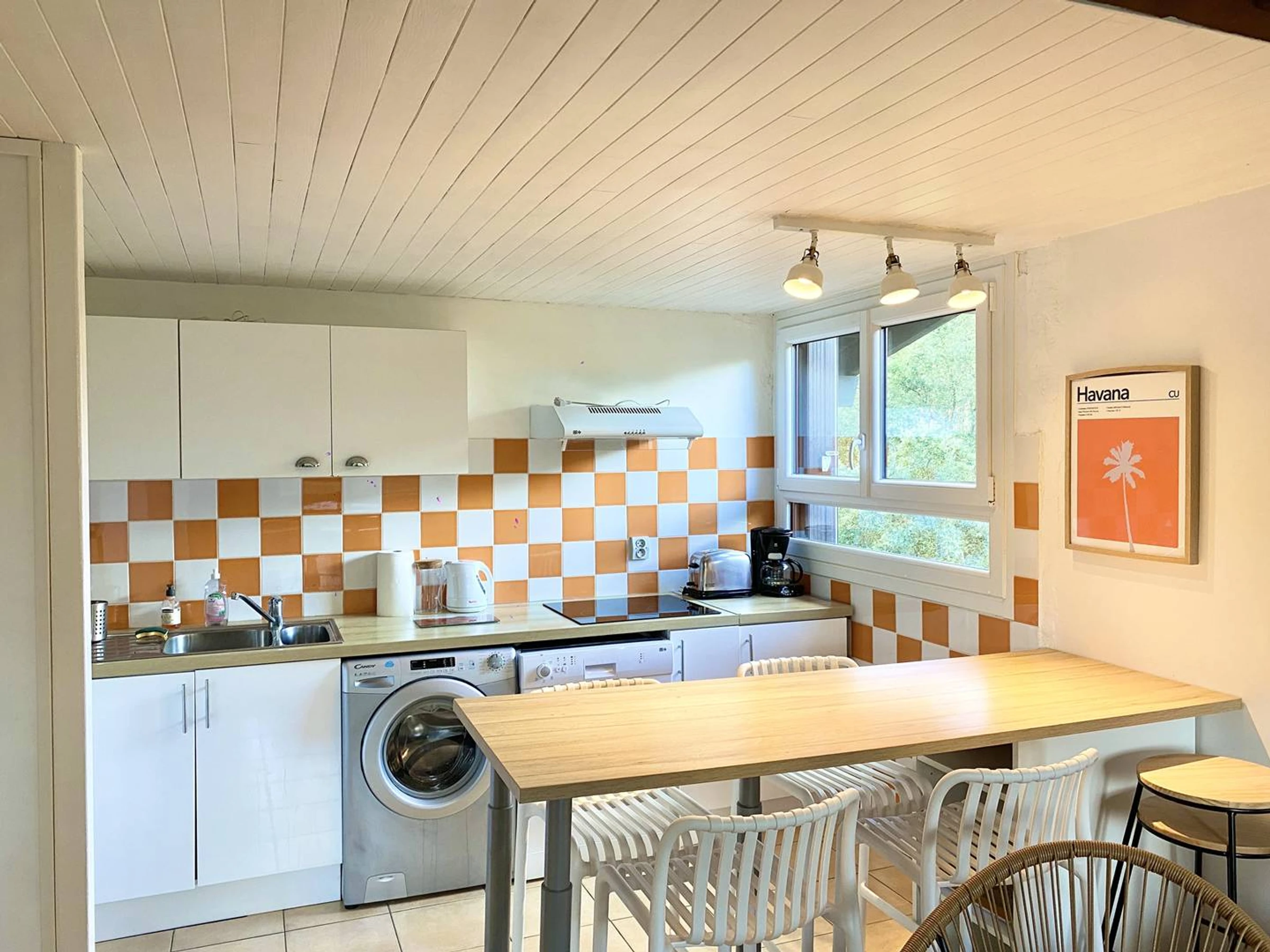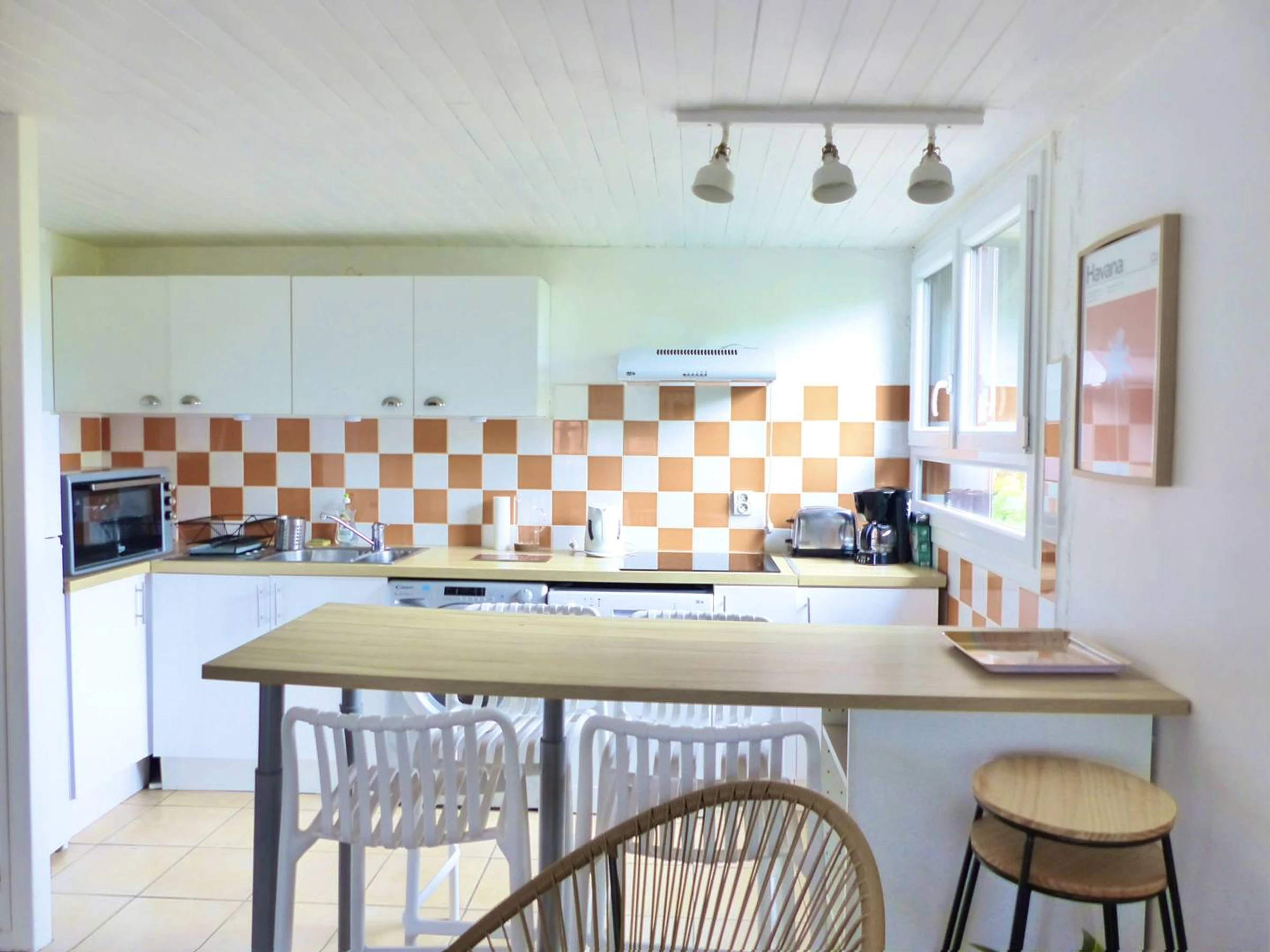 Cuisine aménagée: réfrigérateur-congélateur, lave-linge, lave-vaisselle, plaque vitrocéramique et four.