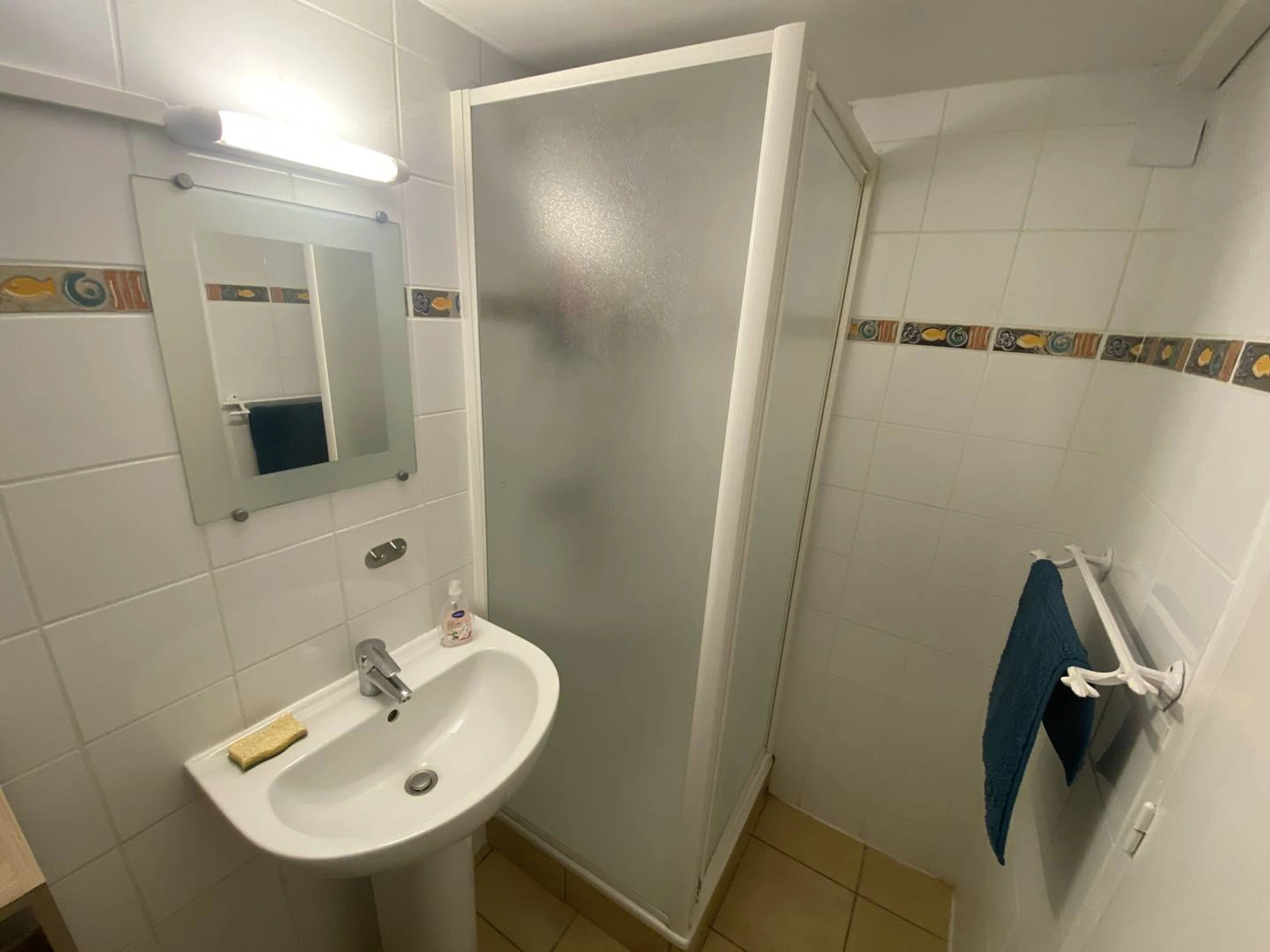 Salle de douche: vasque et douche. WC.