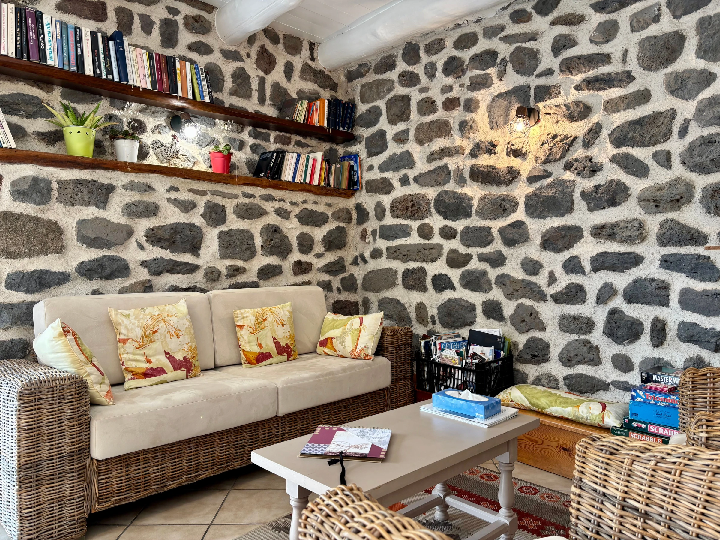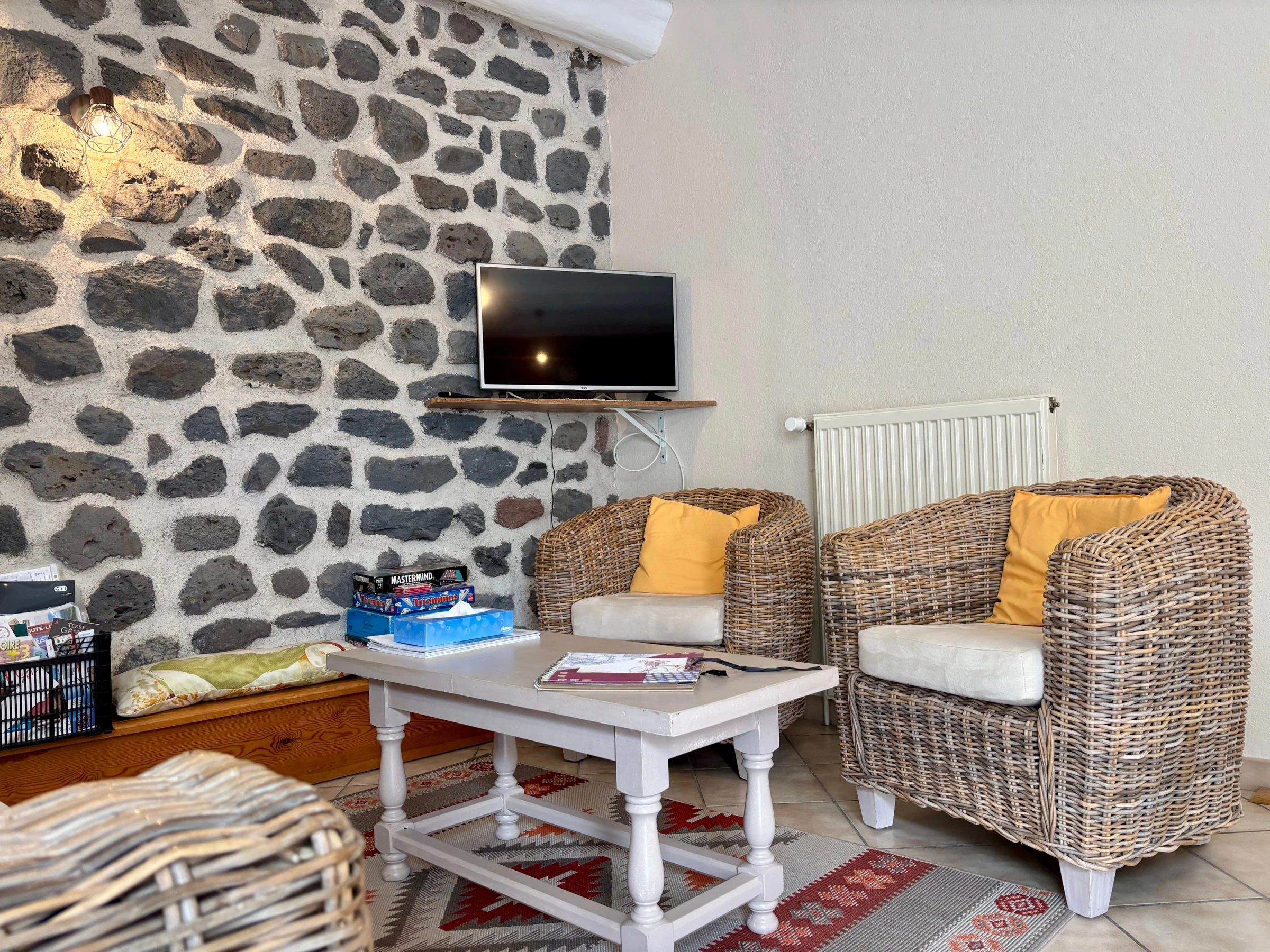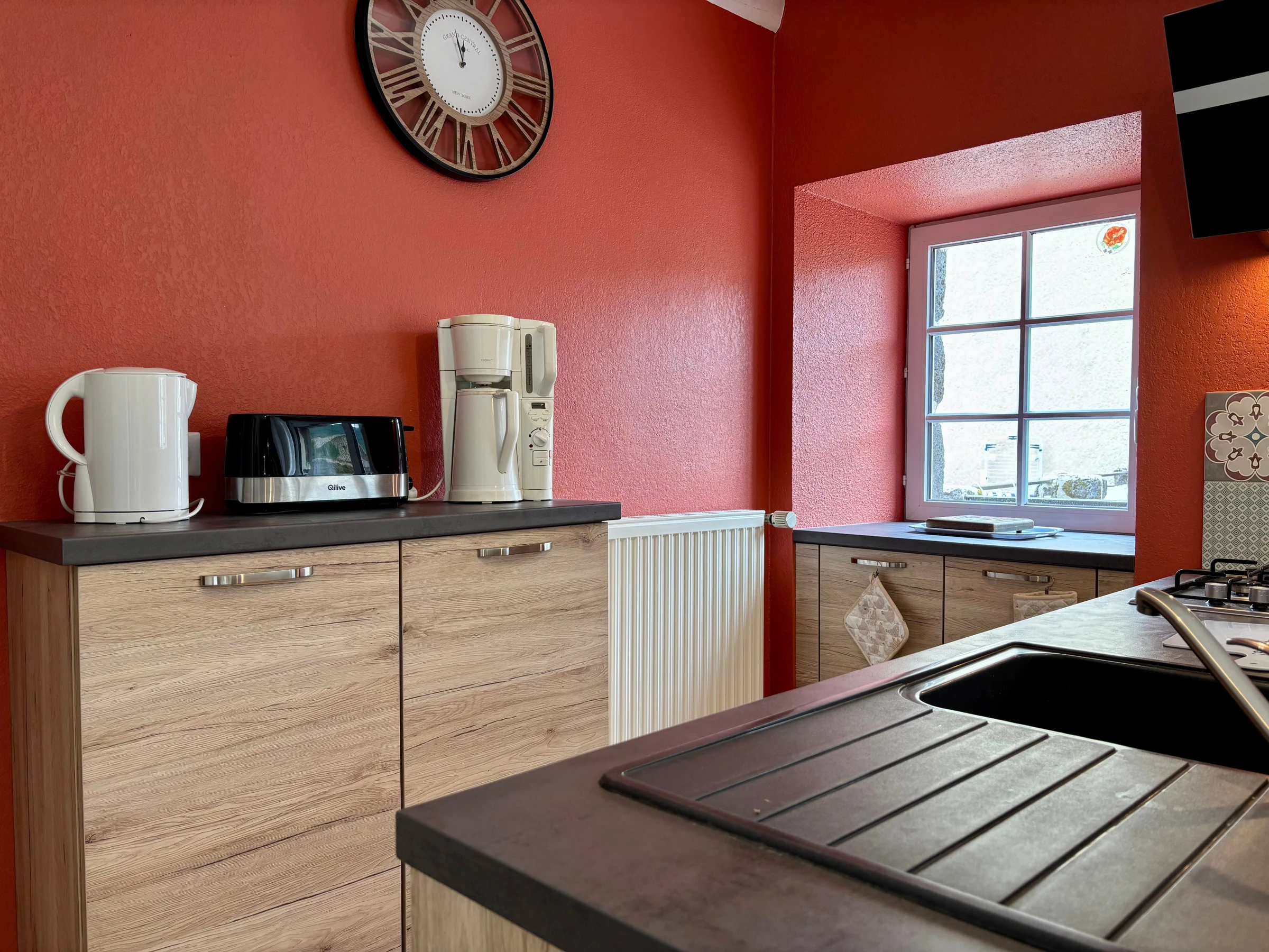 Nous avons aménagés une pièce à vivre confortable avec fauteuils et canapé, brochures de la région et jeux de société et une cuisine entièrement équipée (four, frigo, hotte, lave-vaisselle, micro-ondes, vaisselle...) avec un espace repas.