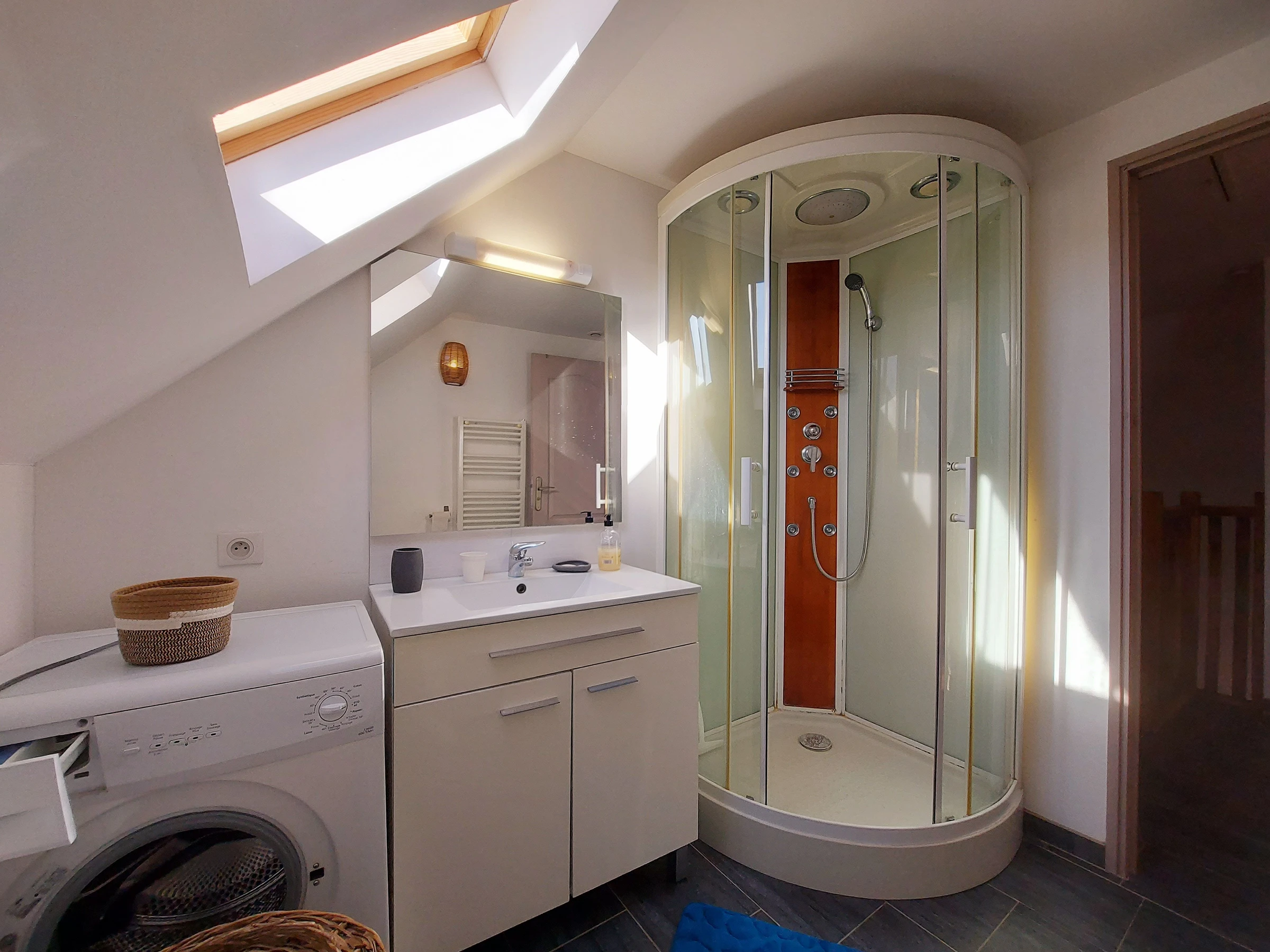 à l'étage : 1 chambre avec 1 lit de 140, 1 chambre avec 2 lits de 90, Salle d'eau/WC avec douche hydromassage et lave-linge.