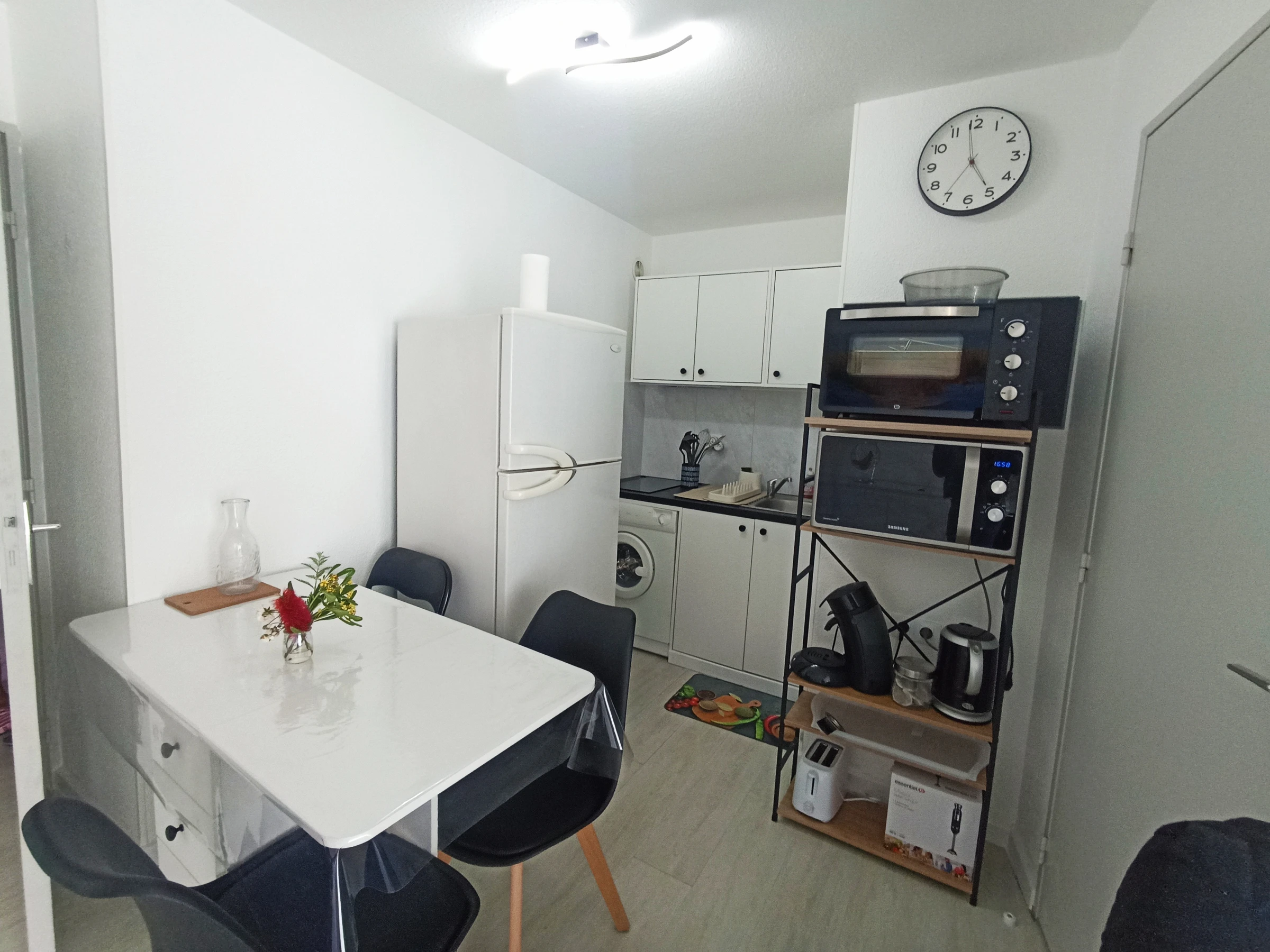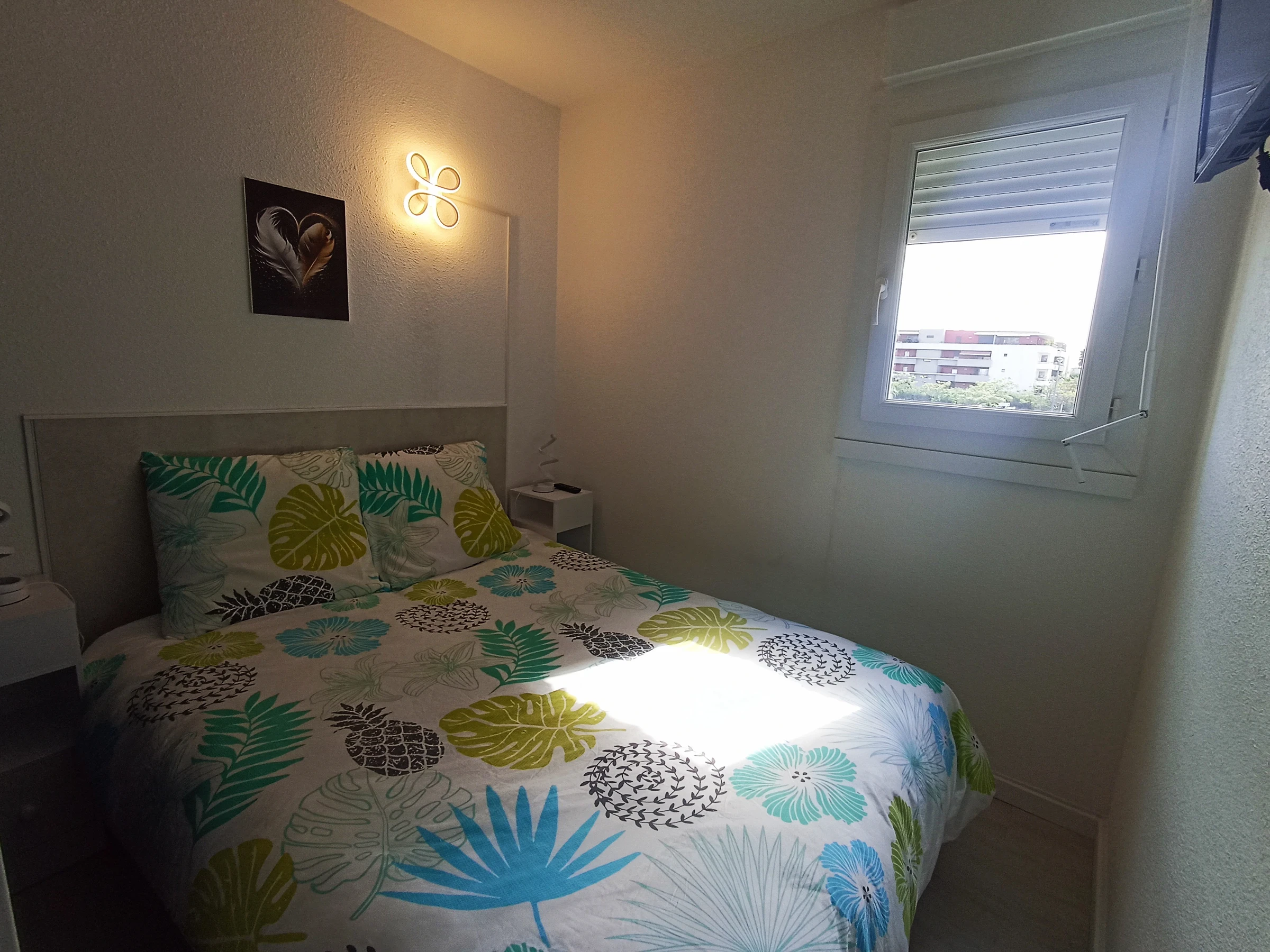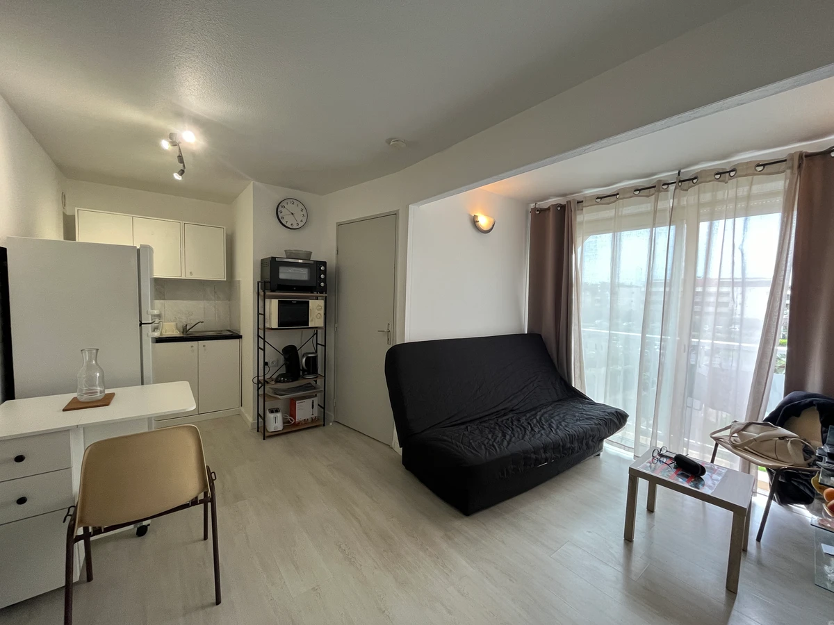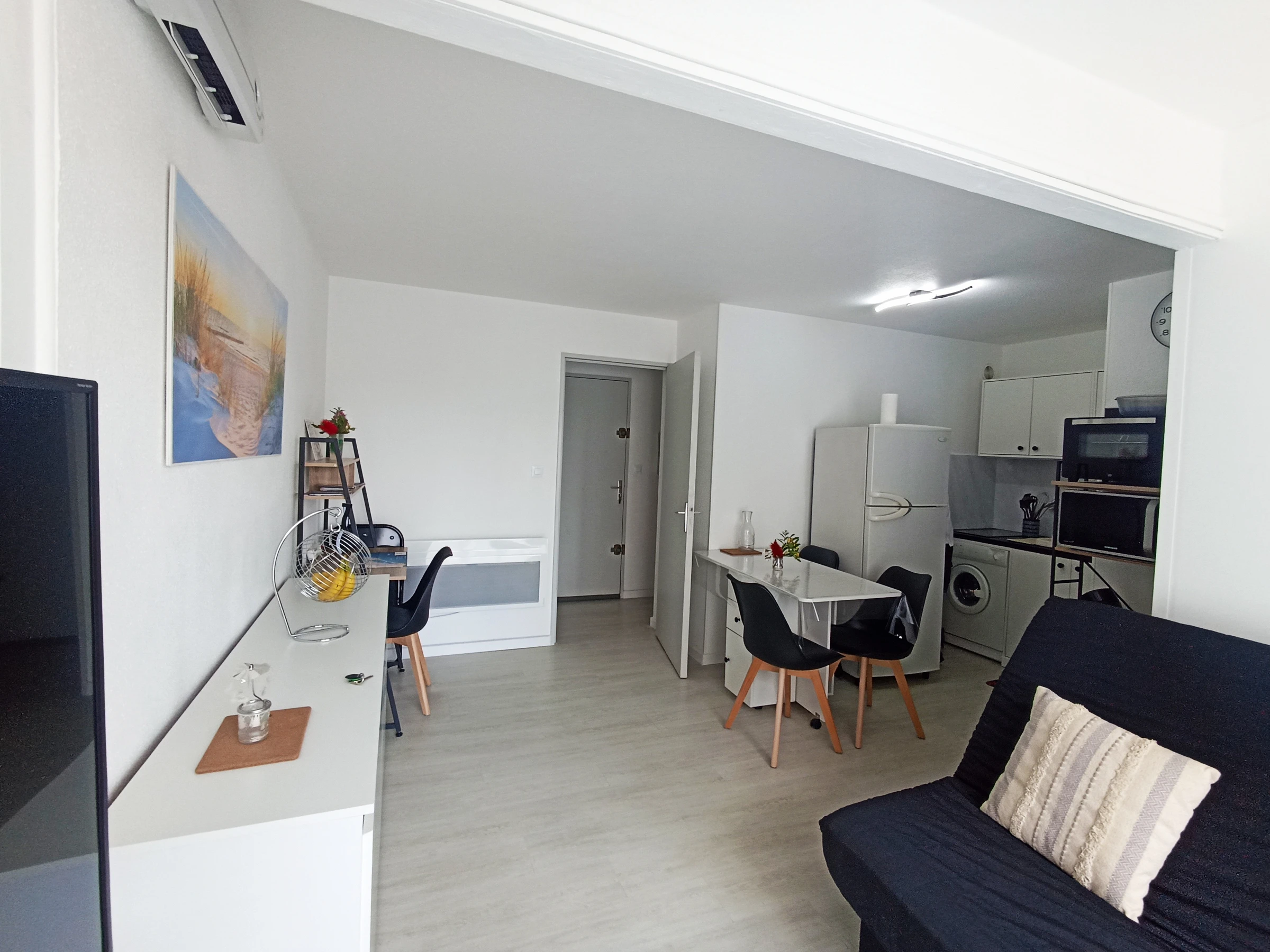 Location Vacances à Sète : Cet appartement de 25m2 est situé au deuxième dans une résidence à 200 m de la plage. Il est composé d'un séjour avec canapé-lit, TV écran plat , d'une cuisine équipée (2 plaques inductions, frigo/congélateur, micro onde, lave linge, mini-four), un espace nuit avec fenêtre (un lit 2 places en 140). La salle d'eau (lavabo, douche) est séparée des WC. Son orientation est Ouest. Animaux admis. Arrivée tardive possible 50€ (détails nous consulter).