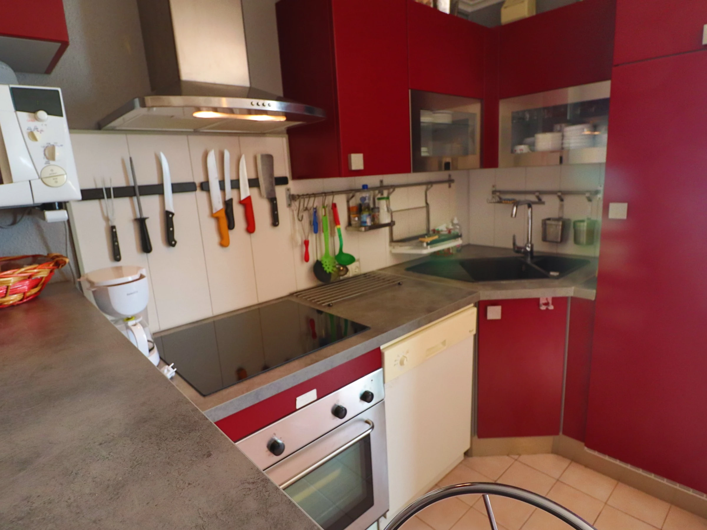 Une kitchenette équipée avec réfrigérateur-congélateur, plaques chauffantes vitrocéramiques, un four micro-ondes, un four, un lave-vaisselle.