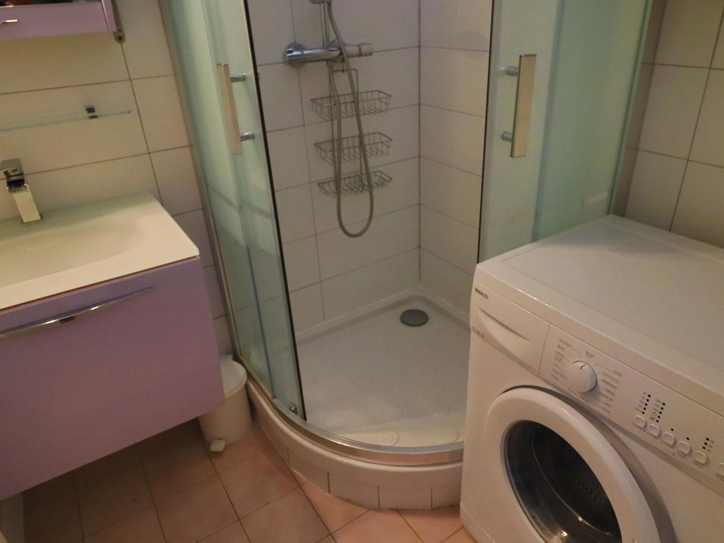 Une chambre avec lit double. Une salle d'eau avec douche et lave-linge, wc séparés.
