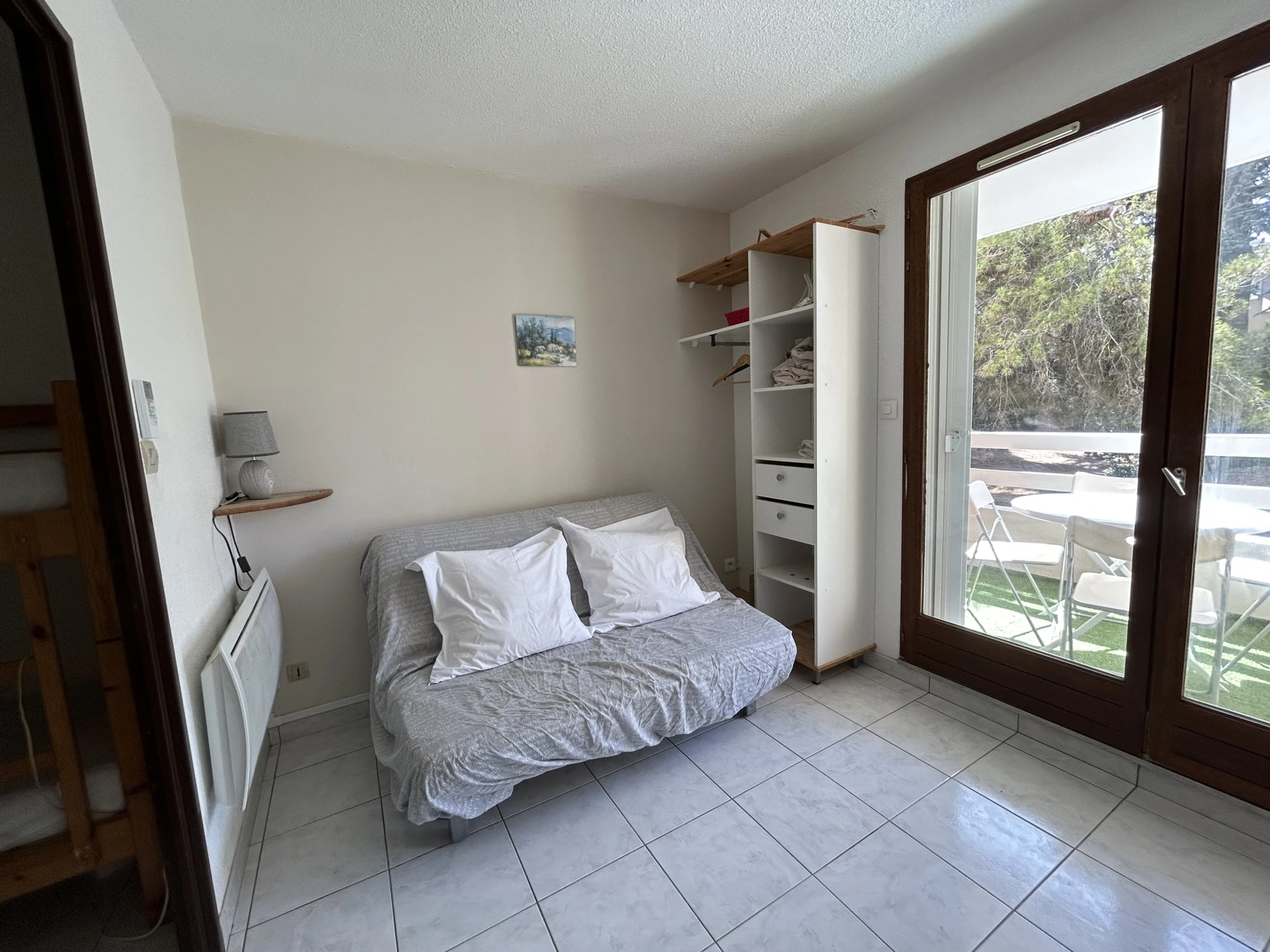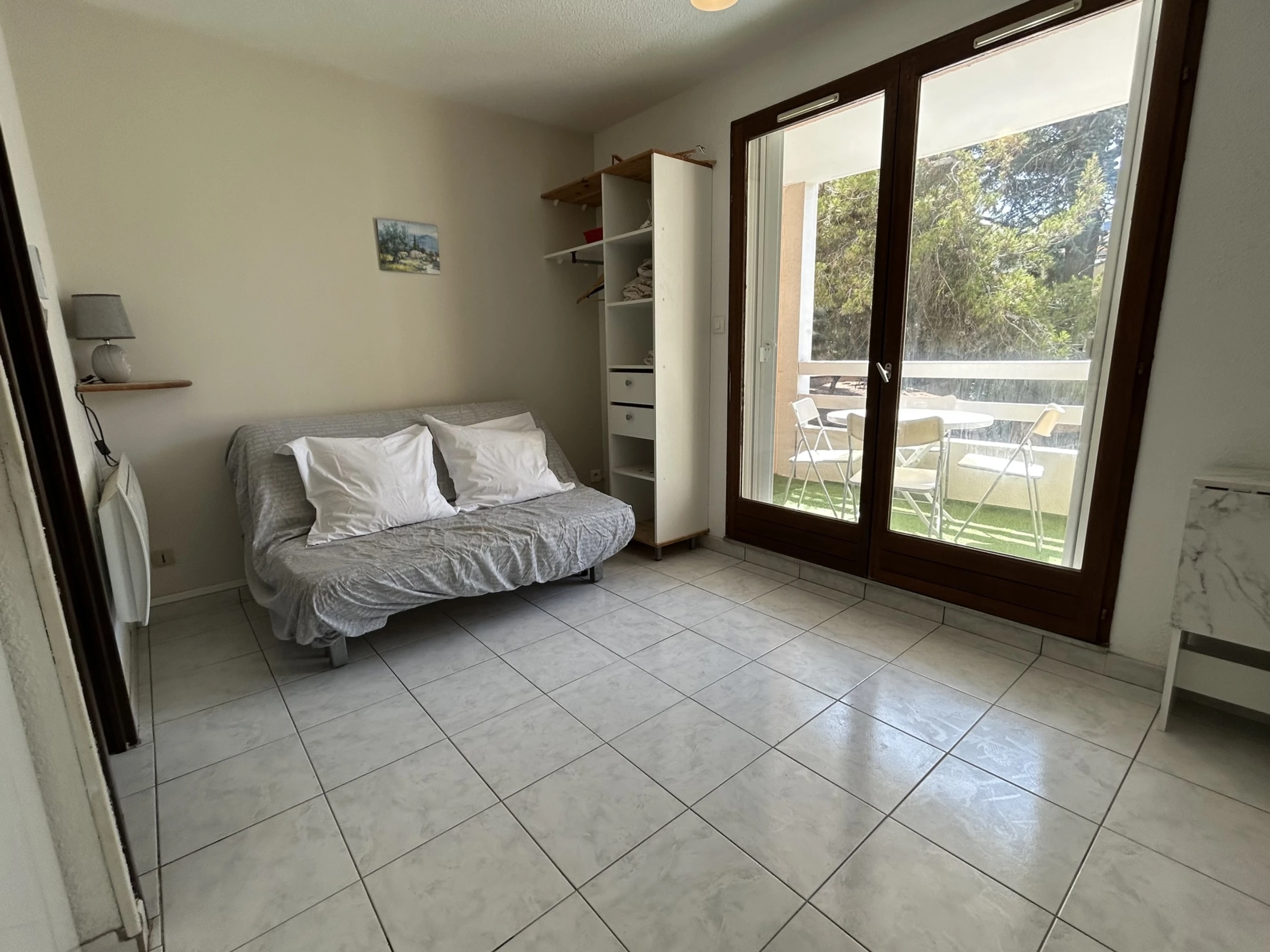 Location Vacances à Sète : Cet appartement est situé dans une résidence arborée avec piscine (ouverte du 15 juin au 15 septembre). Il est en 1er étage (avec ascenseur) à 1k m de la plage et de la mer. Joli meublé de 18m2. Agréable terrasse d'environ 4m2. Séjour avec canapé-lit, rangements, TV. Kitchenette équipée 2 plaques électriques, réfrigérateur top, micro-onde, four. Salle de bains avec baignoire, un lavabo, WC. un coin cabine avec 2 lits superposés. Cet appartement dispose d'une place de parking portant le n°11. Animaux non admis. Arrivée tardive possible : 50€ (détails nous consulter.)