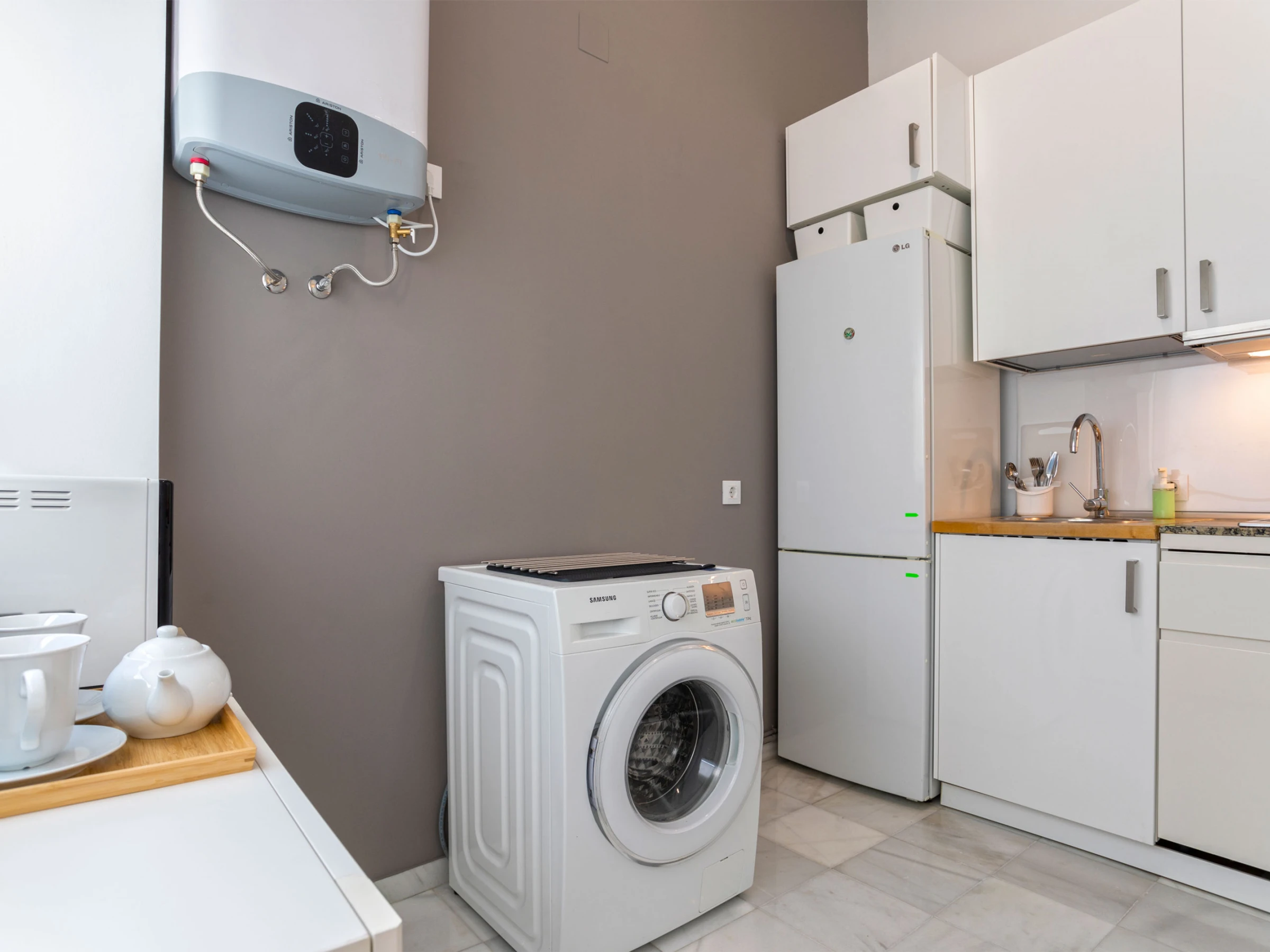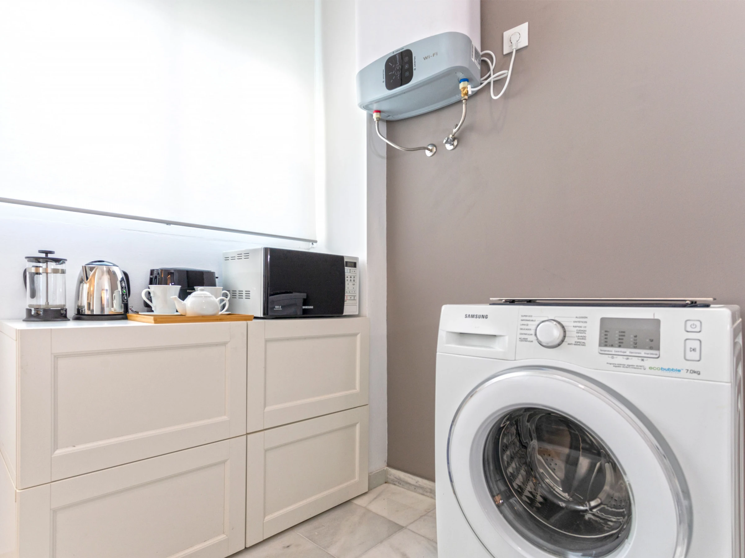 La cuisine, est équipée avec réfrigérateur, micro-ondes, congélateur, vaisselle/couverts, cafetière et grille pain.