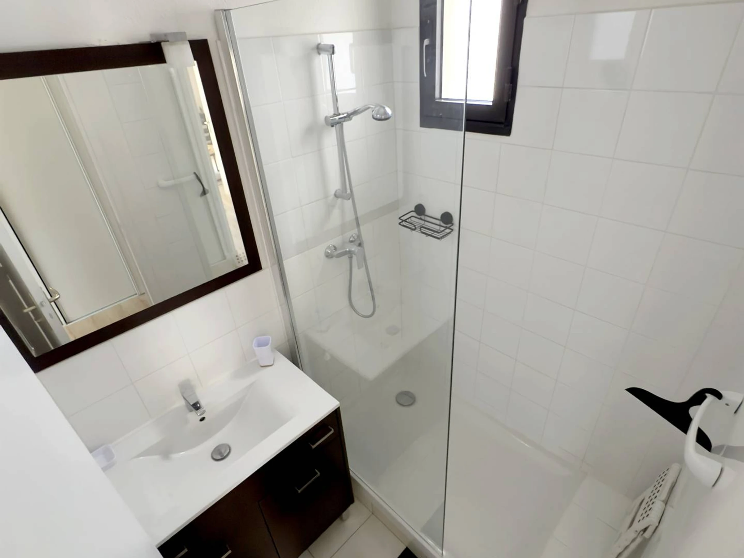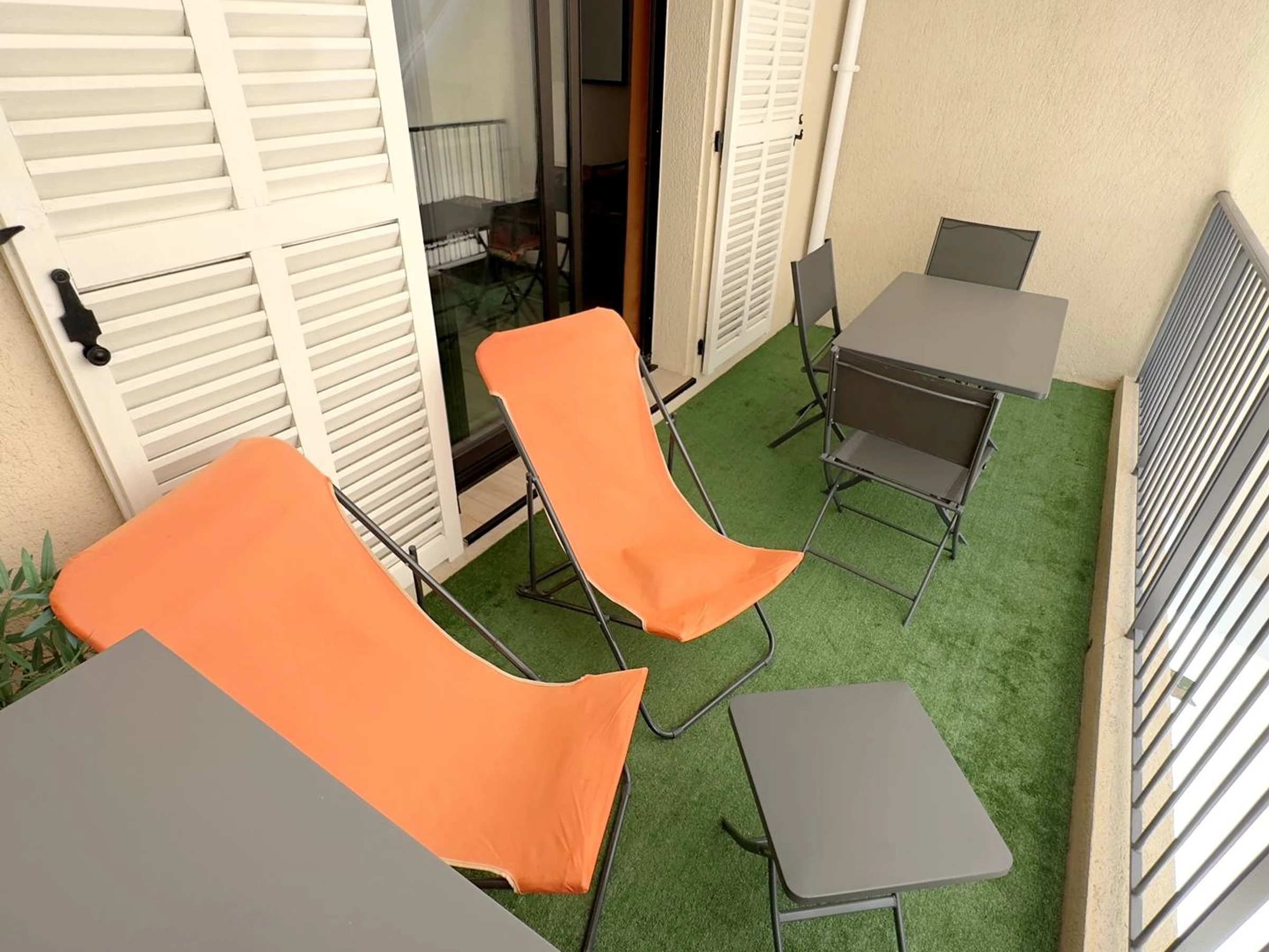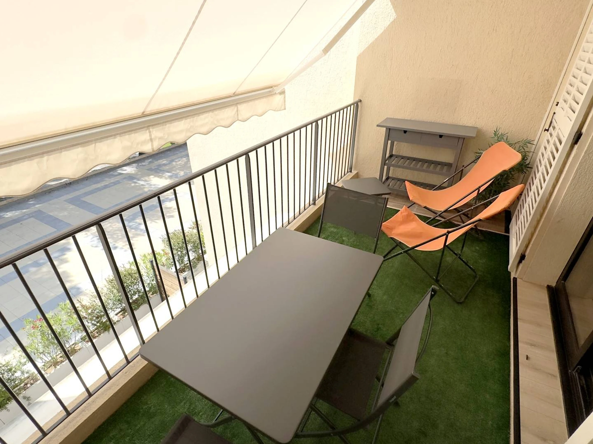Loggia (10 m²) avec vue sur la verdure du domaine et équipée d'une table, chaises de jardin, 2 transats, plancha et store banne – Entrée avec penderie - Cellier avec dressing, réfrigérateur / congélateur , aspirateur, fer et table à repasser - Cuisine ouverte sur le séjour (plaque de cuisson vitrocéramique 2 feux, micro-ondes, hotte aspirante, lave-linge, lave-vaisselle, cafetière à filtre, bouilloire, grille-pain) - Pièce principale avec 1 canapé convertible Rapido 2 places (en 140), espace repas, chaine Hifi et téléviseur - 1 petite chambre avec 1 lit gigogne, soit 2 lits 1 place dont 1 matelas (en 80) et 1 matelas (en 70), petit climatiseur mobile et rangements - Salle d’eau avec douche italienne, vasque et sèche-cheveux - WC indépendants.