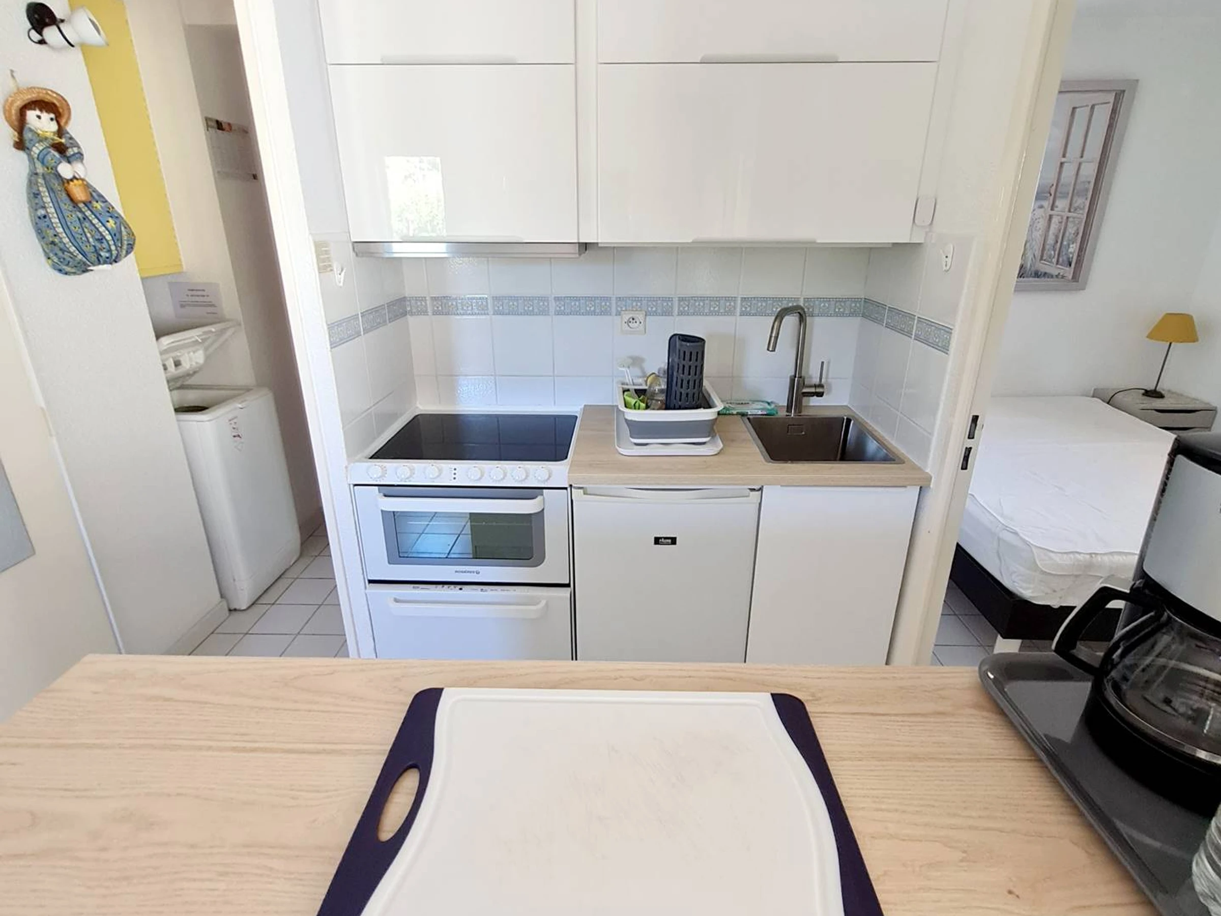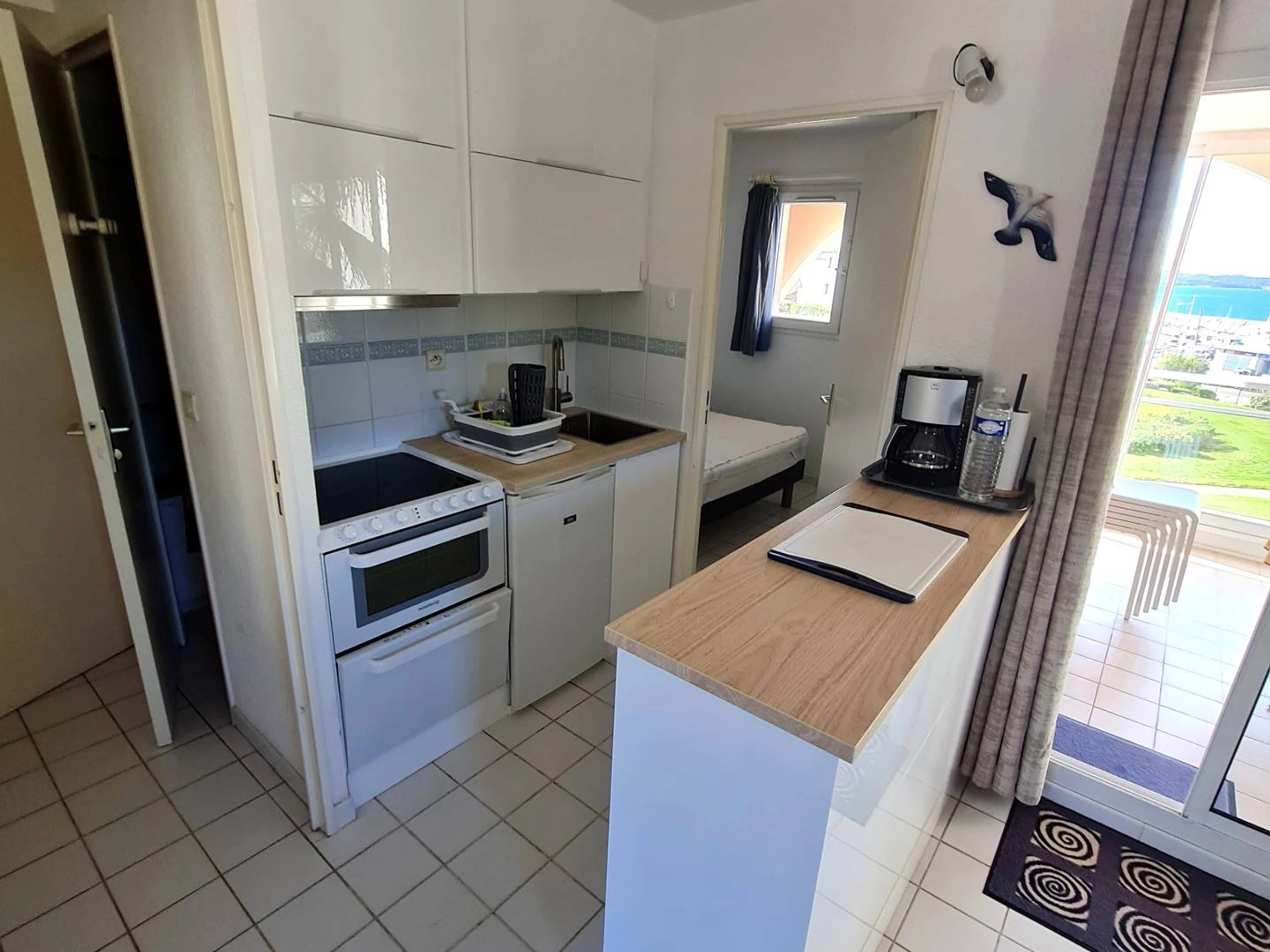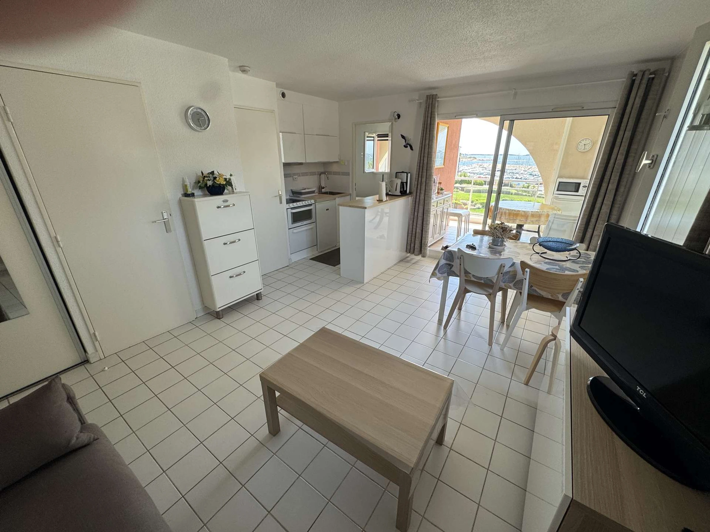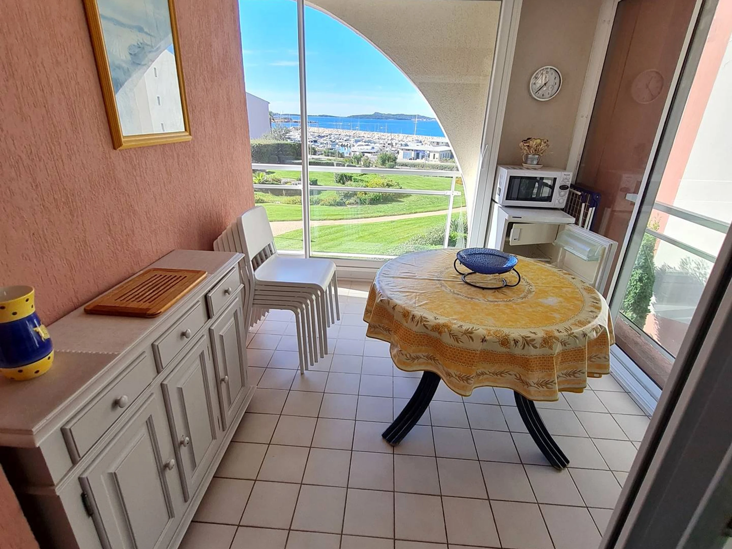 Grande loggia fermée par baies vitrées amovibles offrant une belle vue mer et port de la Coudoulière avec petit réfrigérateur, vaisselier, cafetière Dolce Gusto, table et chaises de jardin - Coin cuisine ouverte (mini lave-vaisselle - lave-linge - petit réfrigérateur - plaque électrique 4 feux - hotte aspirante - four - micro-ondes - cafetière à filtre - bouilloire - table et fer à repasser - aspirateur sans fil - Pièce principale avec 1 canapé convertible 2 places (en 140), 2 ventilateurs colonne et télévision - 1 chambre vue mer avec 1 lit 2 places (en 140) et grande armoire - 1 chambre avec 2 lits superposés 1 place (en 90) et penderie - Salle de bains avec baignoire, vasque et sèche-cheveux - WC indépendants.