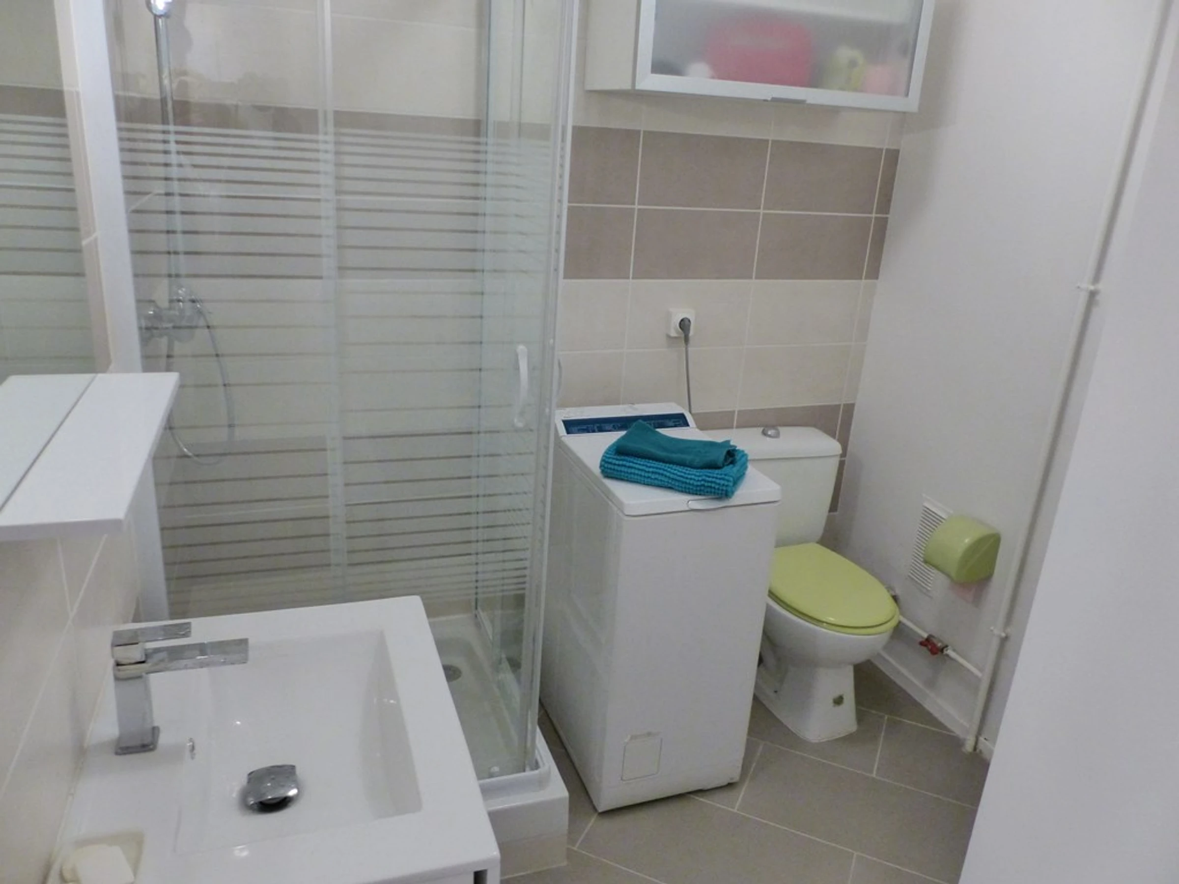 Salle de douche (2.12 x 1.73) : douche, vasque, WC et lave-linge.