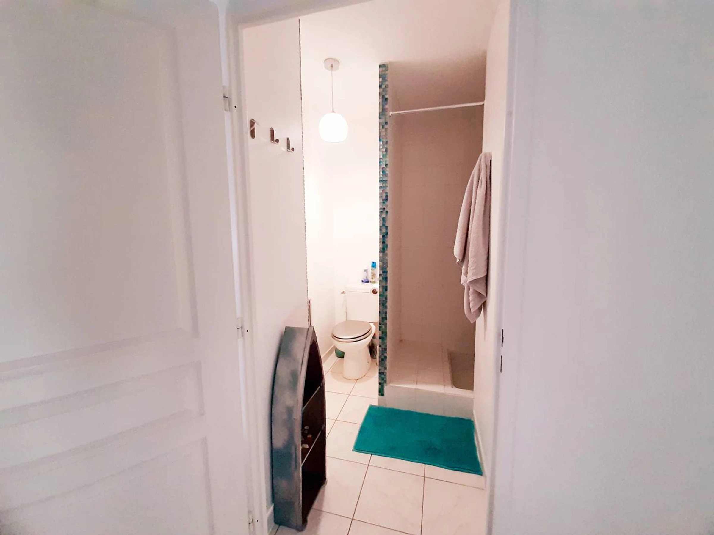 La chambre lumineuse est meublée d'un lit double confortable (1.40 m) et d'un grand placard, et ouvre également sur la terrasse. La salle de douche moderne, équipée d'un WC, offre tout le confort nécessaire pour un séjour agréable.