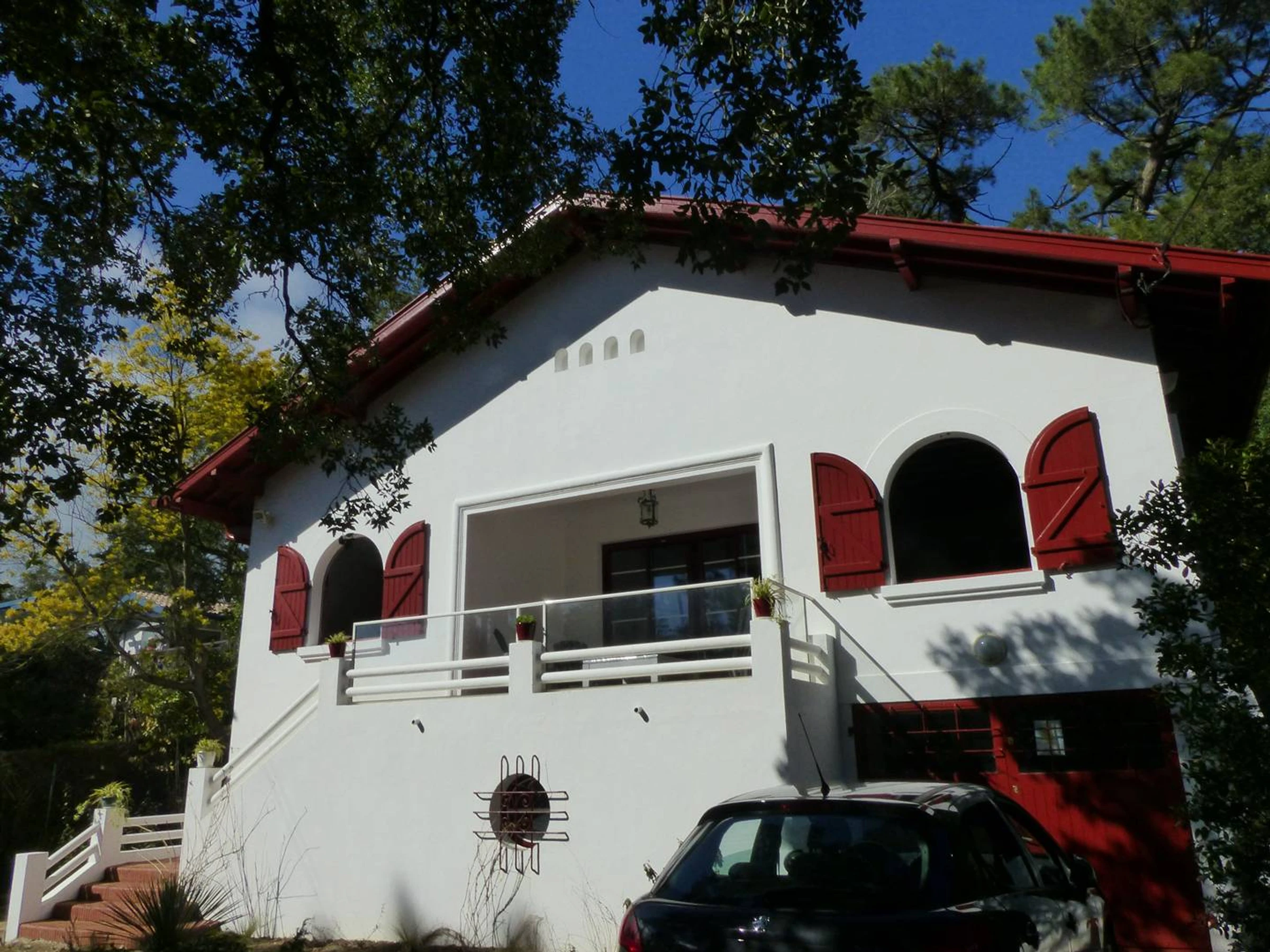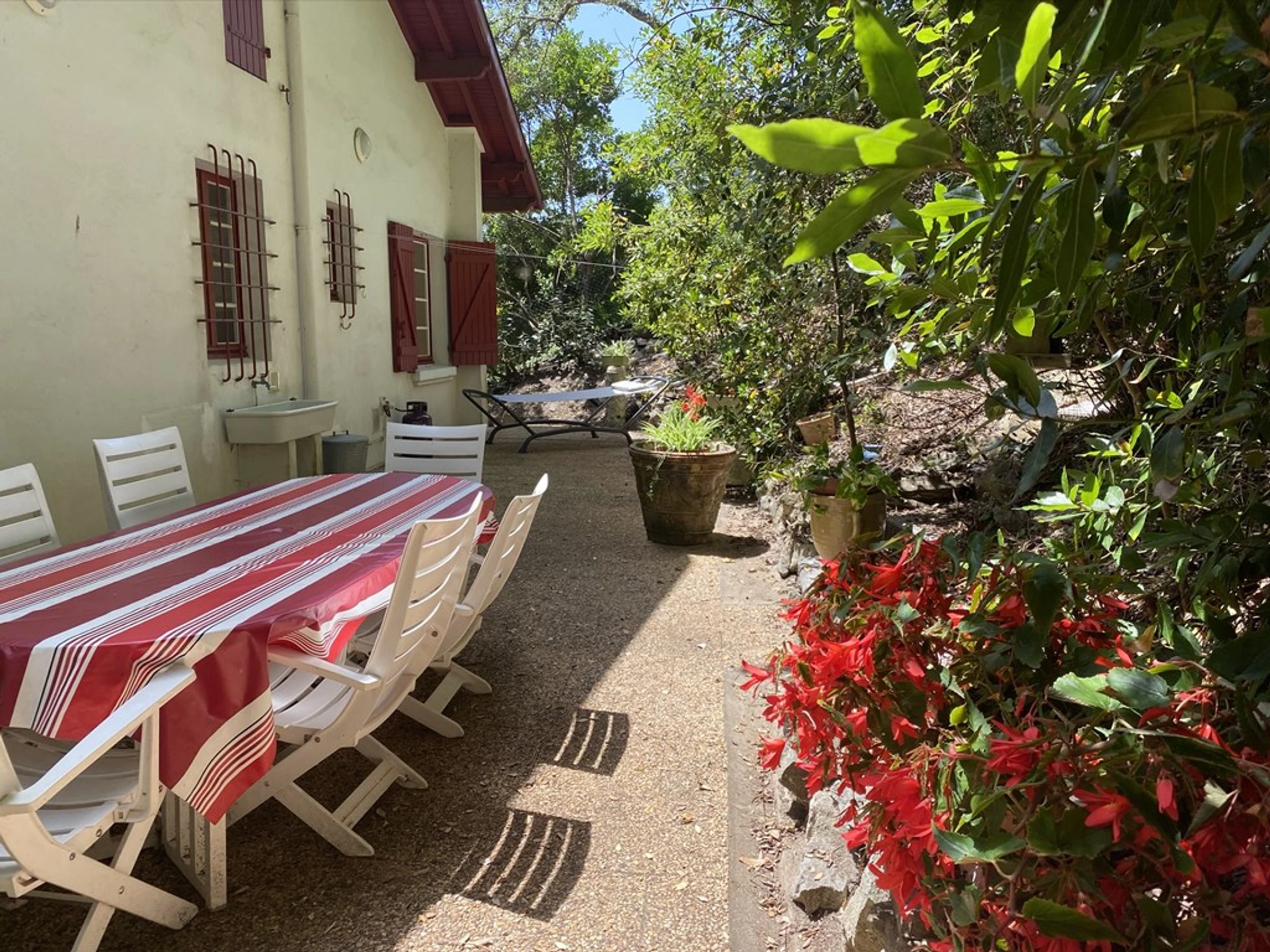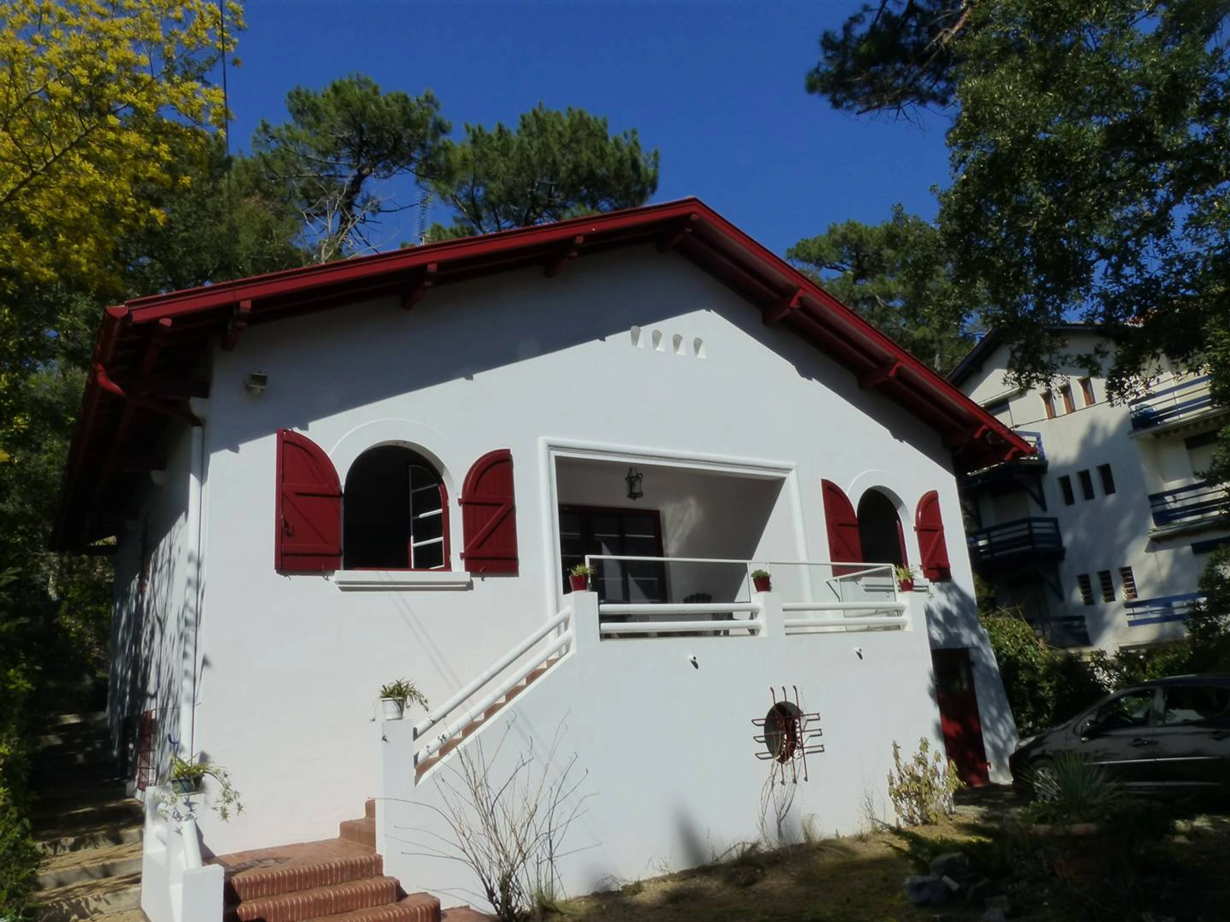 HOSSEGOR- Villa basco-landaise des années 50 édifiée sur un terrain d'environ 912m2 (pentu et boisé de pins chênes et arbousiers sur l'arrière de la villa). Classée 3* en 2021. Wifi gratuit. Pièce principale de séjour/salon en L (3.99x4.62 et 5.24x3.45) ouvrant sur une terrasse en façade d'environ 9.50m2. Cuisine aménagée et équipée (6.40m2): plaque 3 feux gaz, réfrigérateur-congélateur, four, micro-ondes, lave-vaisselle et lave-linge. Salle à manger attenante ouvrant sur terrasse arrière avec table, chaises de jardin, barbecue et transats.