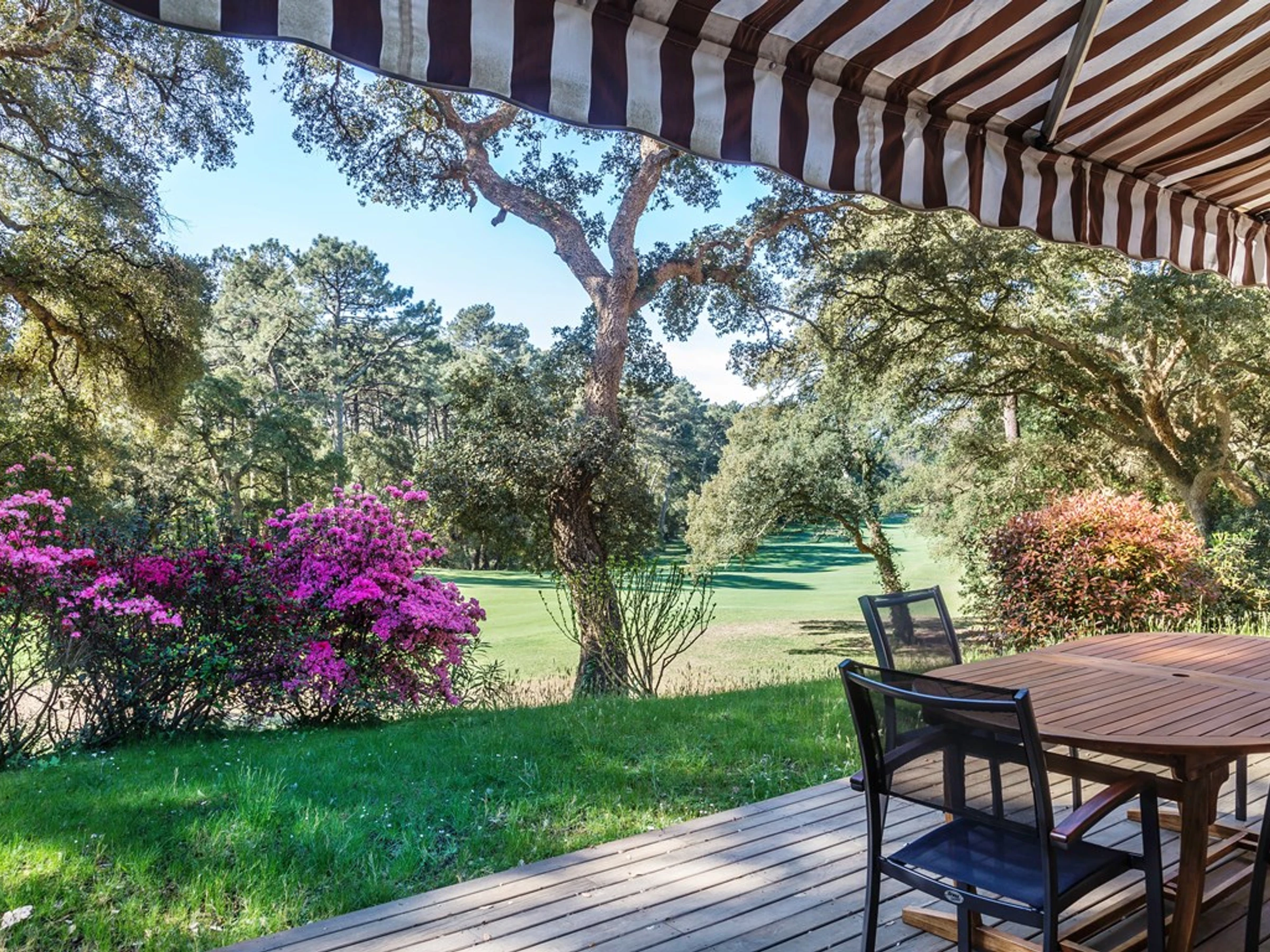 Idéalement située en bordure du golf, entre les trous n°15 et 16, à proximité des courts de tennis et du stade, cette magnifique villa de charme s'étend sur un grand terrain arboré de 1900 m2, parsemé de chênes-lièges, arbousiers et pins. Appréciez la vue imprenable sur le parcours de golf depuis cette villa. La connexion Wi-Fi est disponible gratuitement et la villa a été classée 4 étoiles en 2020.