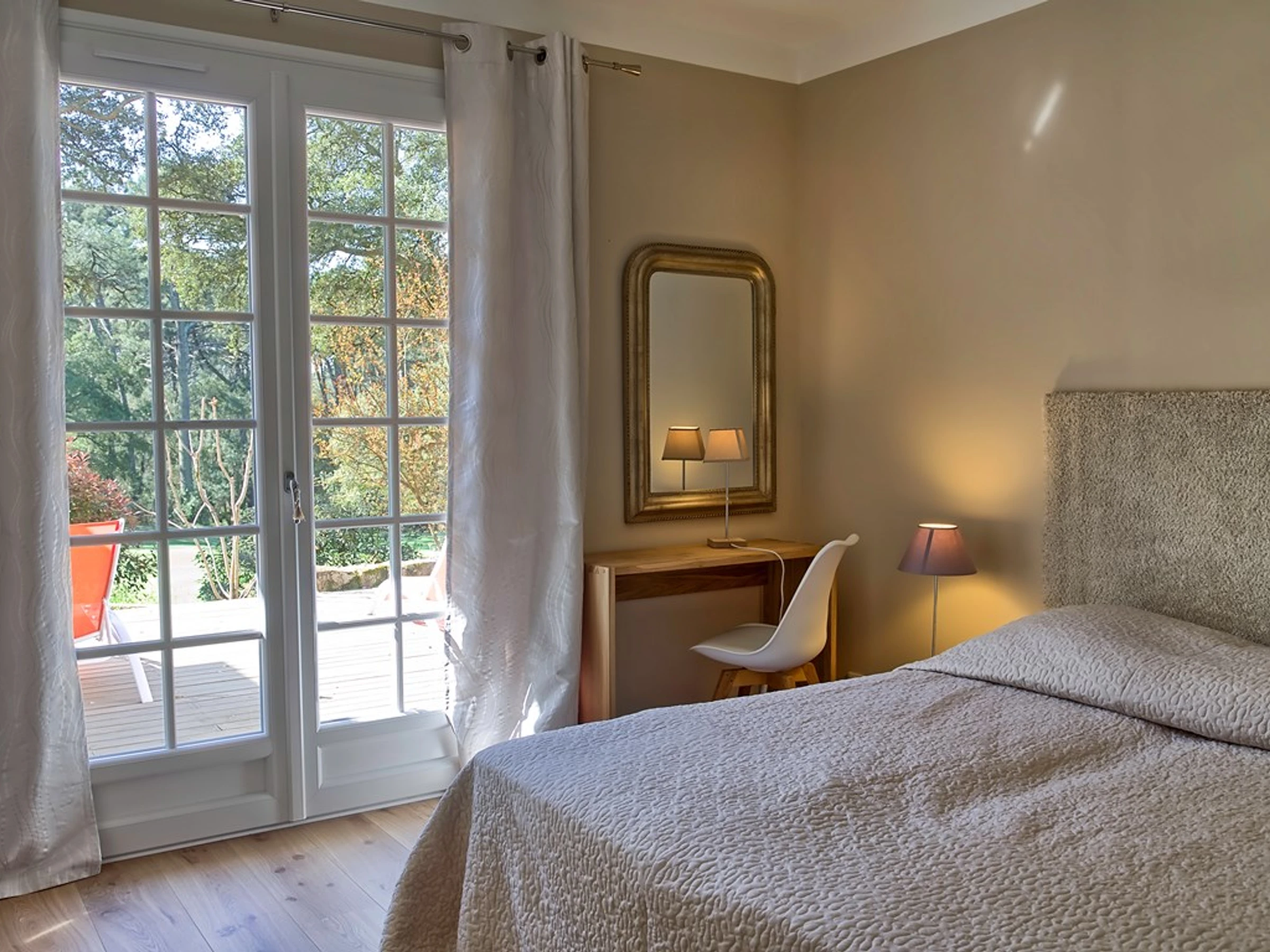 tandis que la deuxième chambre, d'une superficie de 12,9 m2, fait face au golf et s'ouvre sur une terrasse. Elle est également équipée d'un lit double de 160 cm.