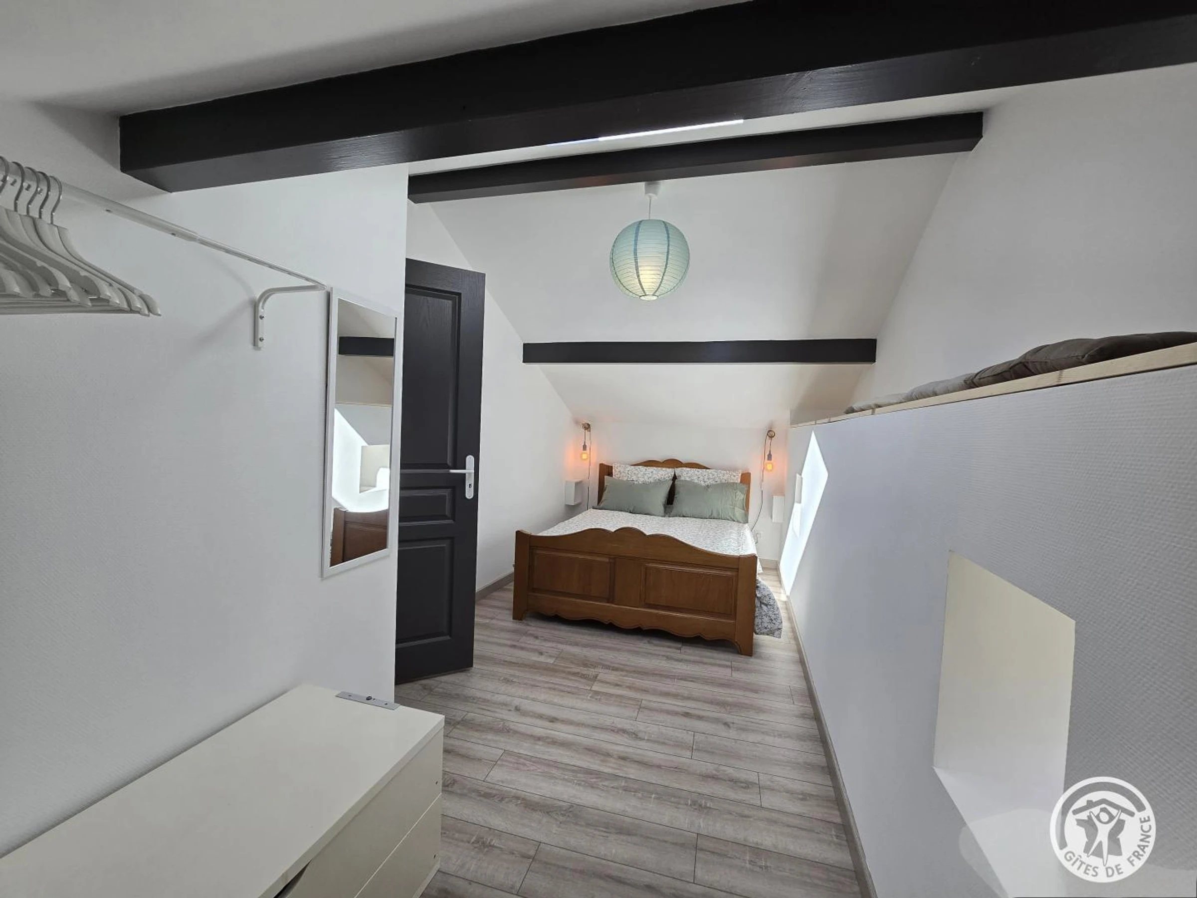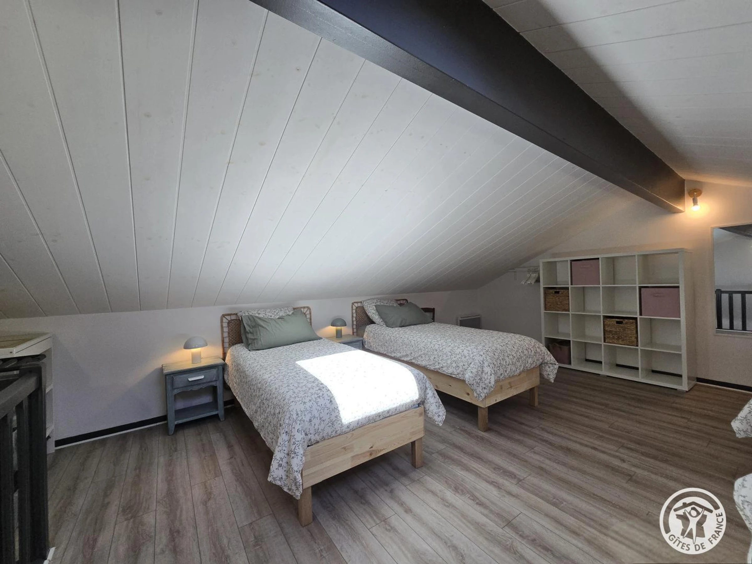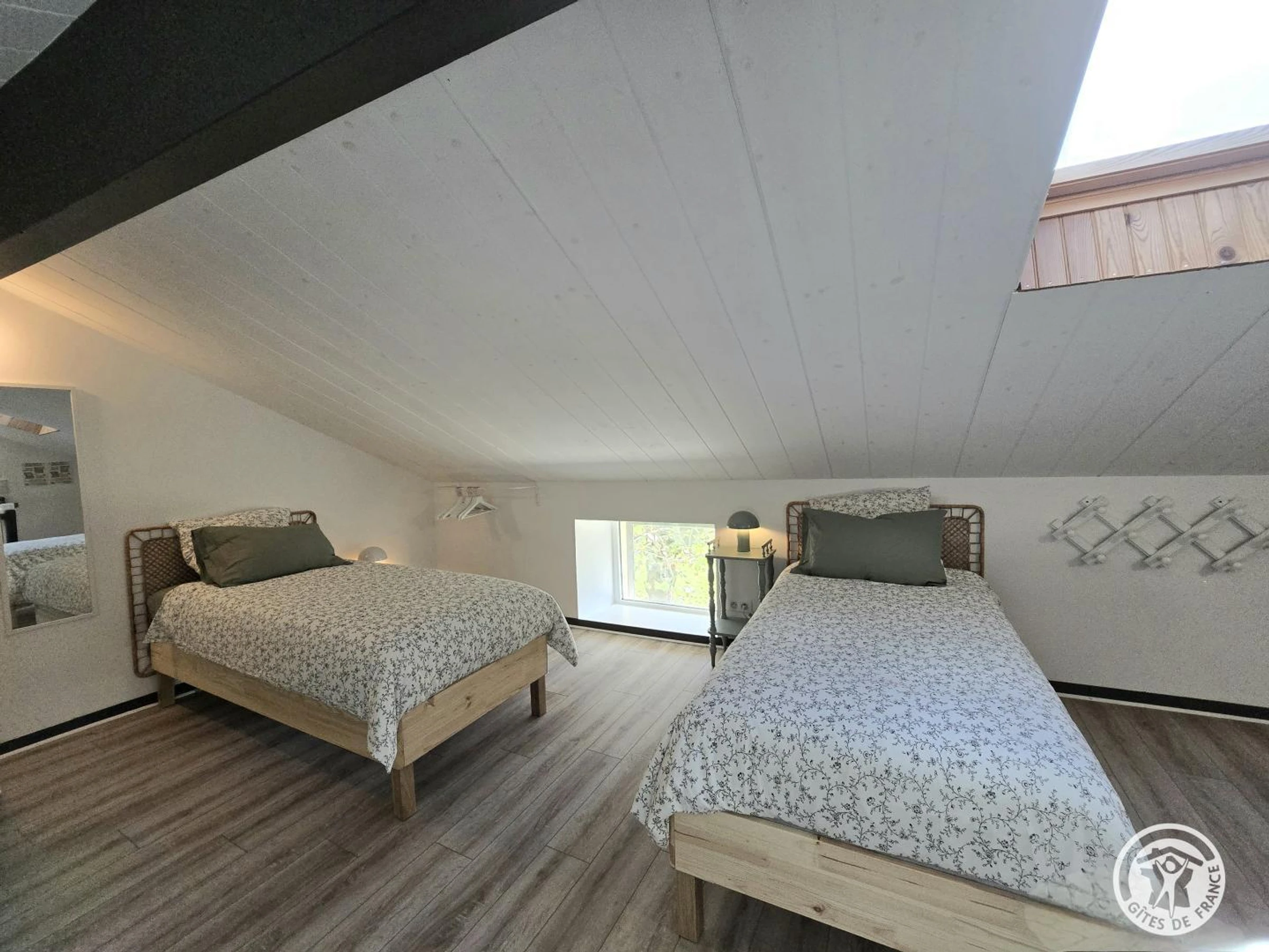 Au rez-de-chaussée : cuisine équipée (four, plaques induction, lave-vaisselle, combiné congélateur), espace repas, un salon de détente avec jeux de société, un deuxième salon cosy avec télévision et Wifi. Toujours au rez de chaussée, un couloir dessert 2 chambres avec un lit de 140, 2 lits de 90, une salle d'eau avec douche à l'italienne, 2 vasques. À l'étage : accessible depuis la cuisine, une chambre mezzanine en dortoir avec 4 lits en 90.Depuis le salon de détente, accès par escalier à 2 chambres (2 lits en 140) et une salle d'eau avec WC.