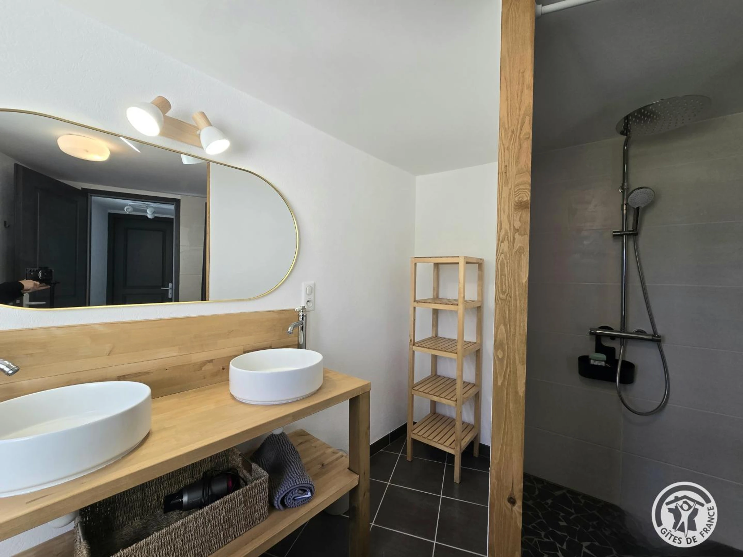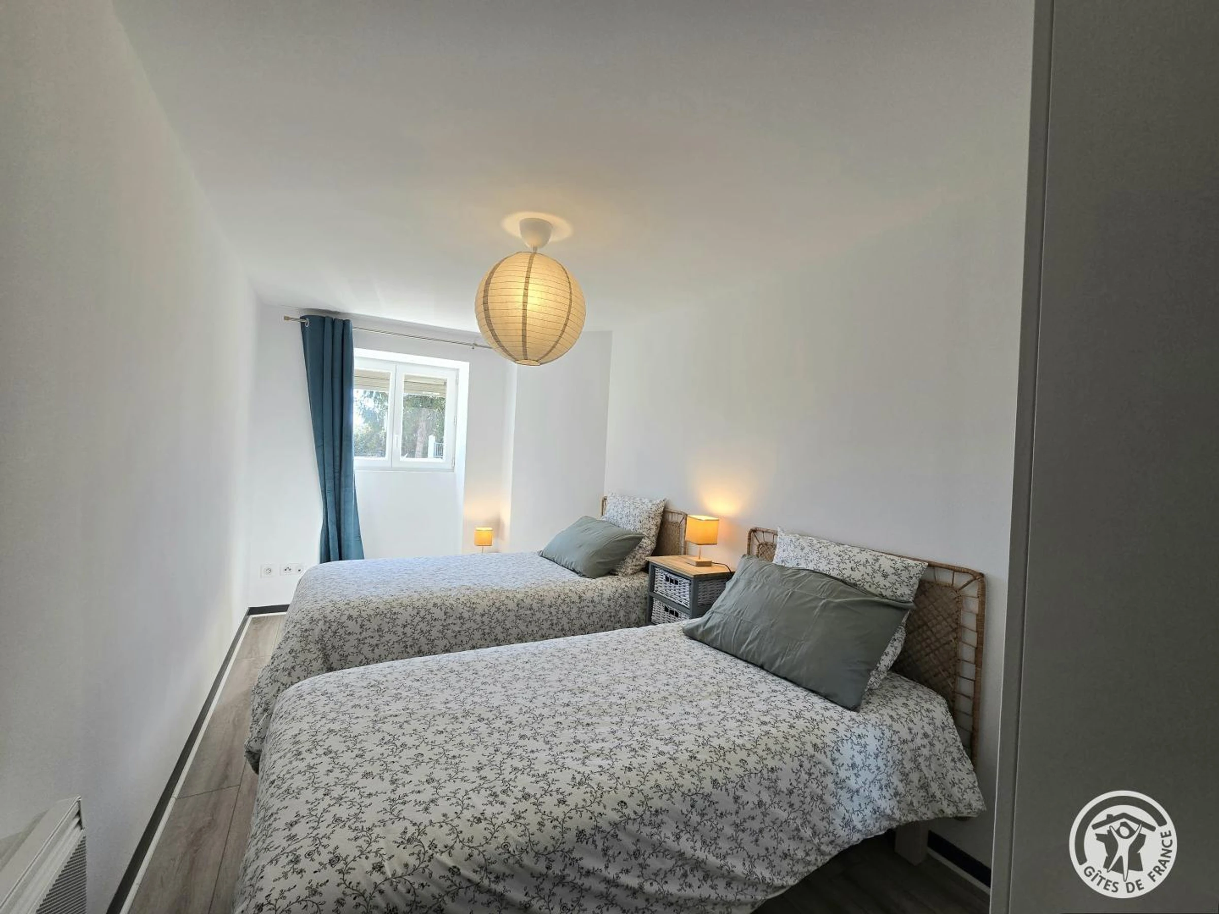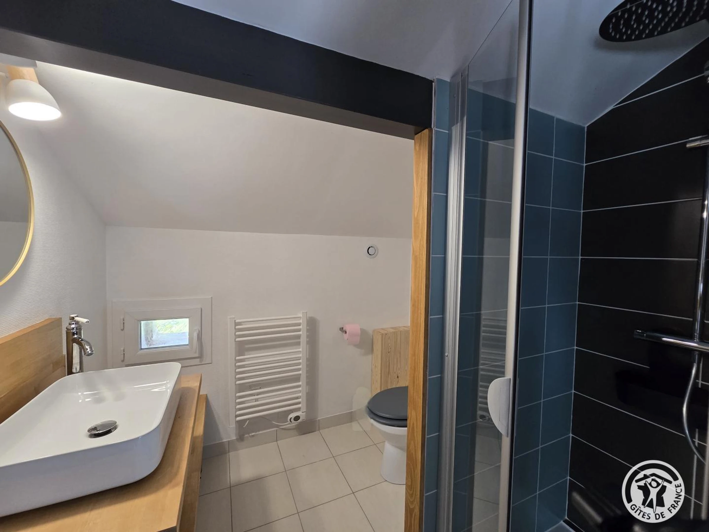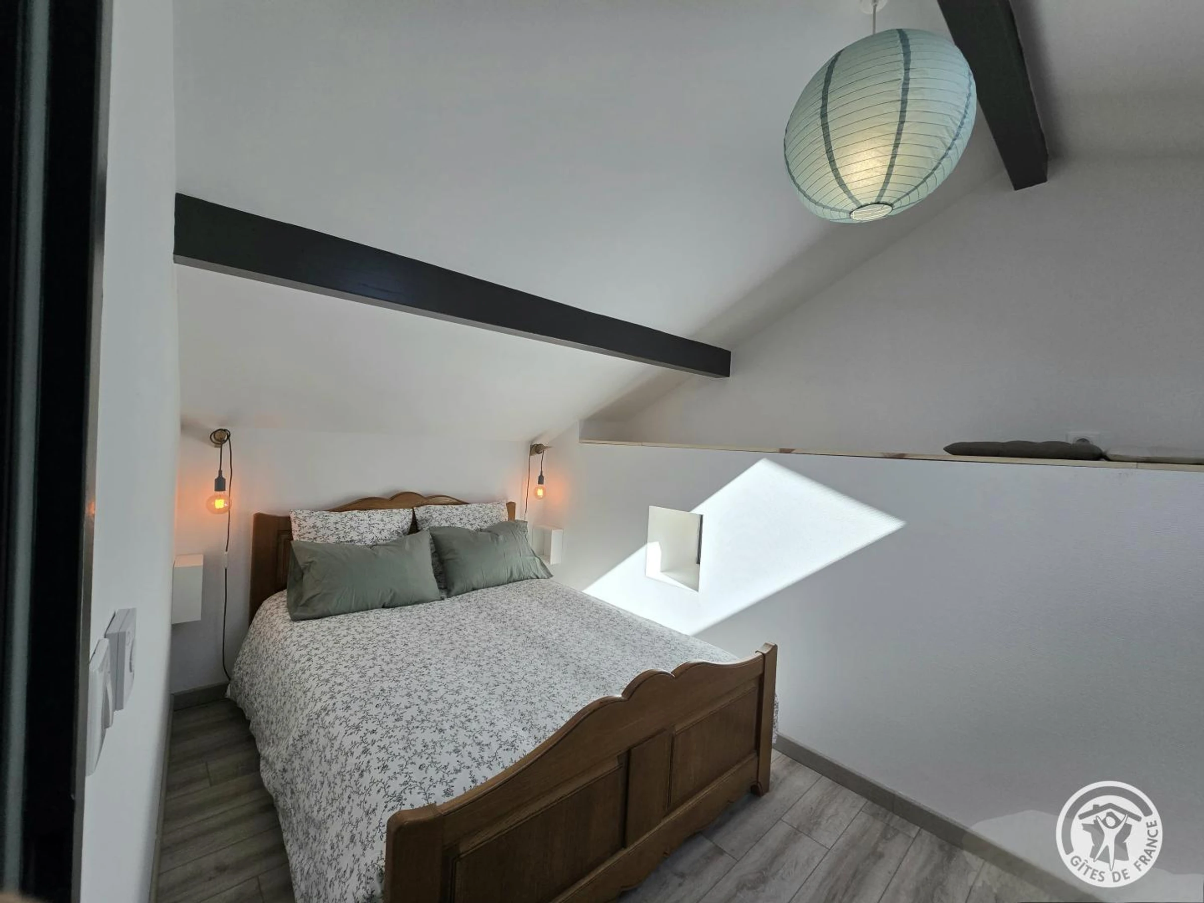 Au rez-de-chaussée : cuisine équipée (four, plaques induction, lave-vaisselle, combiné congélateur), espace repas, un salon de détente avec jeux de société, un deuxième salon cosy avec télévision et Wifi. Toujours au rez de chaussée, un couloir dessert 2 chambres avec un lit de 140, 2 lits de 90, une salle d'eau avec douche à l'italienne, 2 vasques. À l'étage : accessible depuis la cuisine, une chambre mezzanine en dortoir avec 4 lits en 90.Depuis le salon de détente, accès par escalier à 2 chambres (2 lits en 140) et une salle d'eau avec WC.