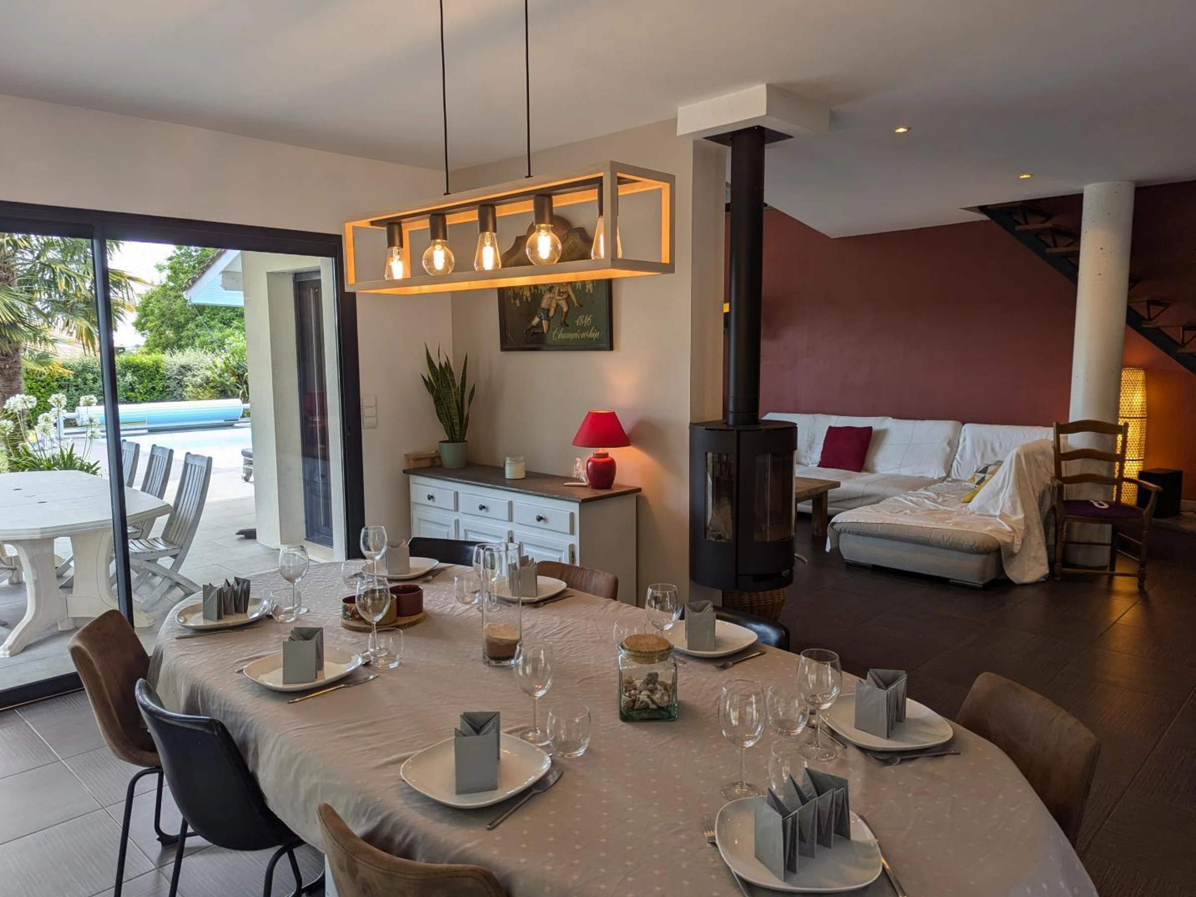Jardin clos, Espace clos, Espace privé, Chambre au RDC, Lave linge, Lave vaisselle, Draps fournis, Barbecue/Plancha, Salon de jardin, Télévision, Micro-ondes, Equipement bébé, Parking sur place, Piscine sur place, Sèche-linge, WIFI/Internet, Terrasse, Jardin, Animaux acceptés, Serviettes fournies, Menage départ inclus, Congélateur, Poêle à bois, Abri voiture, Maison Individuelle, Piscine privative, Piscine chauffée.