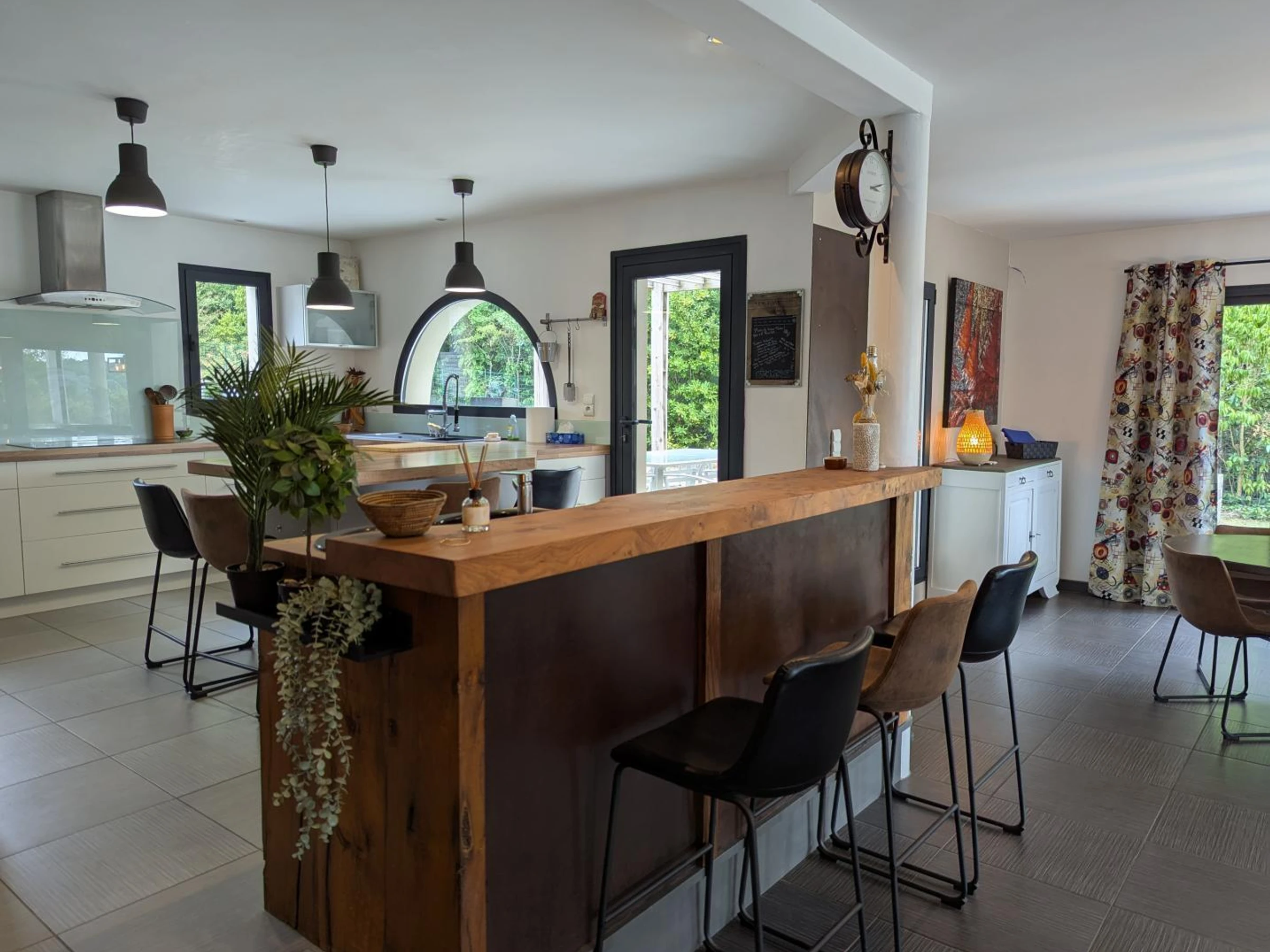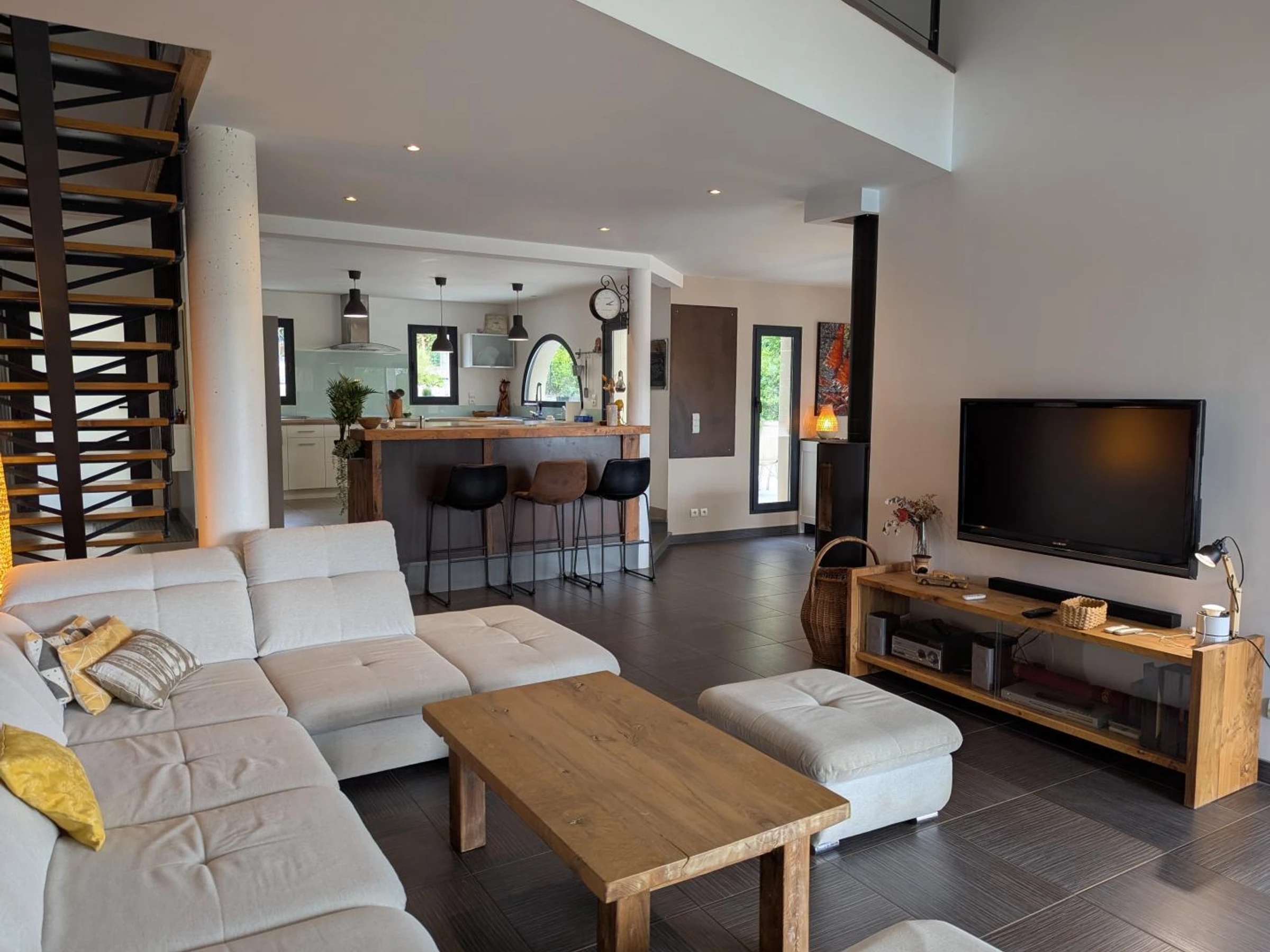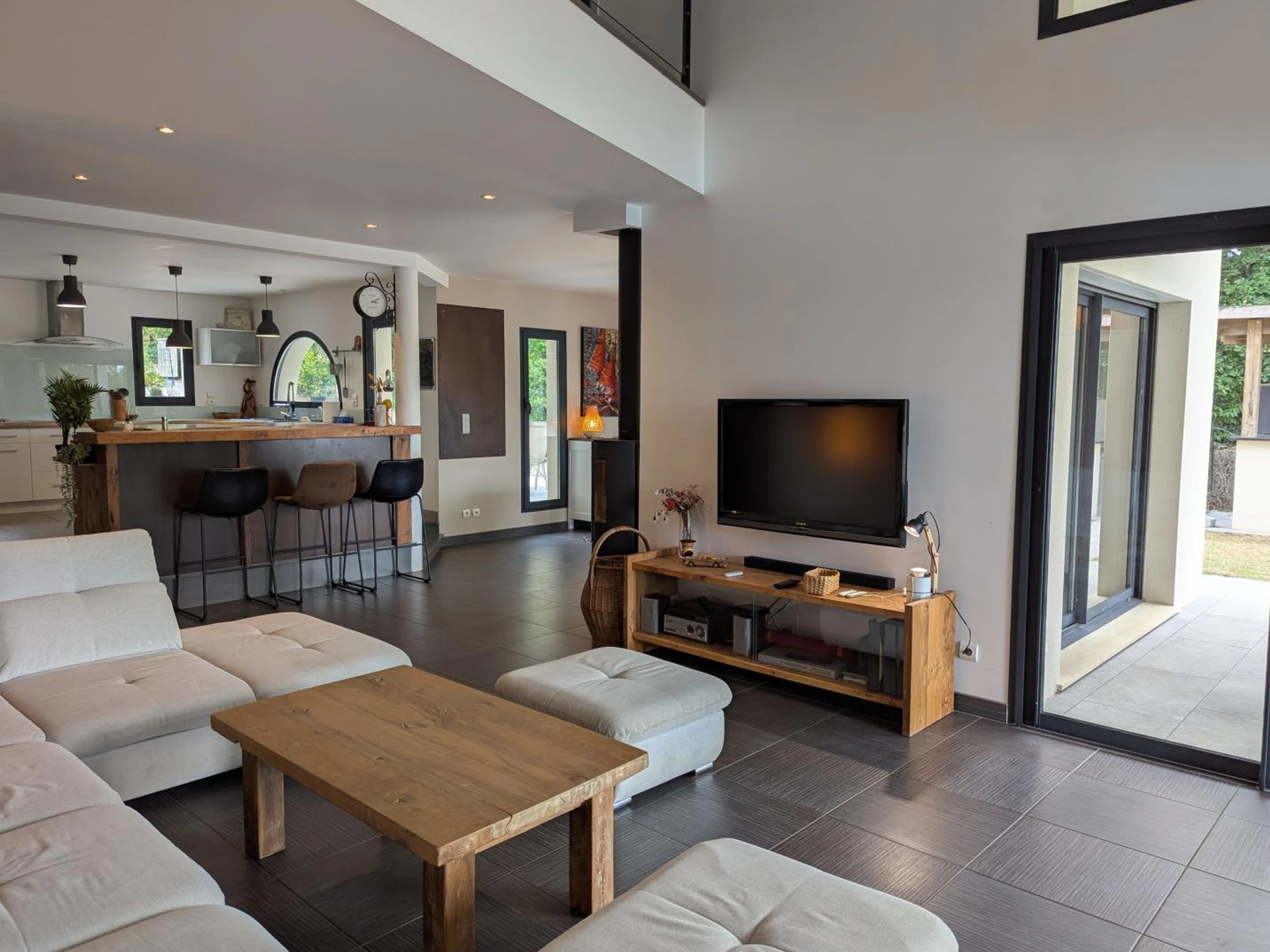 Au rez-de-chaussée : cuisine ouverte sur le vaste séjour cathédrale et l'espace repas. Pièce de vie baignée de lumière donnant sur la terrasse et la piscine. TV avec bar de son. Buanderie, cellier, WC indépendants, une chambre avec lit 160x200 et son dressing, une chambre enfant avec 2 lits gigogne 80x200 (jumelable en 160), salle de bain avec baignoire, douche et WC.
