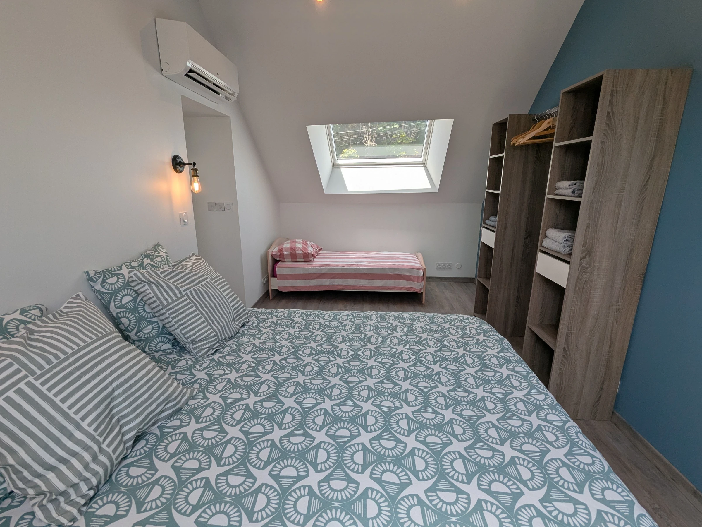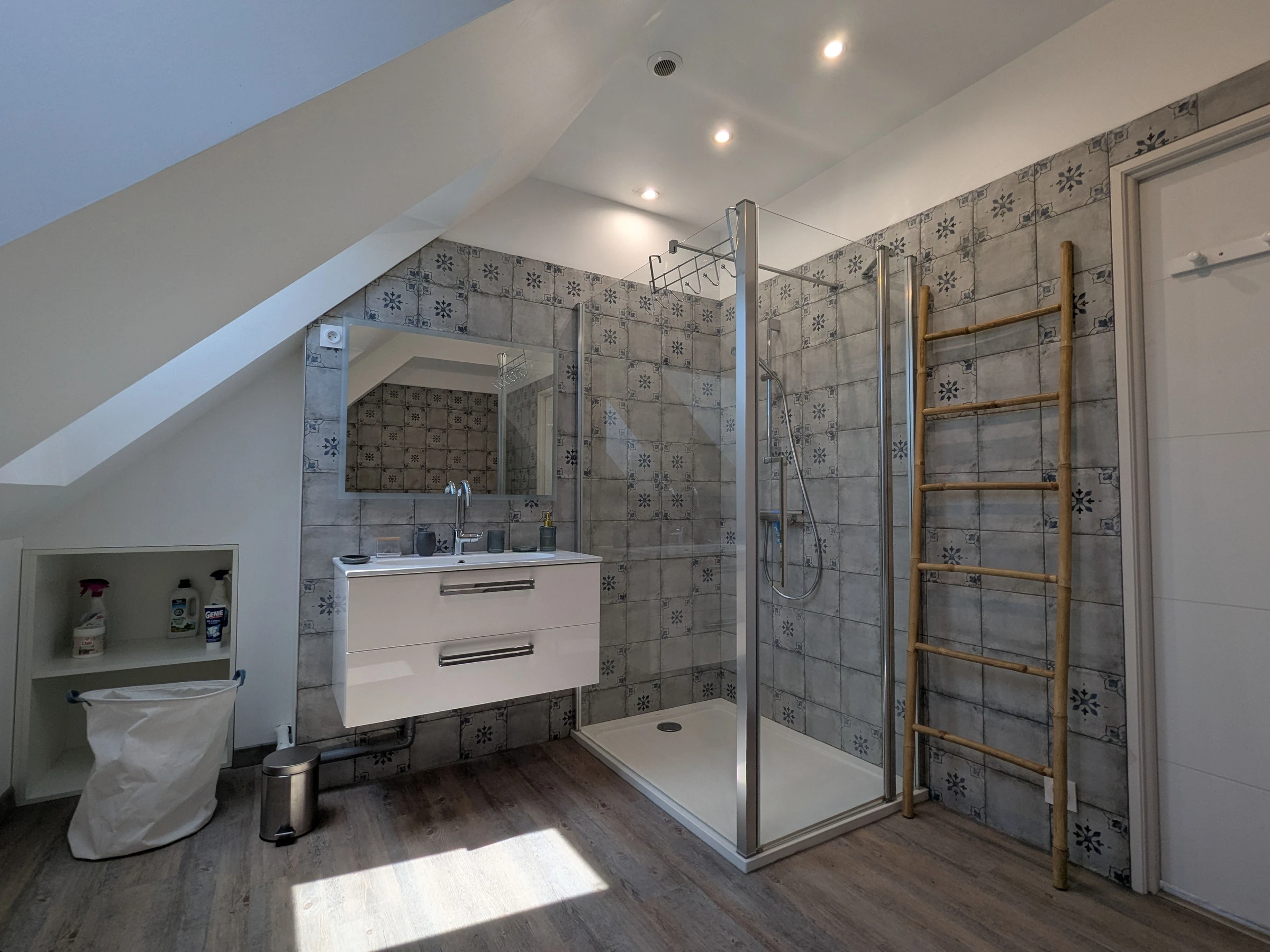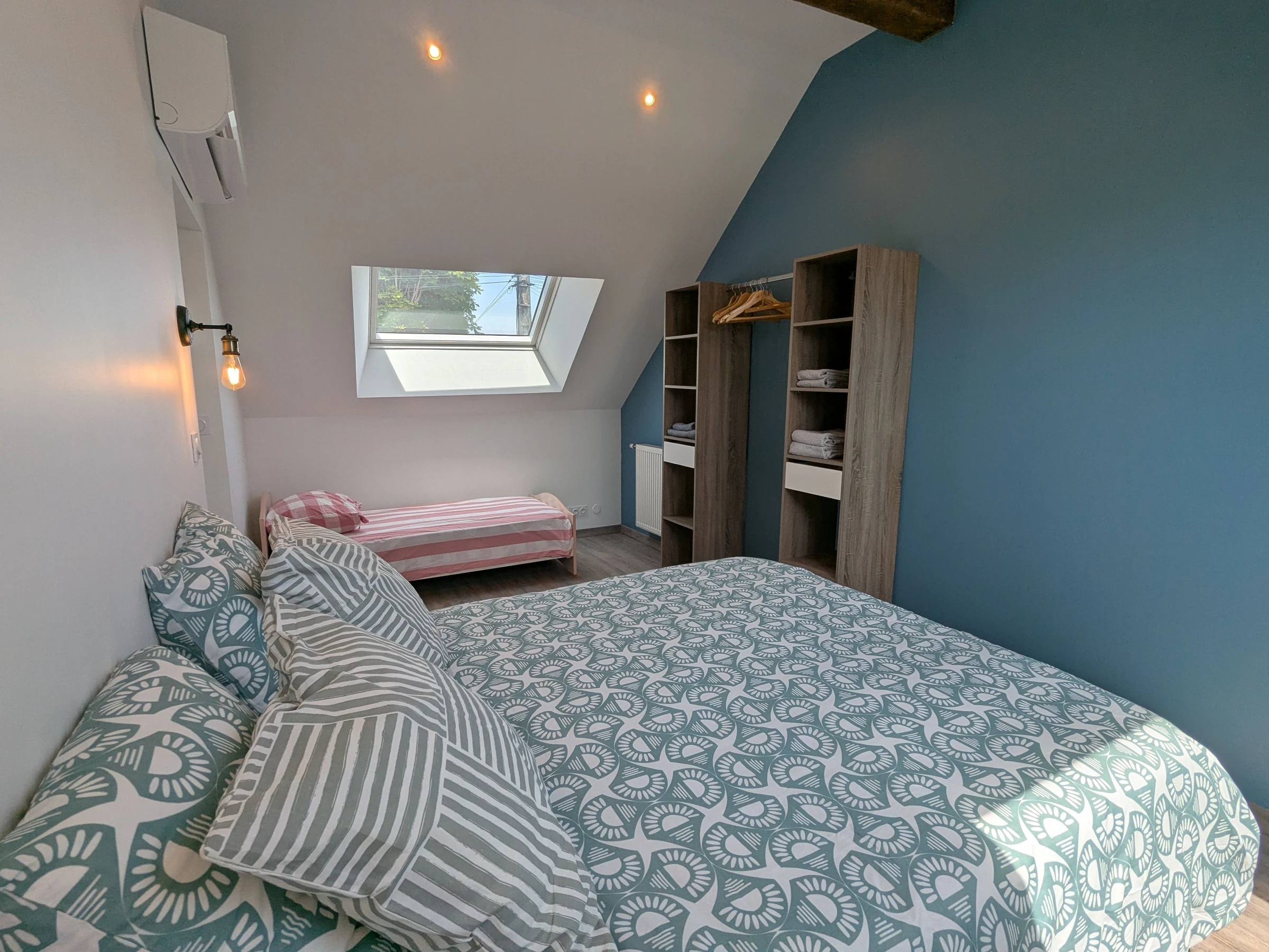 A l'étage : une chambre avec un lit double 160x200 cm et sa salle d'eau ouverte privative, une chambre avec un lit double 160x200 cm et une chambre avec un lit double 160x200 cm et un lit enfant 80x190 cm, une salle d'eau indépendante et un wc séparé.