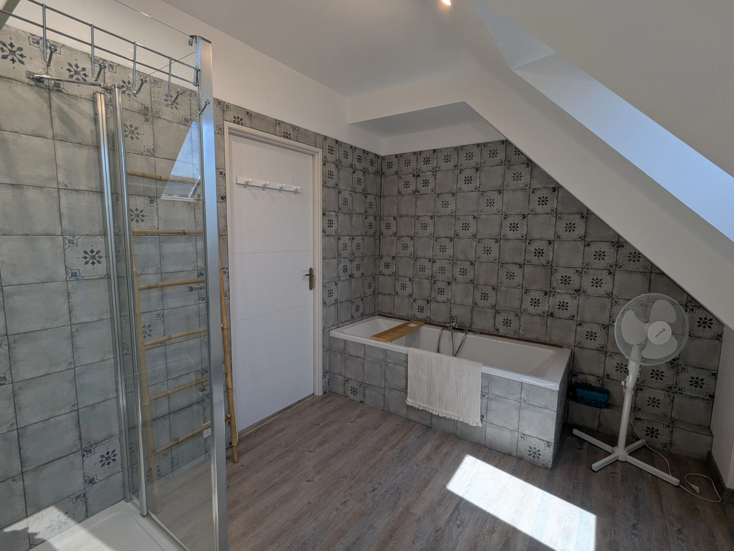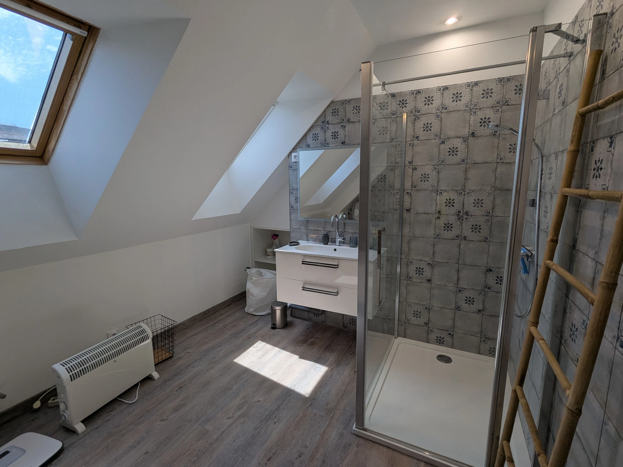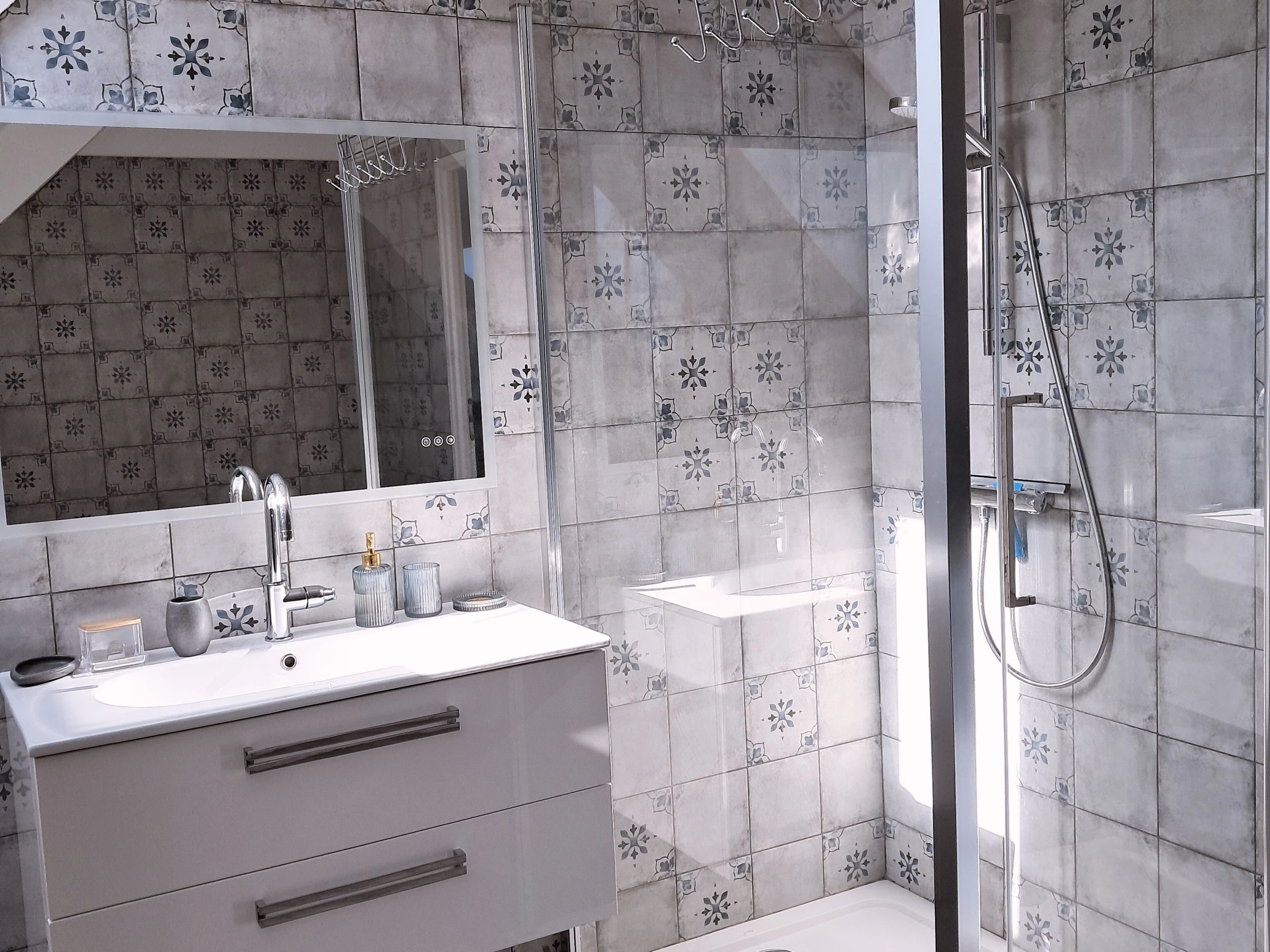A l'étage : une chambre avec un lit double 160x200 cm et sa salle d'eau ouverte privative, une chambre avec un lit double 160x200 cm et une chambre avec un lit double 160x200 cm et un lit enfant 80x190 cm, une salle d'eau indépendante et un wc séparé.