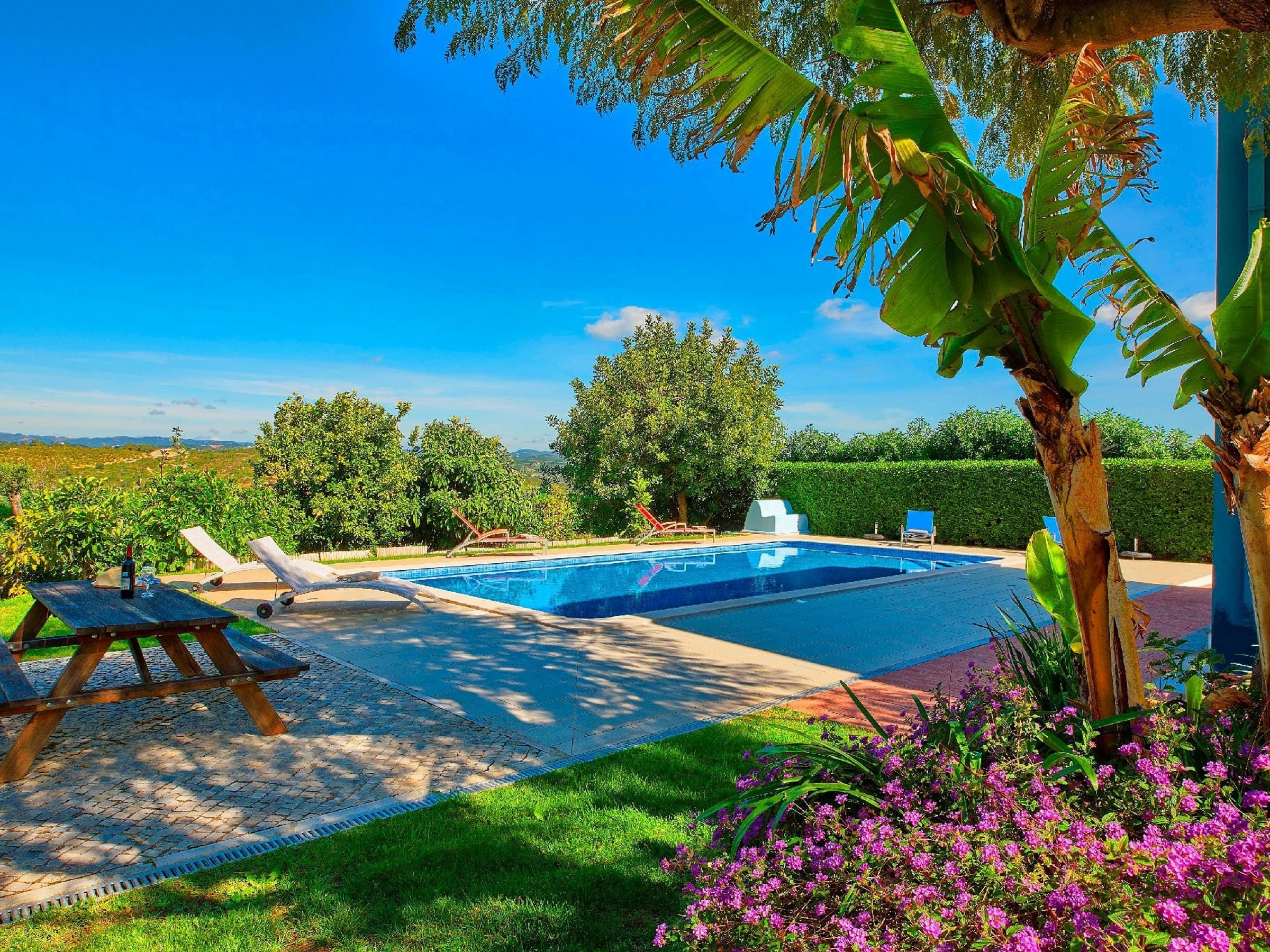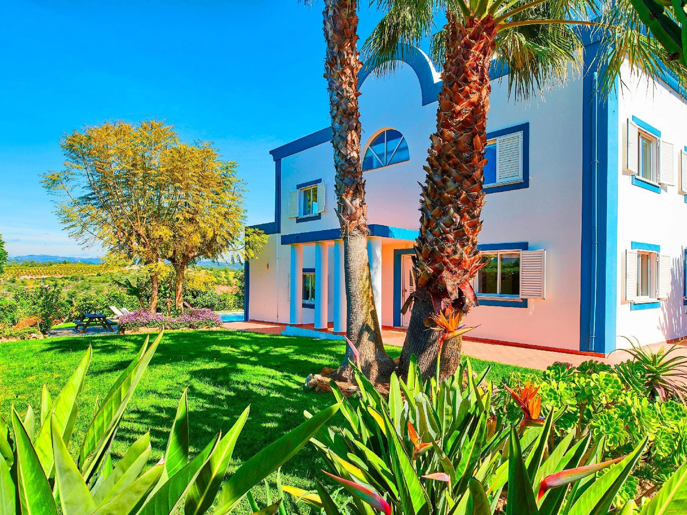 EXTÉRIEUR – Depuis l'entrée sécurisée et grillagée, des jardins herbeux entourent la villa, parsemés de plantes colorées et d'arbustes méditerranéens attrayants. Un chemin latéral mène à la magnifique piscine avec des transats et des vues panoramiques sur les collines de Tavira, ravissant les amateurs de soleil avec son orientation nord qui capture le soleil toute la journée, complétée par des patios ombragés au bord de la piscine pour ceux qui cherchent un refuge contre la chaleur.