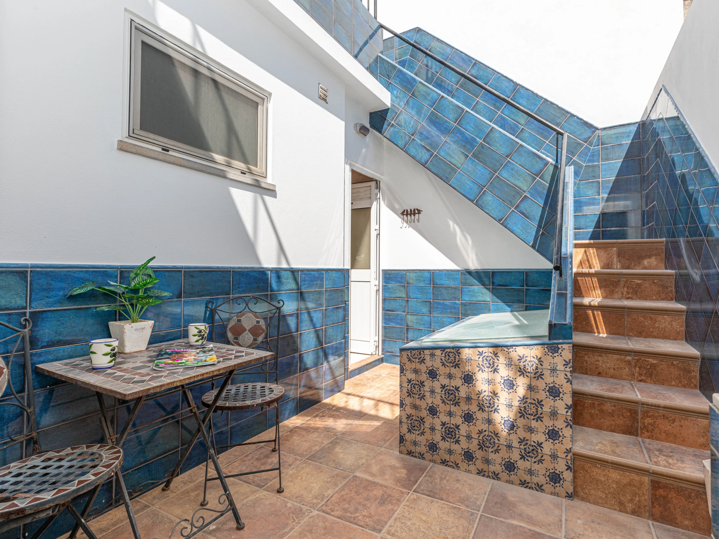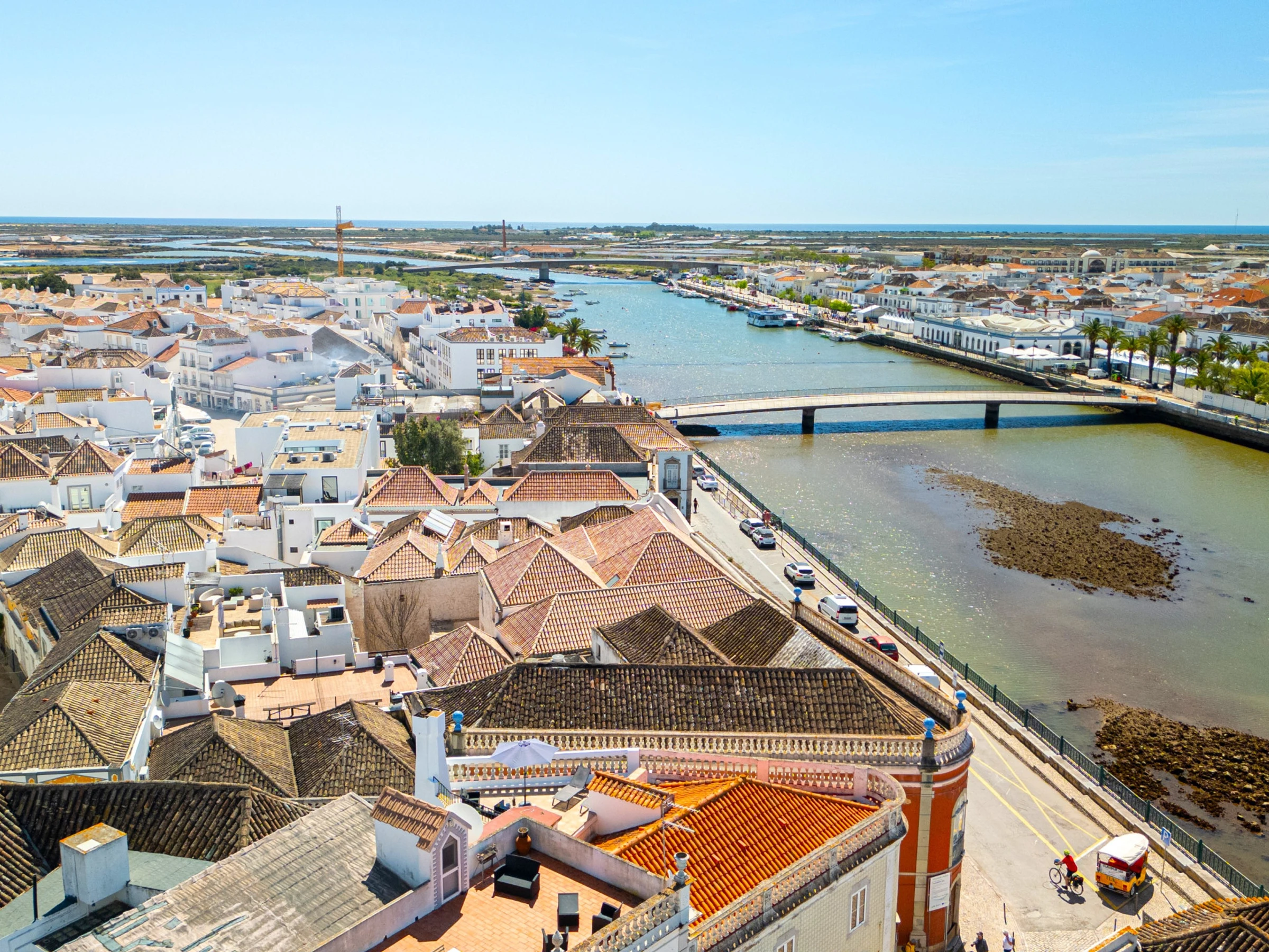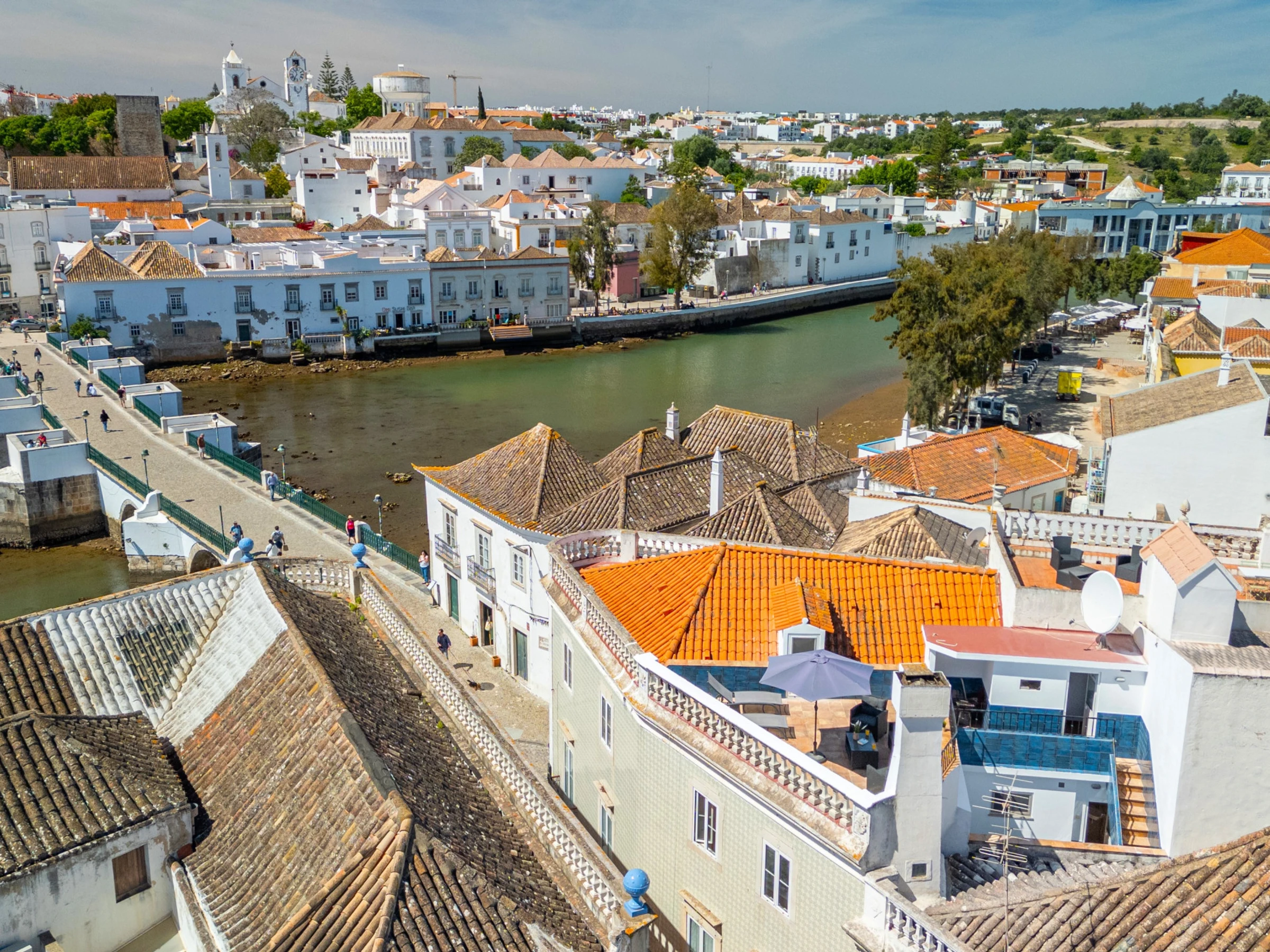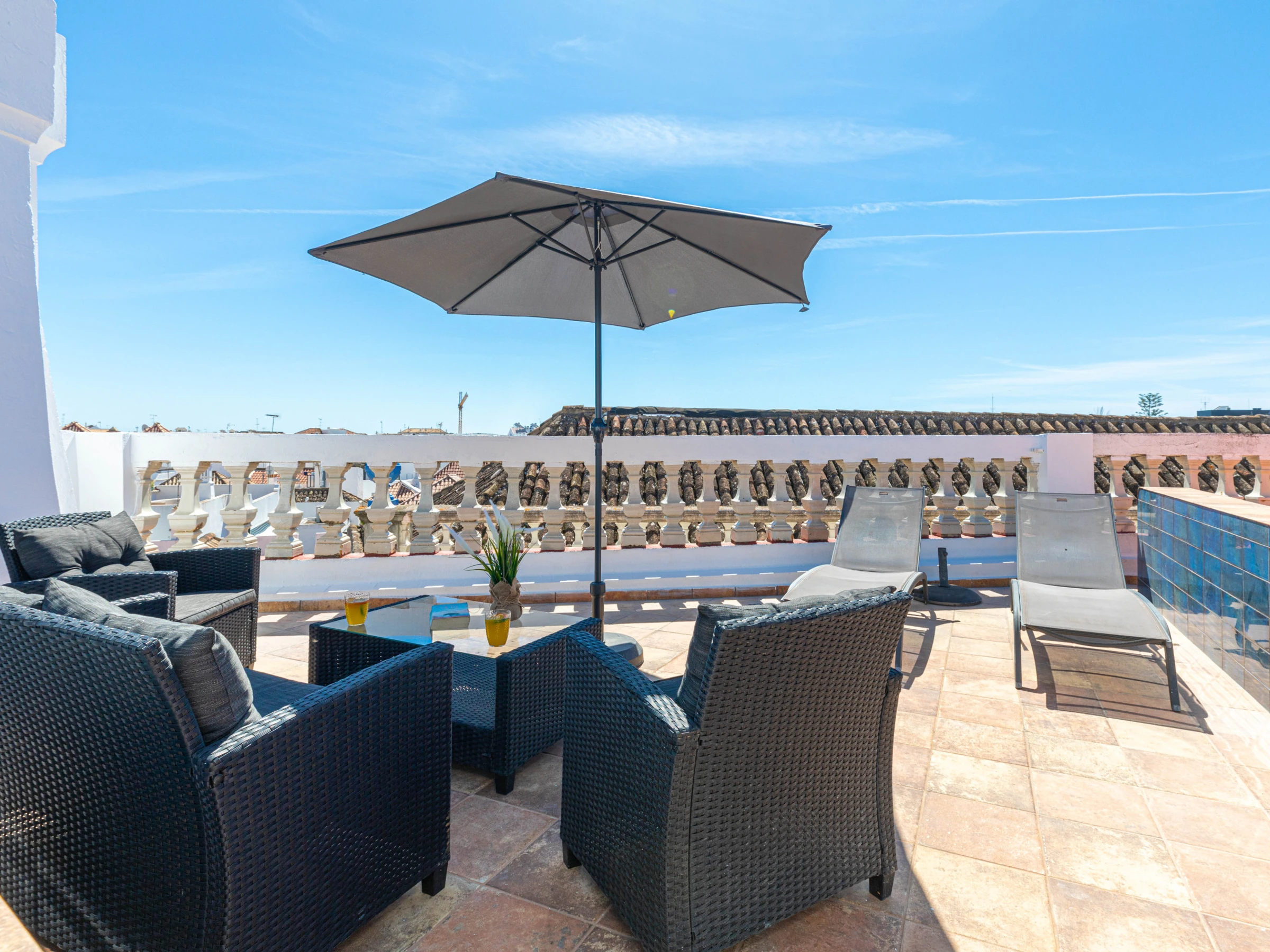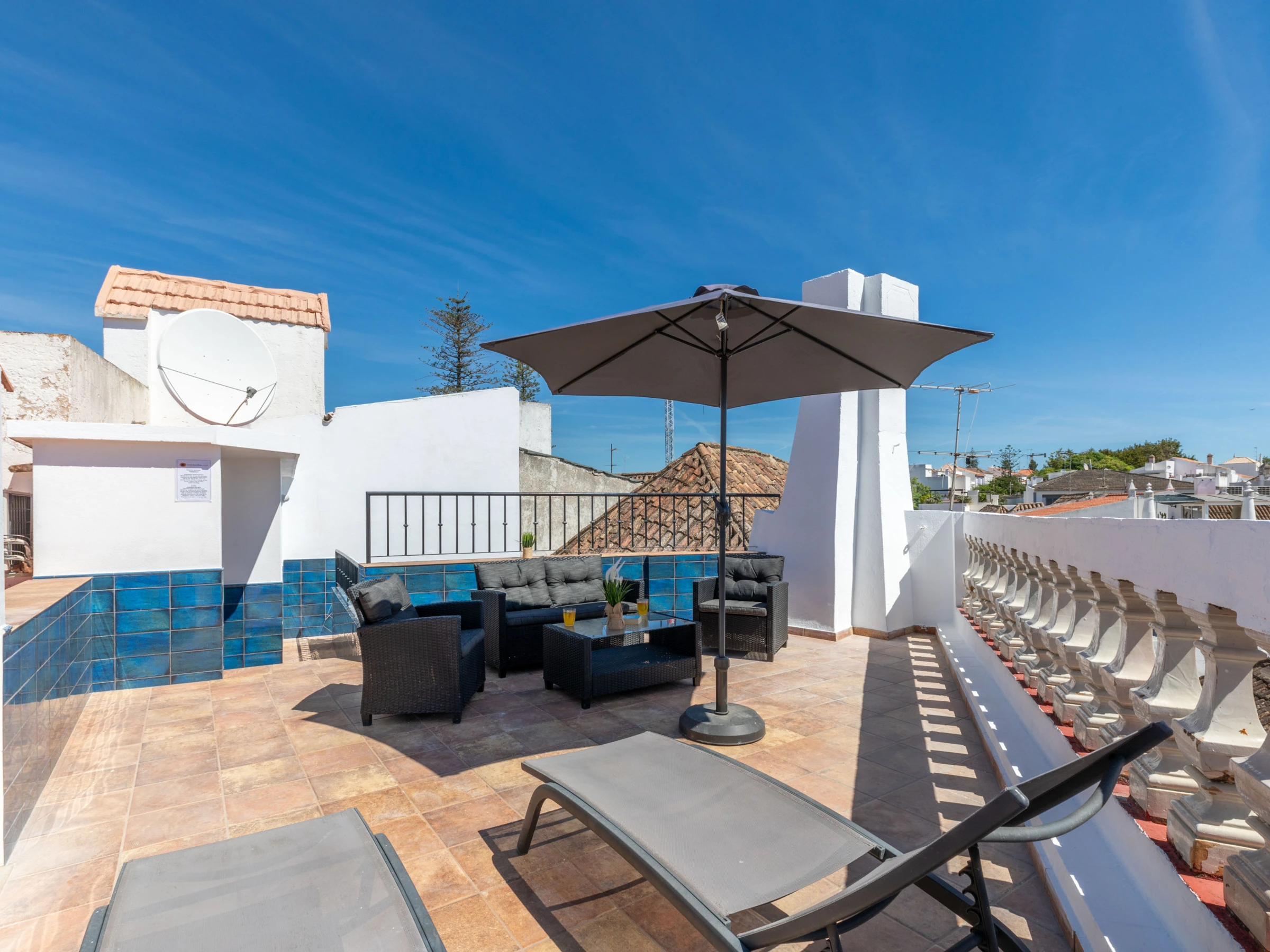 Sortez de la cuisine vers une terrasse ombragée avec une table de bistrot et des chaises, un point de petit-déjeuner parfait offrant un répit du soleil. Et pendant ce temps, les amateurs de soleil peuvent emprunter les escaliers pour profiter de la merveilleuse terrasse ensoleillée et se détendre sur les transats, ou choisir de s'installer sur l'un des canapés confortables pour lire un livre ou profiter d'un ou deux verres ! Les vues panoramiques offrent un superbe toile de fond de ville à travers les toits taviranais s'étendant majestueusement jusqu'à la mer.