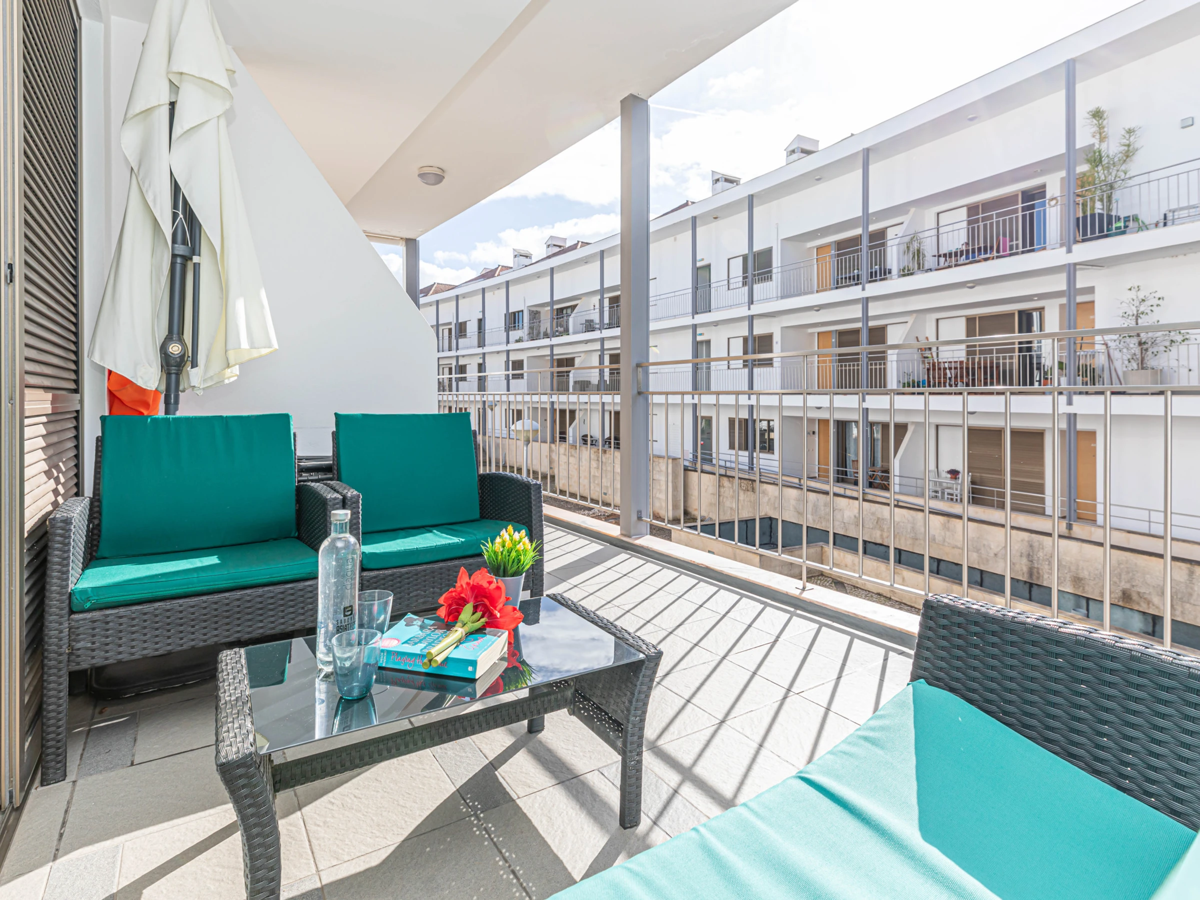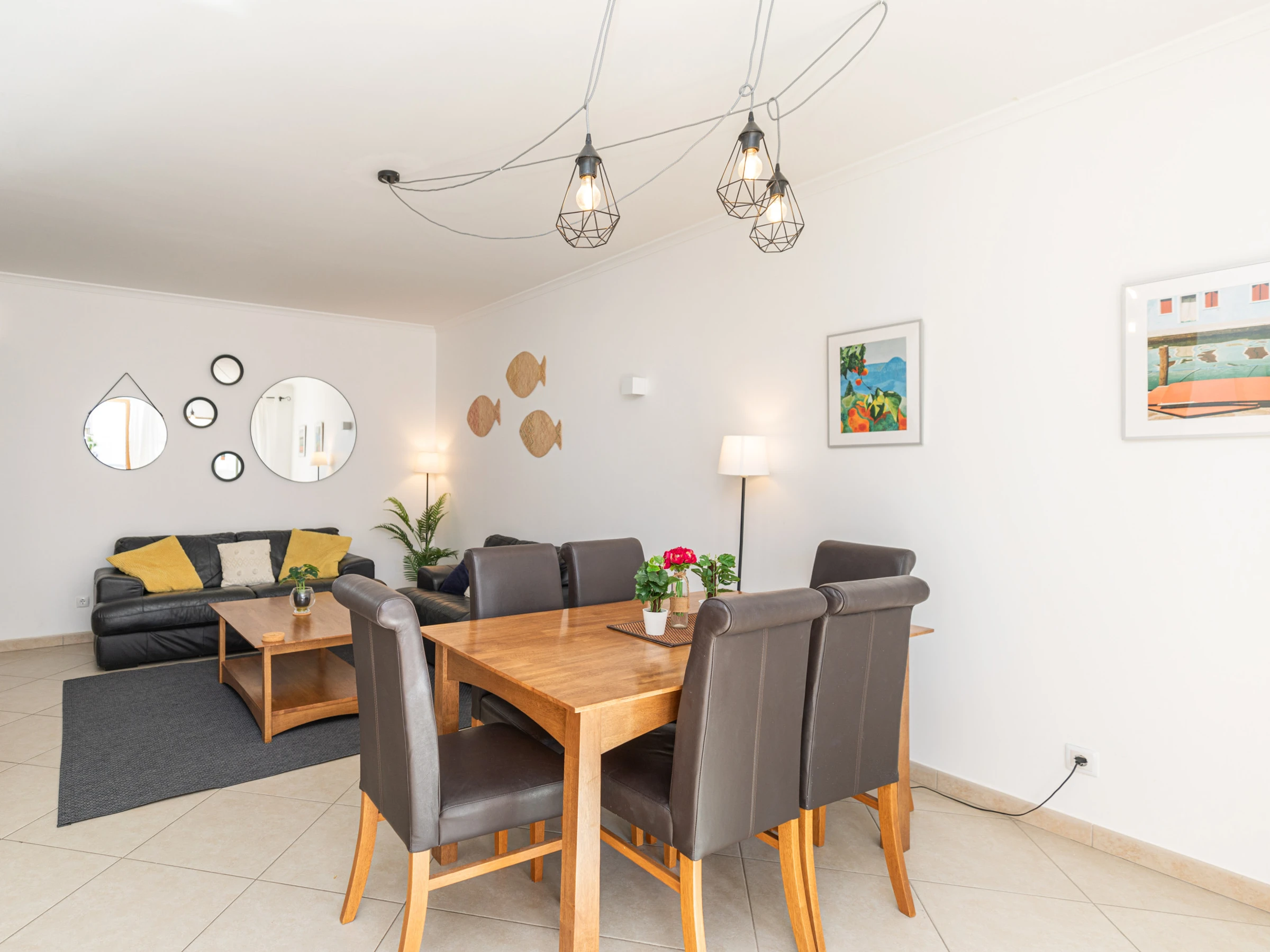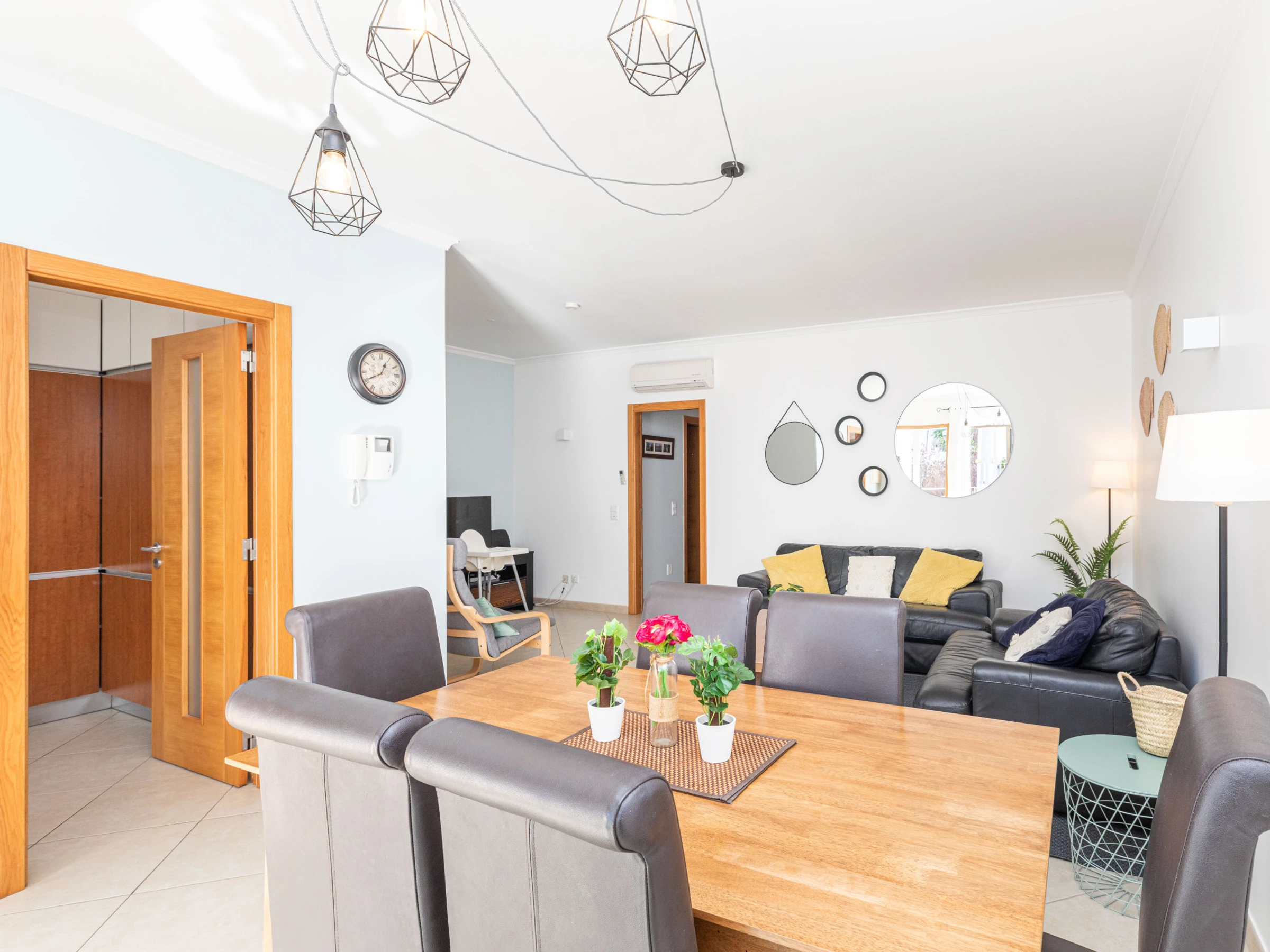La décoration intérieure lumineuse offre à ses visiteurs un séjour confortable. Avec une disposition sur un seul niveau, le logement s'écoule facilement de l'avant à l'arrière. Dès l'entrée, vous êtes accueilli dans le salon-salle à manger ouvert avec des meubles aux tons bruns, combinés à des accessoires vibrants soigneusement sélectionnés et disposés çà et là pour ajouter une touche de couleur. Soigneusement rangés à l'arrière de l'appartement se trouvent 2 chambres, 1 double et 1 twin, partageant une salle de bain généreusement dimensionnée avec baignoire et douche suspendue. La cuisine spacieuse est bien équipée et agréablement aménagée avec des appareils intégrés, dont un lave-vaisselle et un lave-linge. La position exposée au sud de l'appartement permet de profiter d'après-midis ensoleillés sur l'un des canapés confortables juste à l'extérieur du salon, idéal pour une sieste après une longue journée à la plage ! Situé dans le condominium sécurisé de Horta Poço do Bispo, les enfants peuvent se rendre au petit parc de jeux ou à la piscine pour s'amuser.