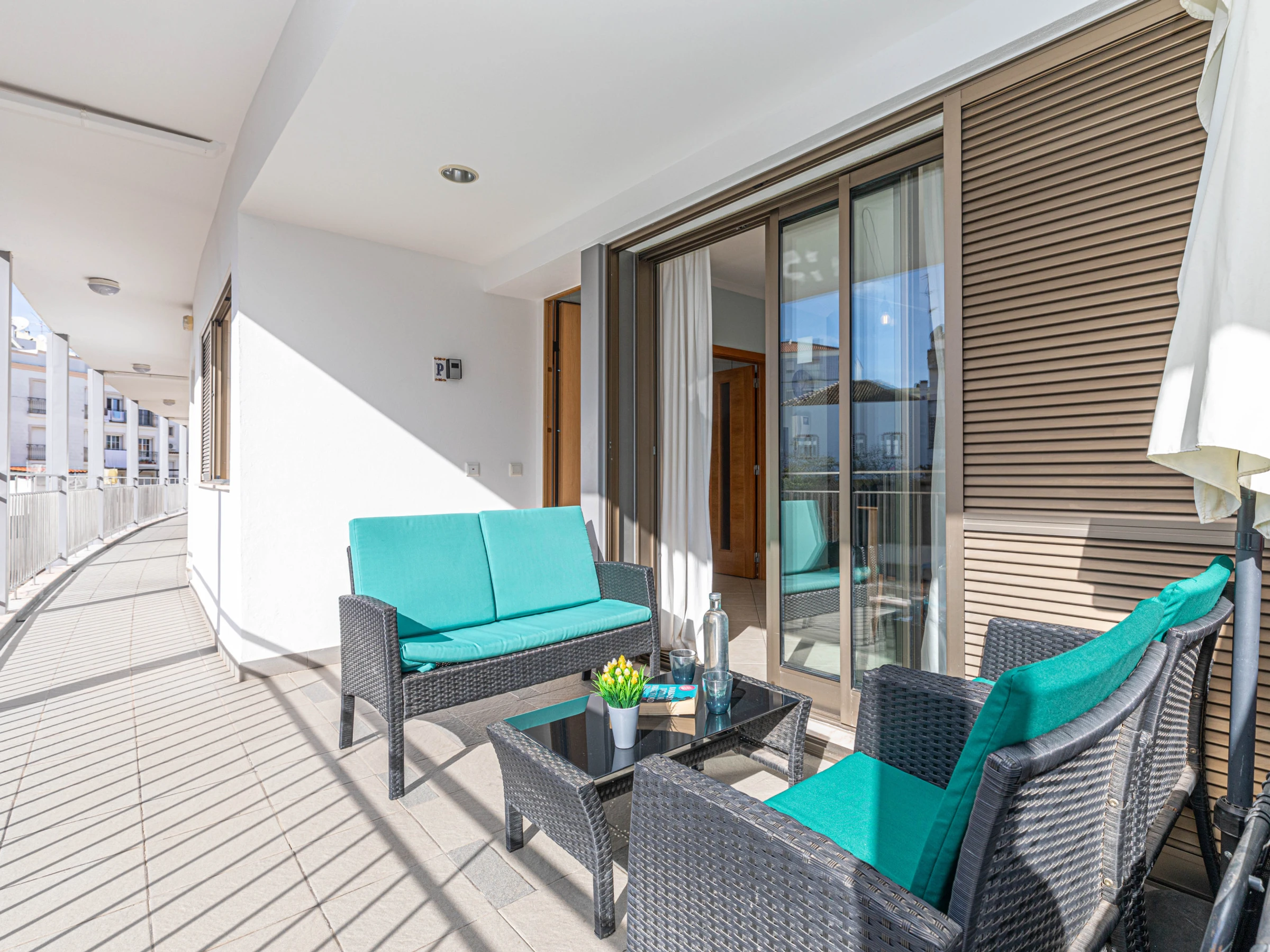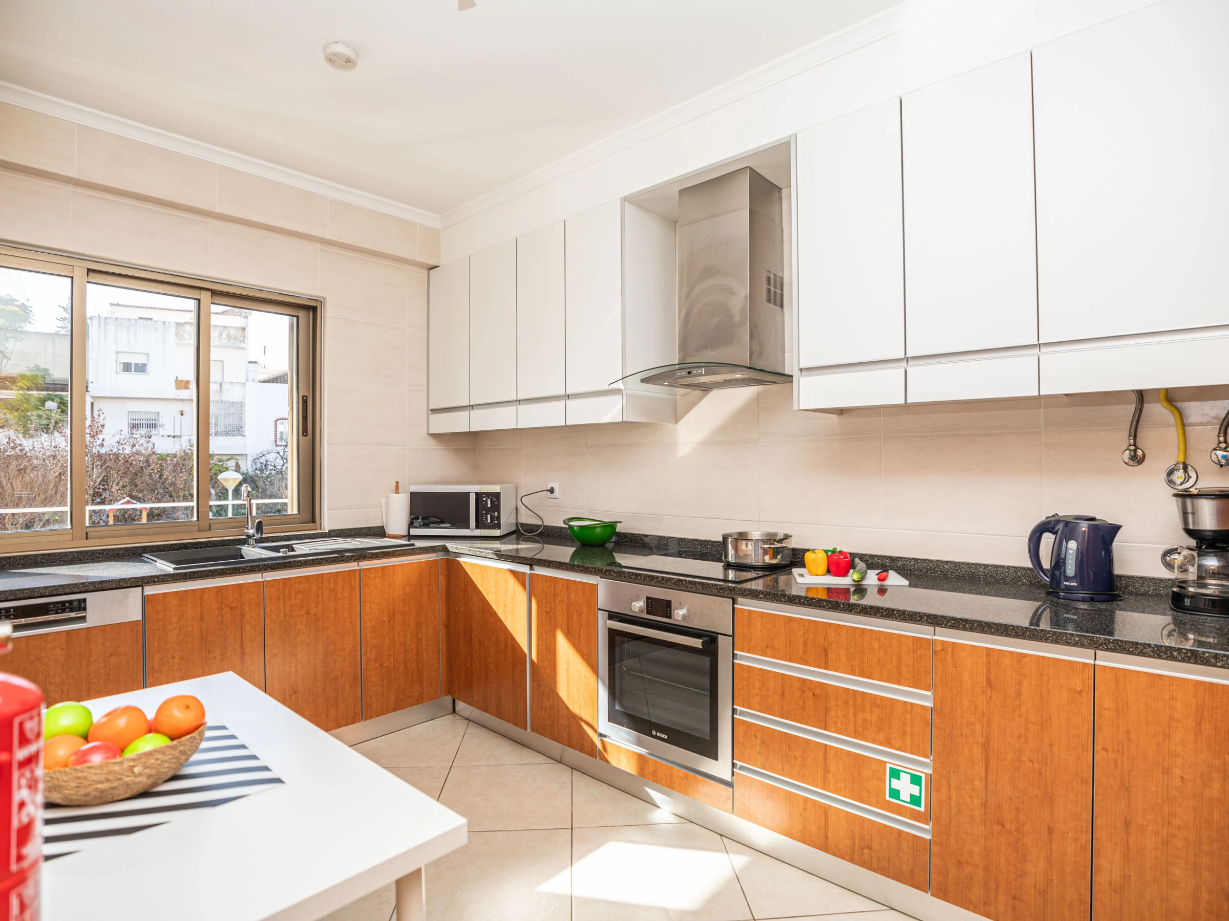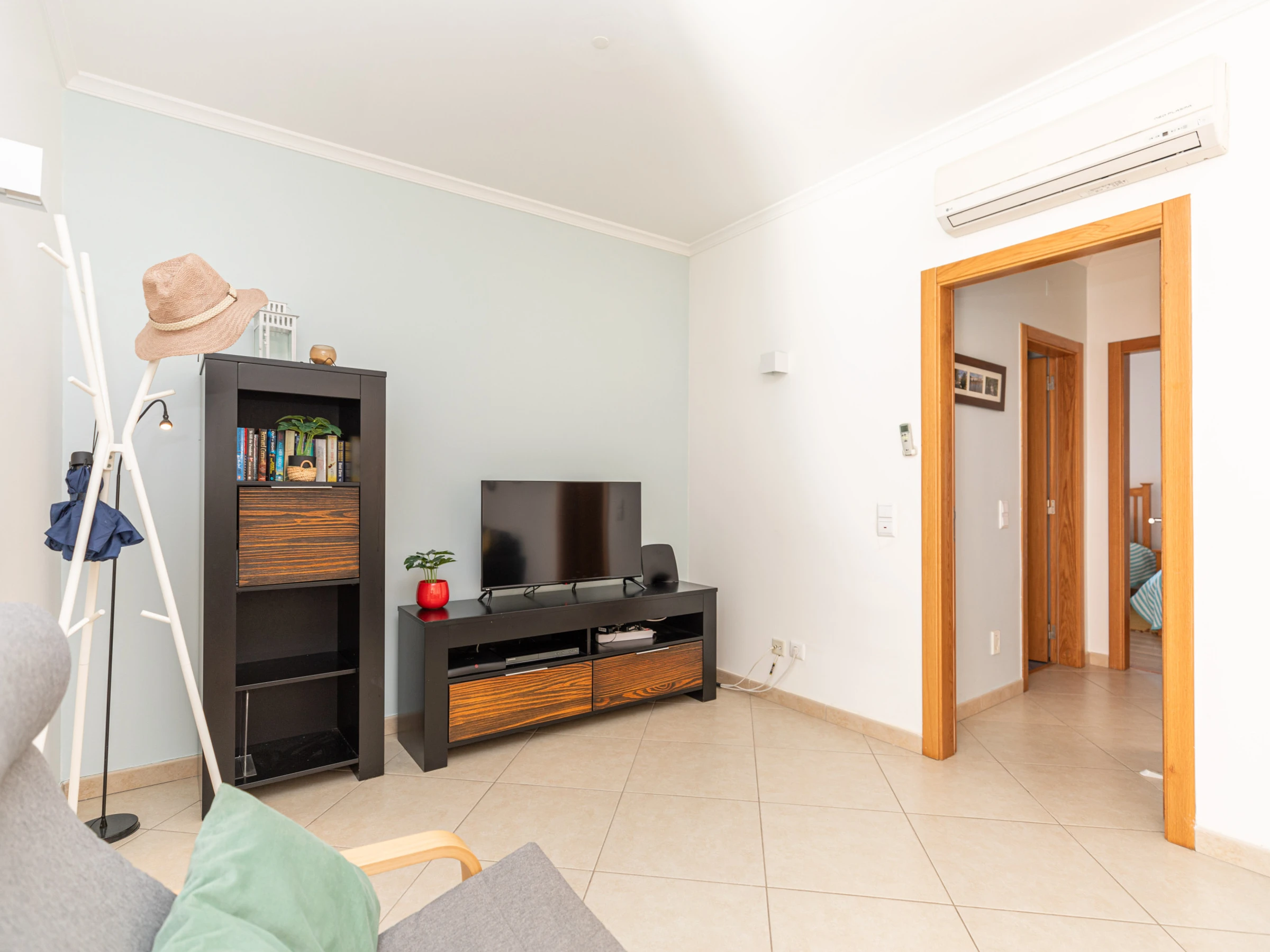 La décoration intérieure lumineuse offre à ses visiteurs un séjour confortable. Avec une disposition sur un seul niveau, le logement s'écoule facilement de l'avant à l'arrière. Dès l'entrée, vous êtes accueilli dans le salon-salle à manger ouvert avec des meubles aux tons bruns, combinés à des accessoires vibrants soigneusement sélectionnés et disposés çà et là pour ajouter une touche de couleur. Soigneusement rangés à l'arrière de l'appartement se trouvent 2 chambres, 1 double et 1 twin, partageant une salle de bain généreusement dimensionnée avec baignoire et douche suspendue. La cuisine spacieuse est bien équipée et agréablement aménagée avec des appareils intégrés, dont un lave-vaisselle et un lave-linge. La position exposée au sud de l'appartement permet de profiter d'après-midis ensoleillés sur l'un des canapés confortables juste à l'extérieur du salon, idéal pour une sieste après une longue journée à la plage ! Situé dans le condominium sécurisé de Horta Poço do Bispo, les enfants peuvent se rendre au petit parc de jeux ou à la piscine pour s'amuser.