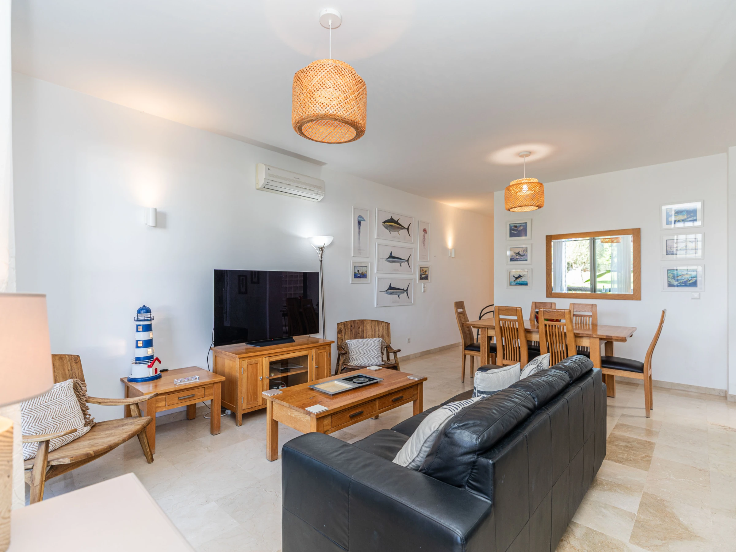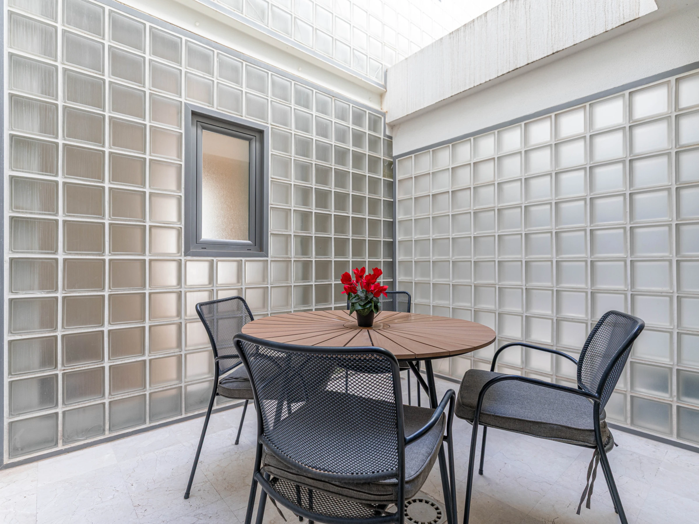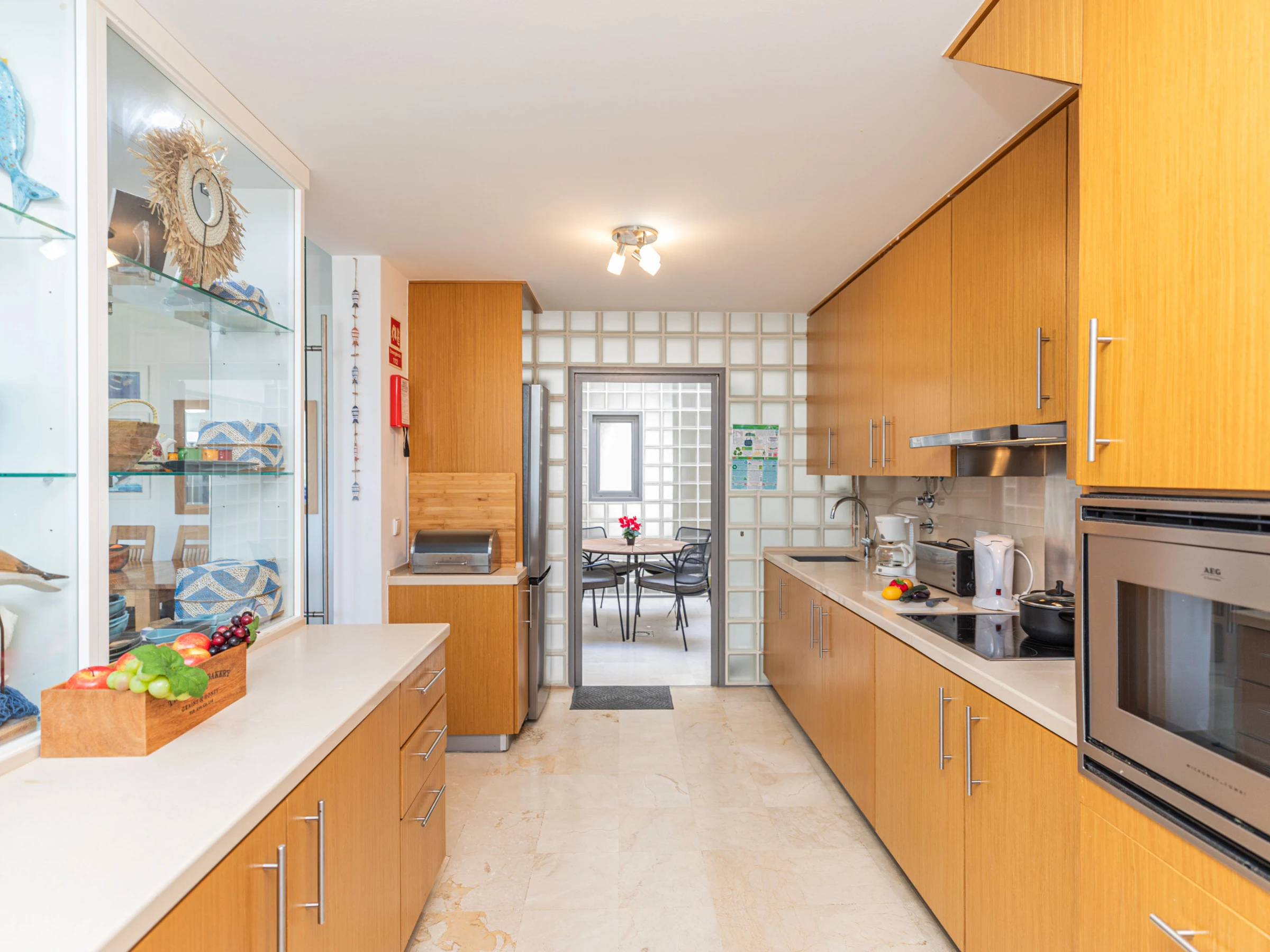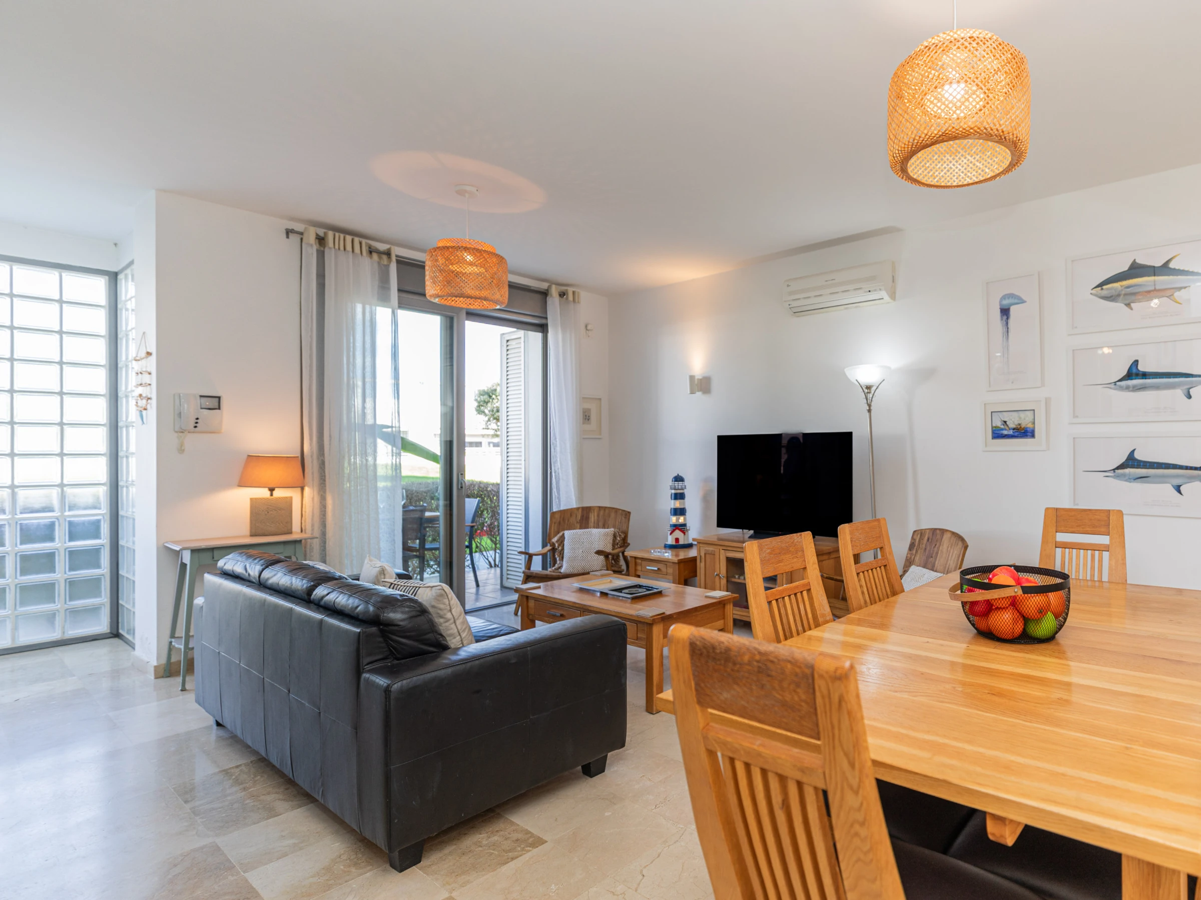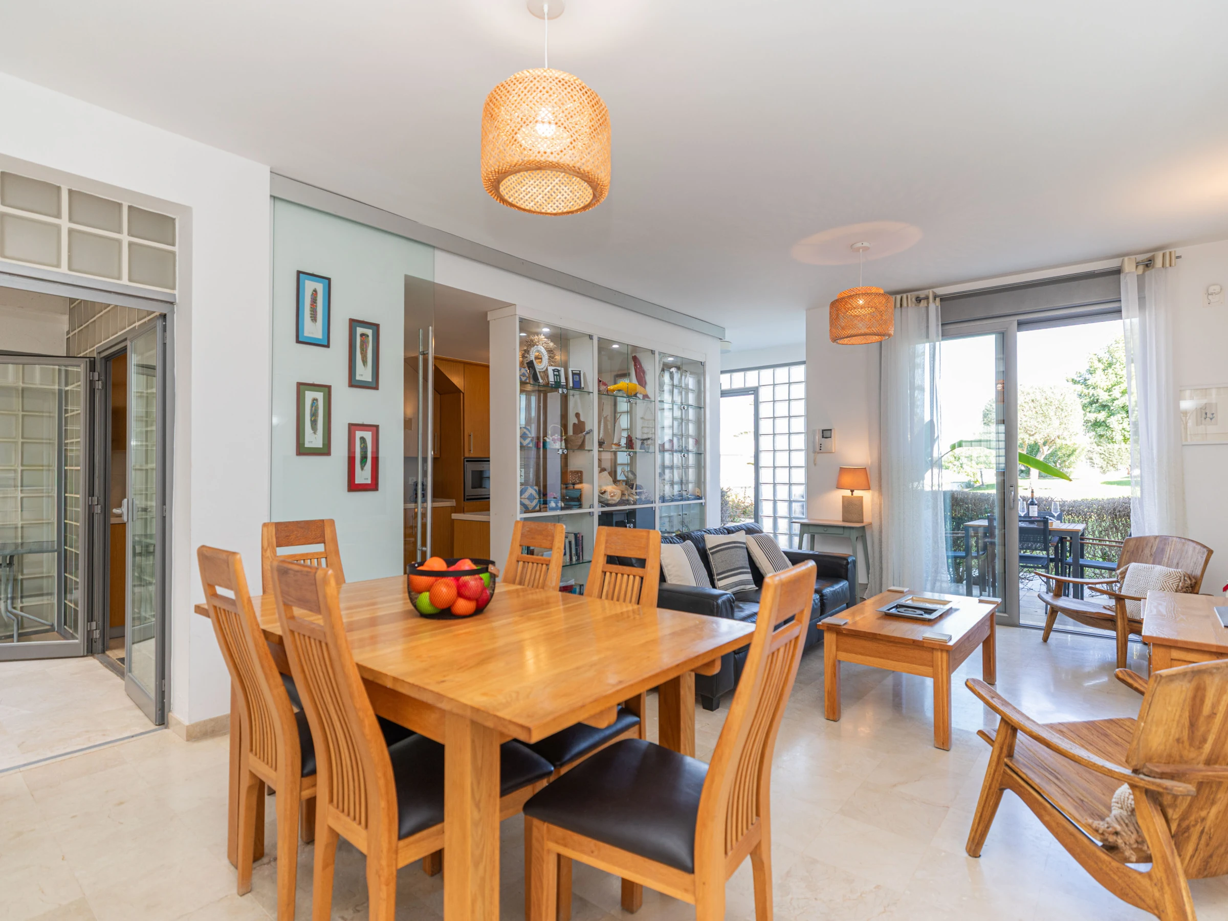 L'intérieur chaleureux offre aux visiteurs un séjour confortable. Avec une disposition sur un seul niveau, le logement s'écoule facilement d'avant en arrière. À l'entrée, vous êtes accueilli dans le salon-salle à manger, avec des sièges confortables et des meubles en chêne clair assortis, comprenant une table à manger rectangulaire et des chaises. Une cloison en verre attrayante sépare le salon de la cuisine, où un large éventail d'ustensiles et d'appareils garantit que la cuisine à domicile est simple et agréable. Nichée joliment à l'arrière de la cuisine, une porte mène à un atrium interne privé avec une table et des chaises, parfait pour les petits-déjeuners frais ou les dîners du soir au chaud. L'appartement dispose de deux chambres : une chambre principale double avec une salle de douche privée, et une chambre adjacente avec deux lits et une salle de bain partagée comprenant une baignoire et une douche suspendue.