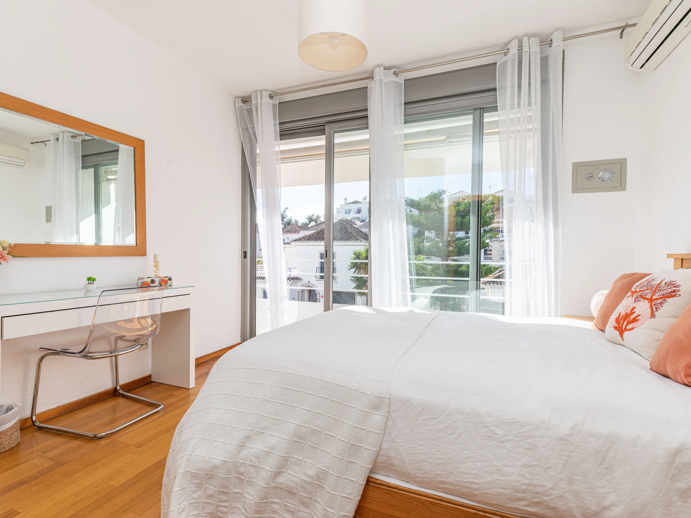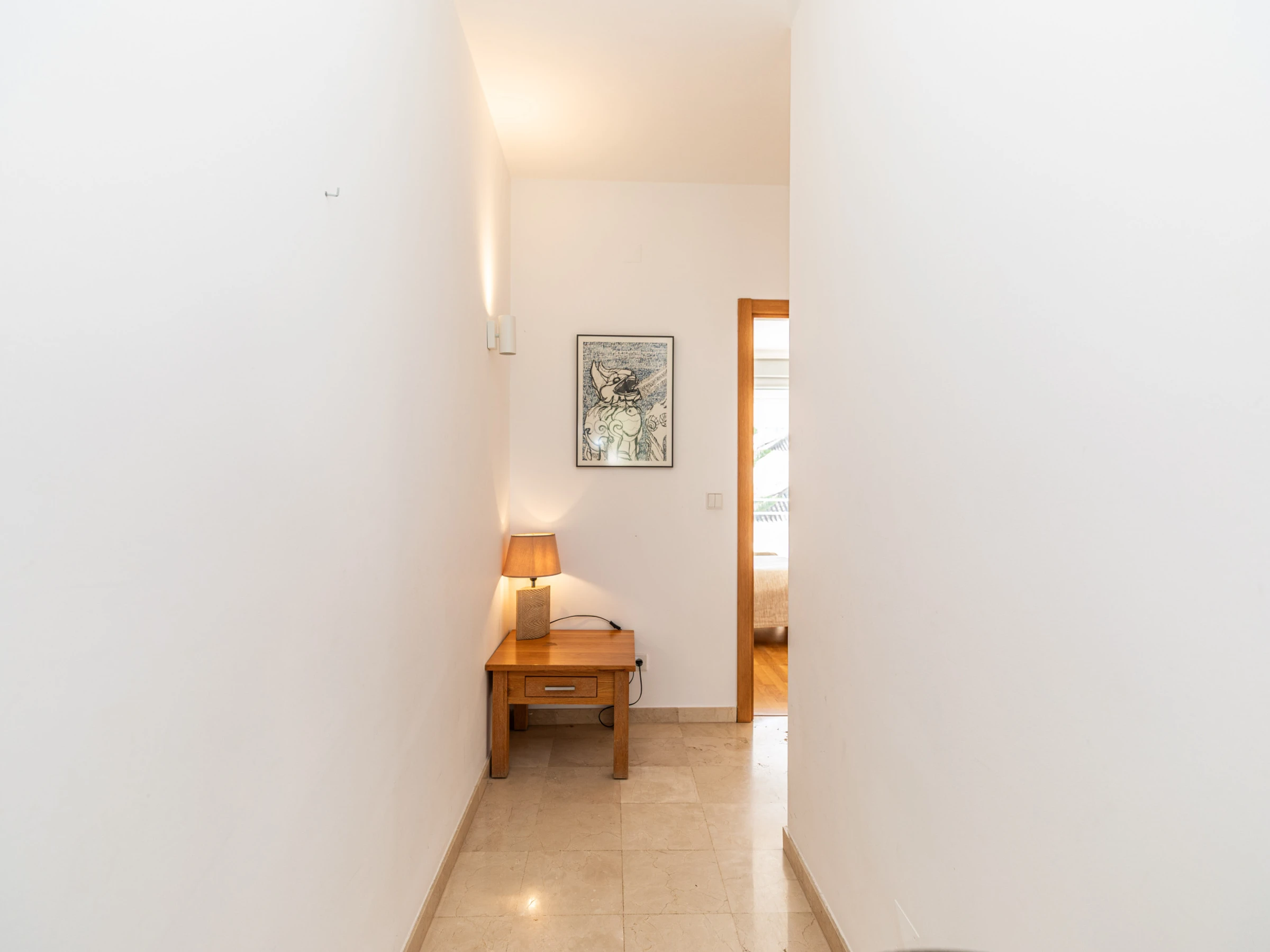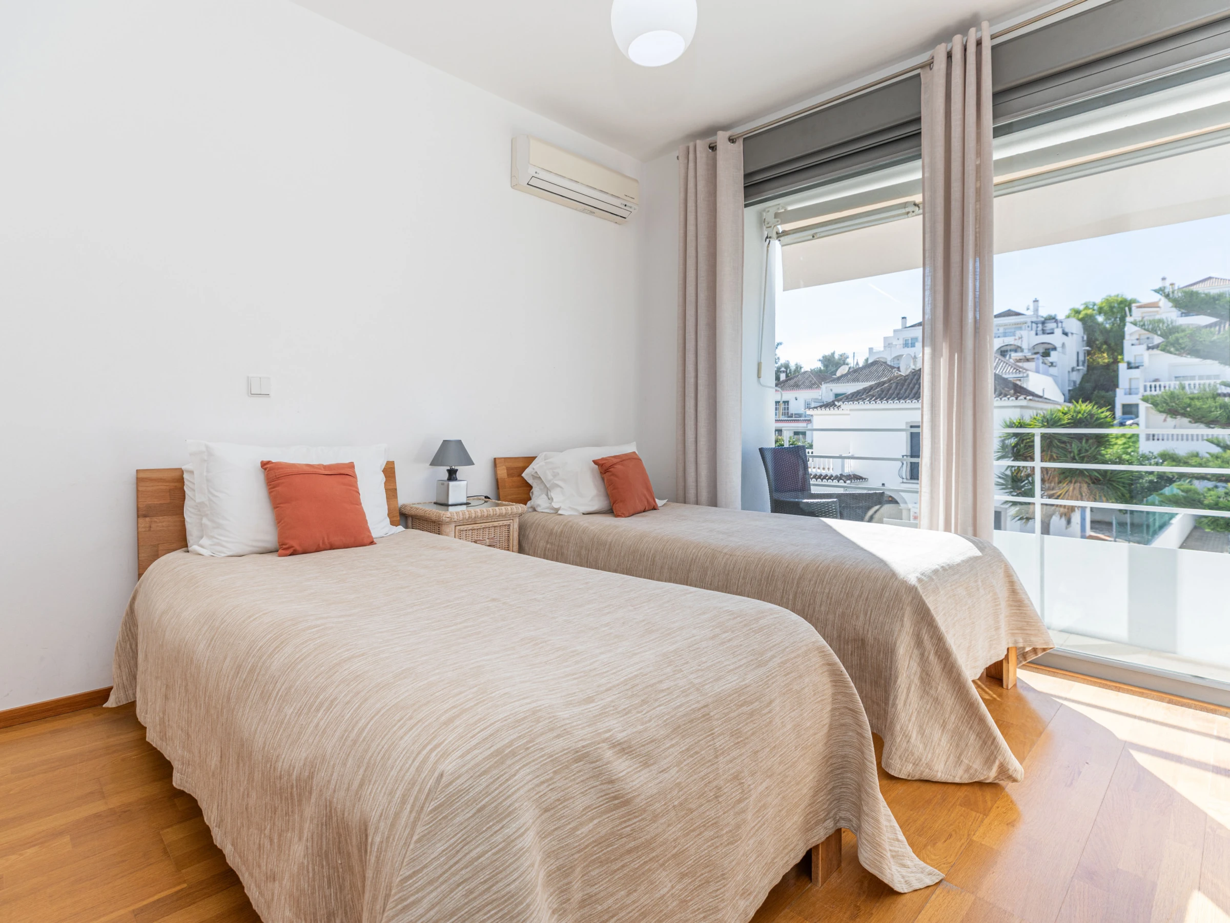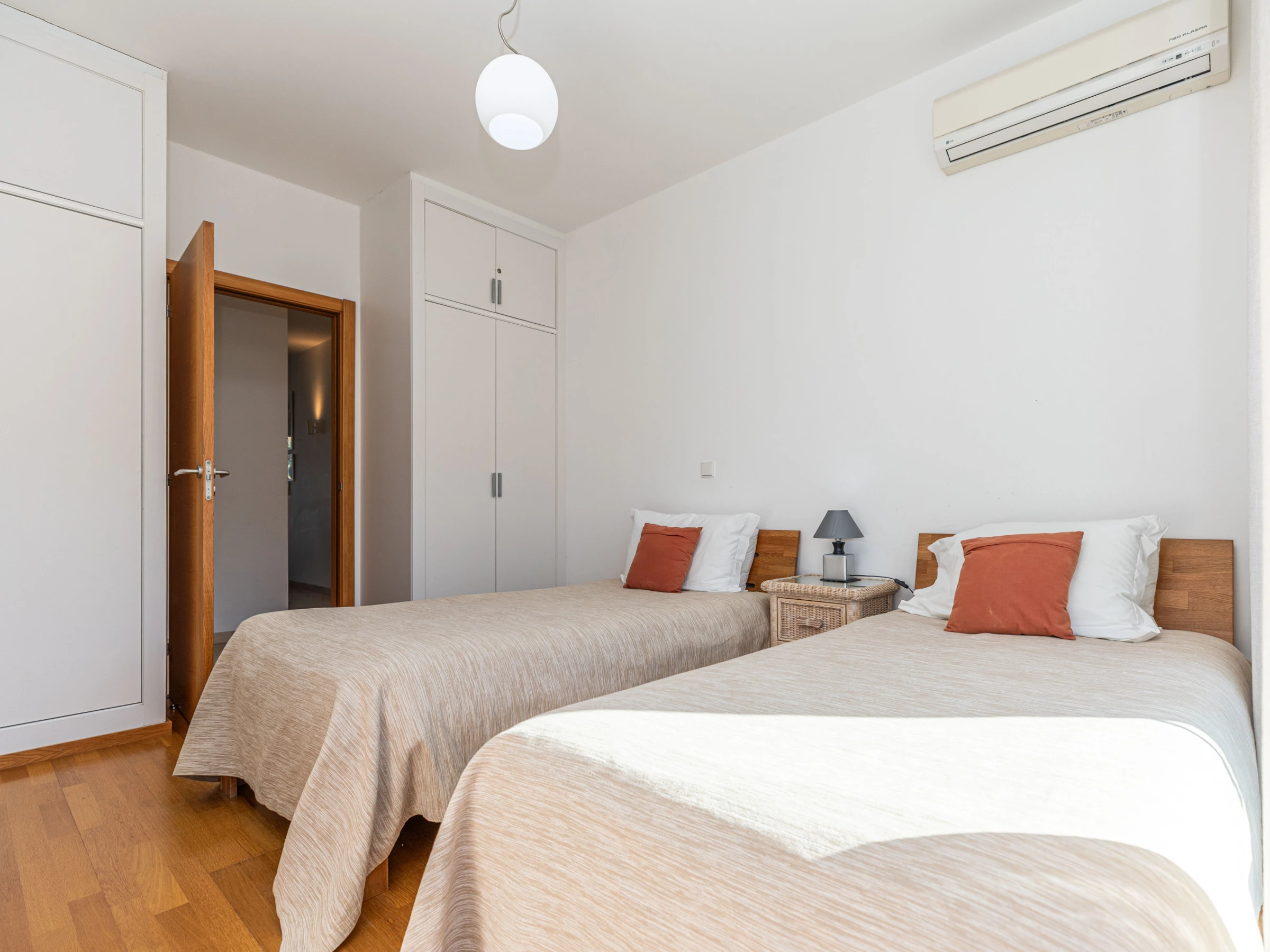 L'intérieur chaleureux offre aux visiteurs un séjour confortable. Avec une disposition sur un seul niveau, le logement s'écoule facilement d'avant en arrière. À l'entrée, vous êtes accueilli dans le salon-salle à manger, avec des sièges confortables et des meubles en chêne clair assortis, comprenant une table à manger rectangulaire et des chaises. Une cloison en verre attrayante sépare le salon de la cuisine, où un large éventail d'ustensiles et d'appareils garantit que la cuisine à domicile est simple et agréable. Nichée joliment à l'arrière de la cuisine, une porte mène à un atrium interne privé avec une table et des chaises, parfait pour les petits-déjeuners frais ou les dîners du soir au chaud. L'appartement dispose de deux chambres : une chambre principale double avec une salle de douche privée, et une chambre adjacente avec deux lits et une salle de bain partagée comprenant une baignoire et une douche suspendue.