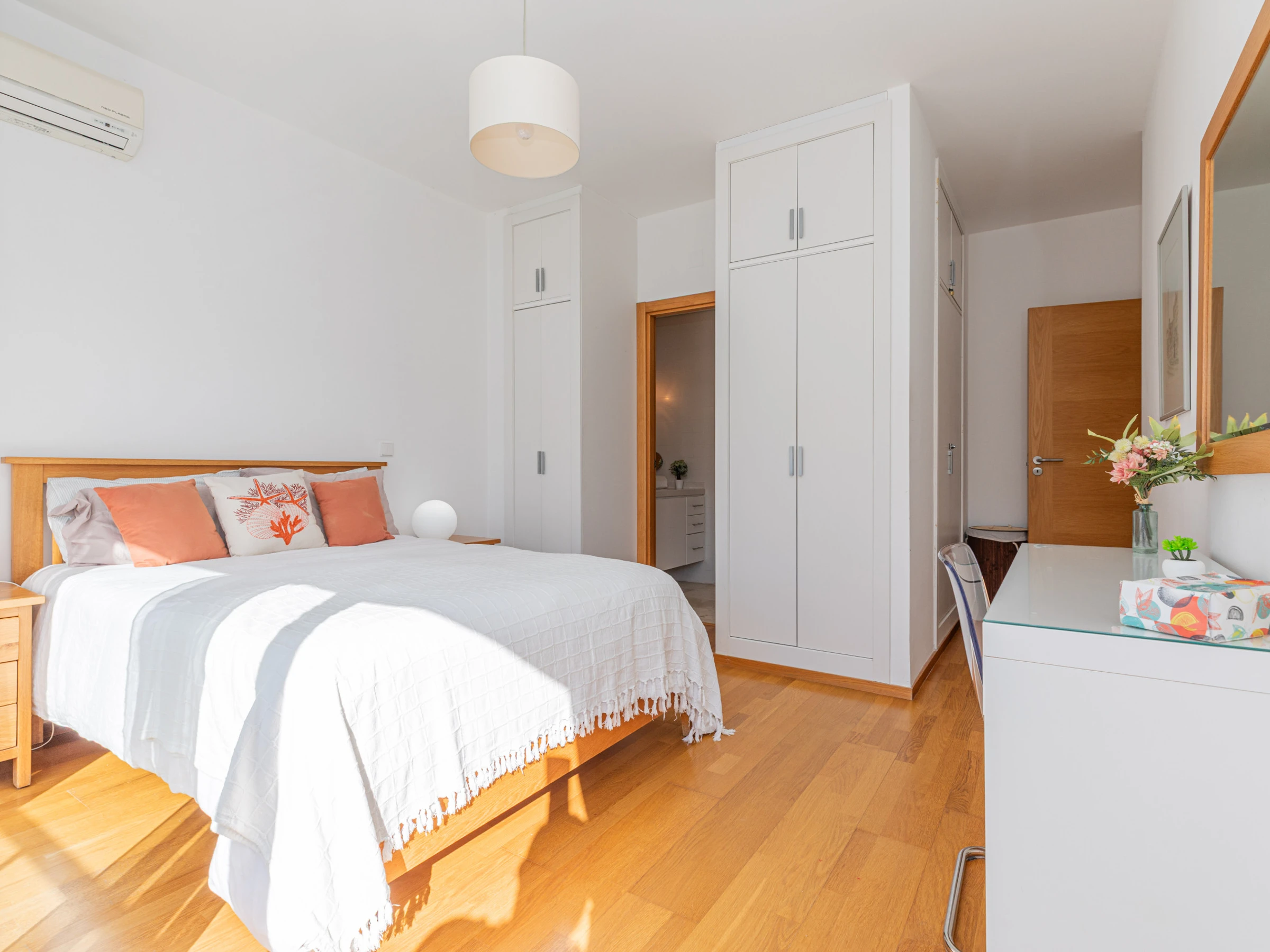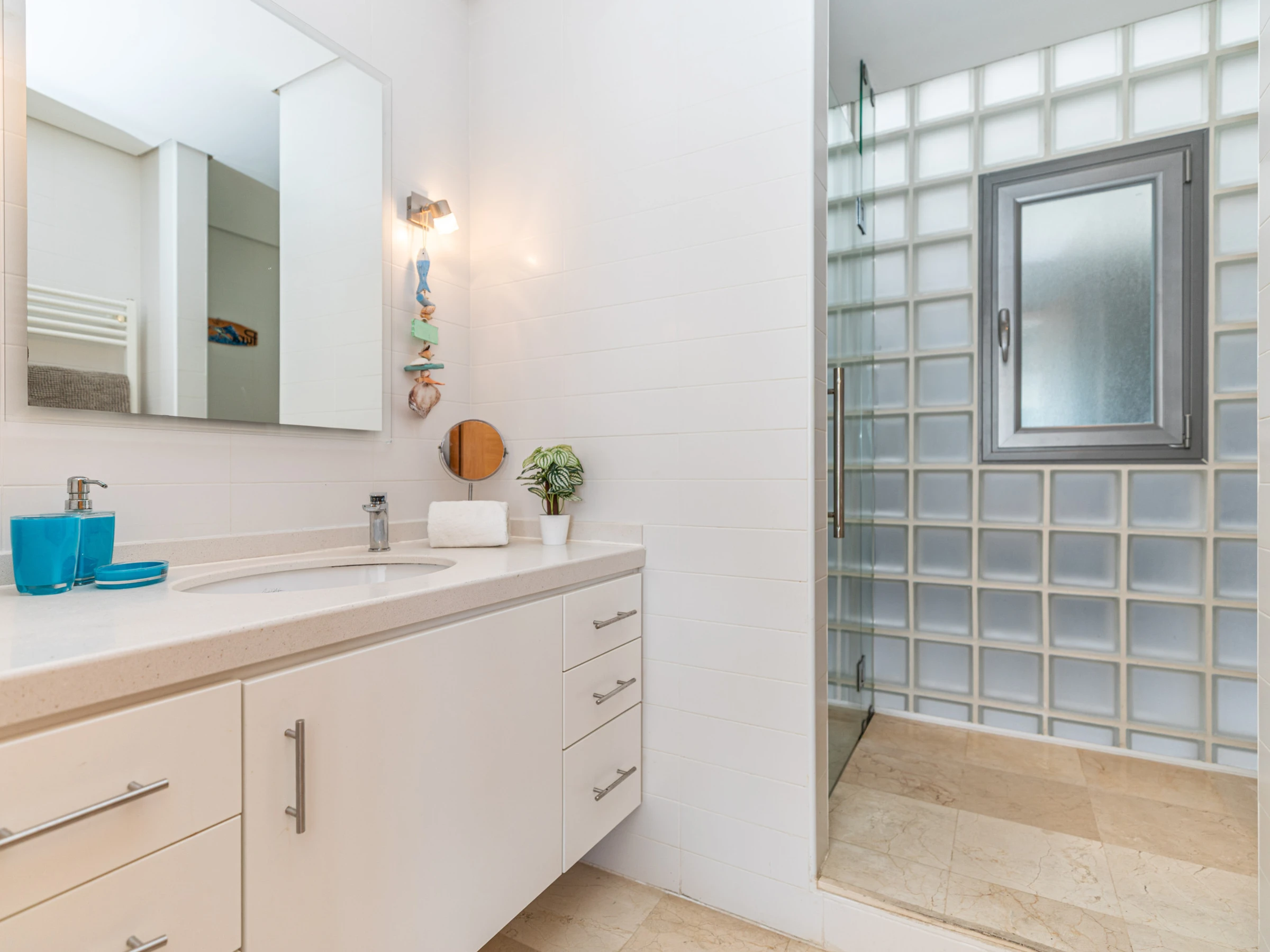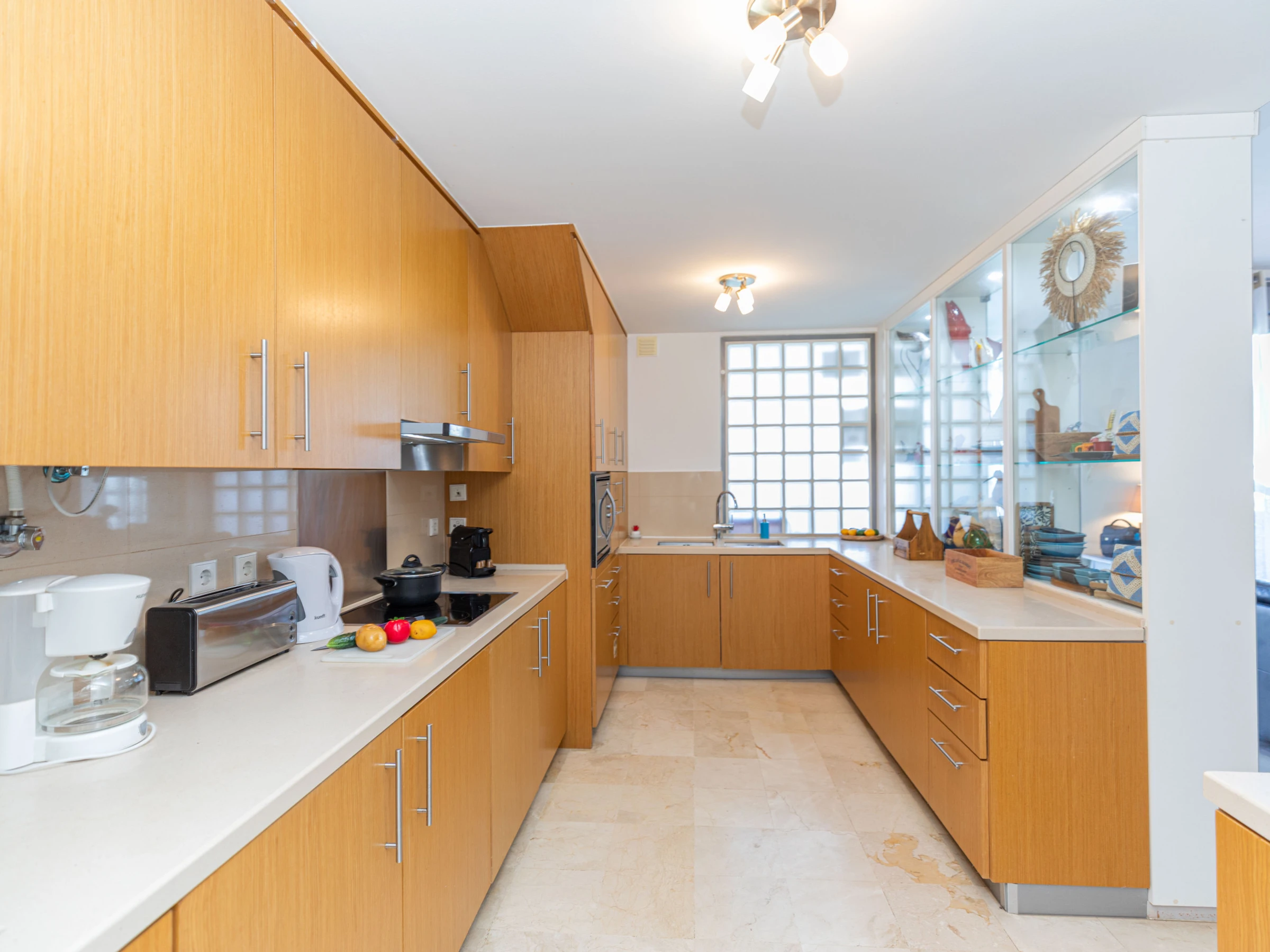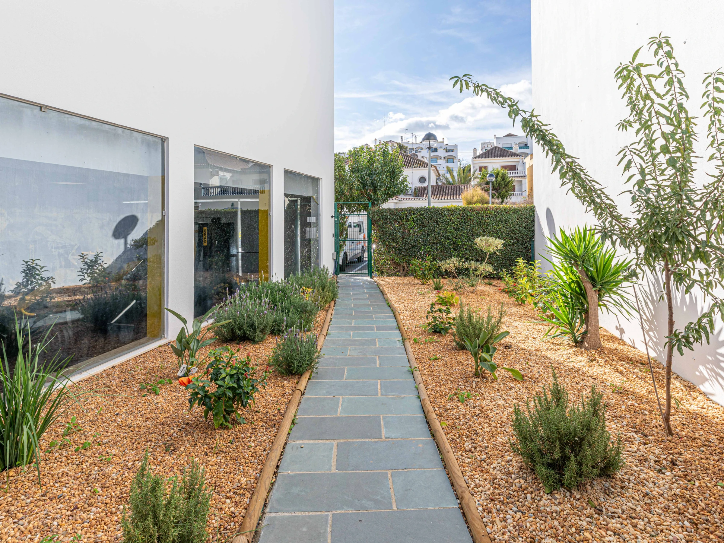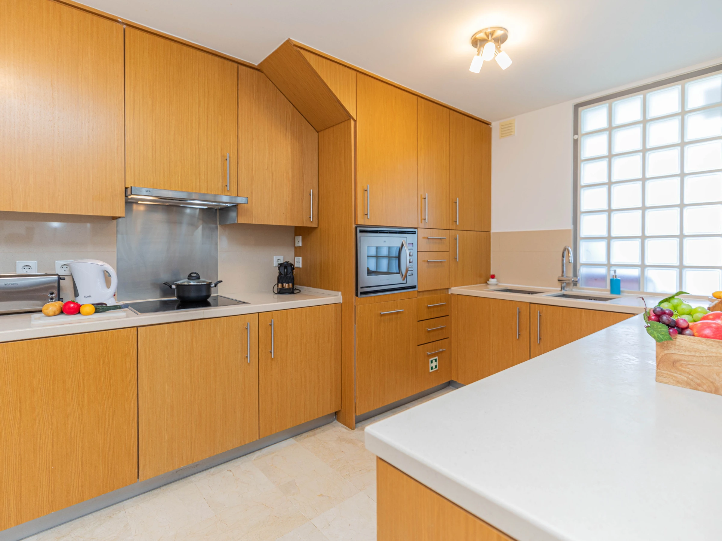 L'intérieur chaleureux offre aux visiteurs un séjour confortable. Avec une disposition sur un seul niveau, le logement s'écoule facilement d'avant en arrière. À l'entrée, vous êtes accueilli dans le salon-salle à manger, avec des sièges confortables et des meubles en chêne clair assortis, comprenant une table à manger rectangulaire et des chaises. Une cloison en verre attrayante sépare le salon de la cuisine, où un large éventail d'ustensiles et d'appareils garantit que la cuisine à domicile est simple et agréable. Nichée joliment à l'arrière de la cuisine, une porte mène à un atrium interne privé avec une table et des chaises, parfait pour les petits-déjeuners frais ou les dîners du soir au chaud. L'appartement dispose de deux chambres : une chambre principale double avec une salle de douche privée, et une chambre adjacente avec deux lits et une salle de bain partagée comprenant une baignoire et une douche suspendue.