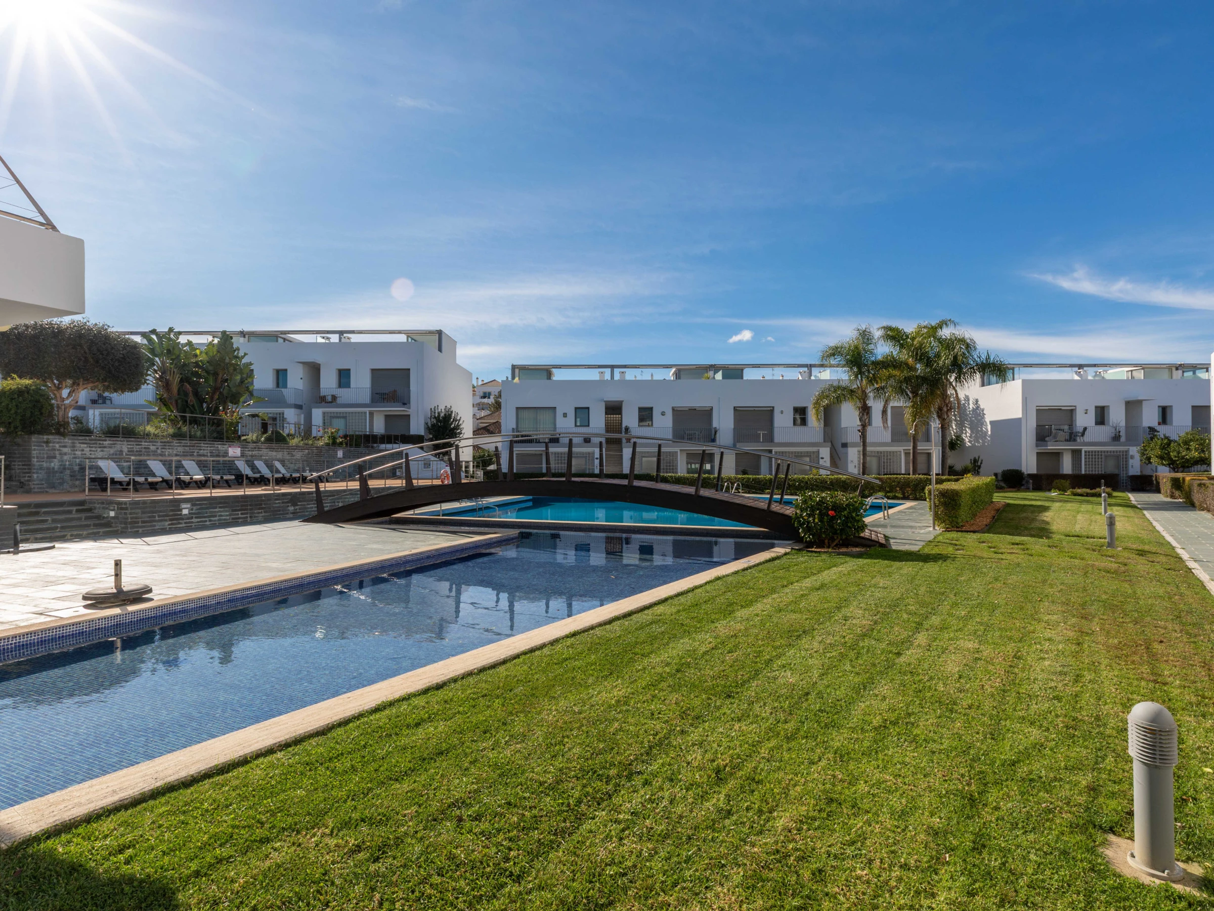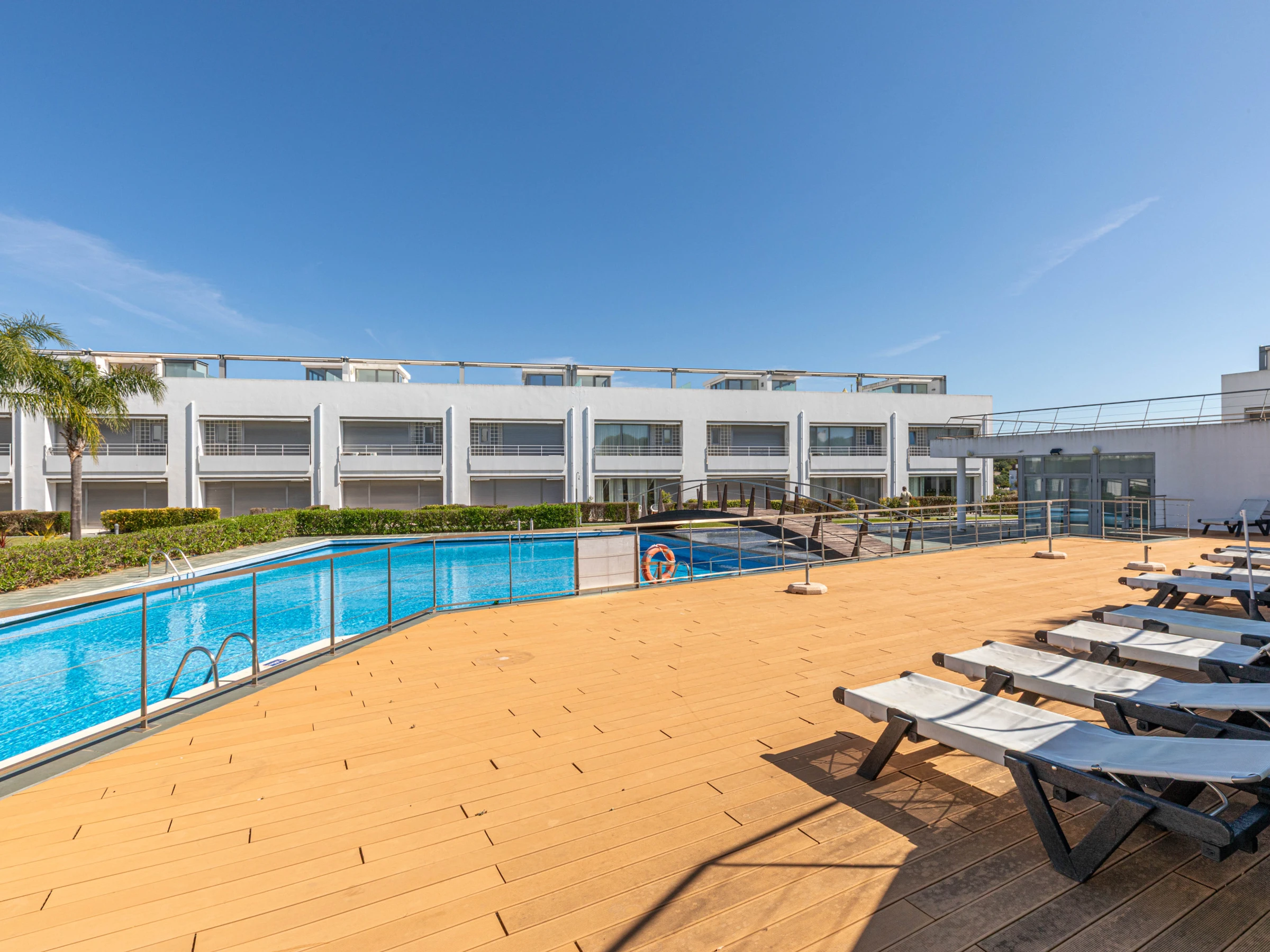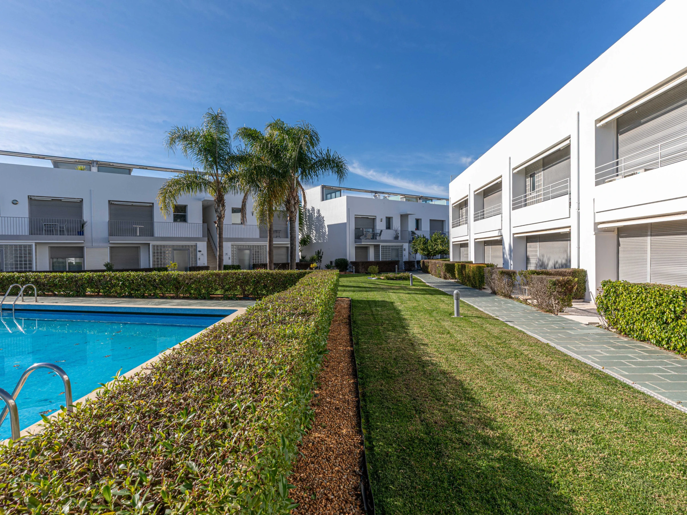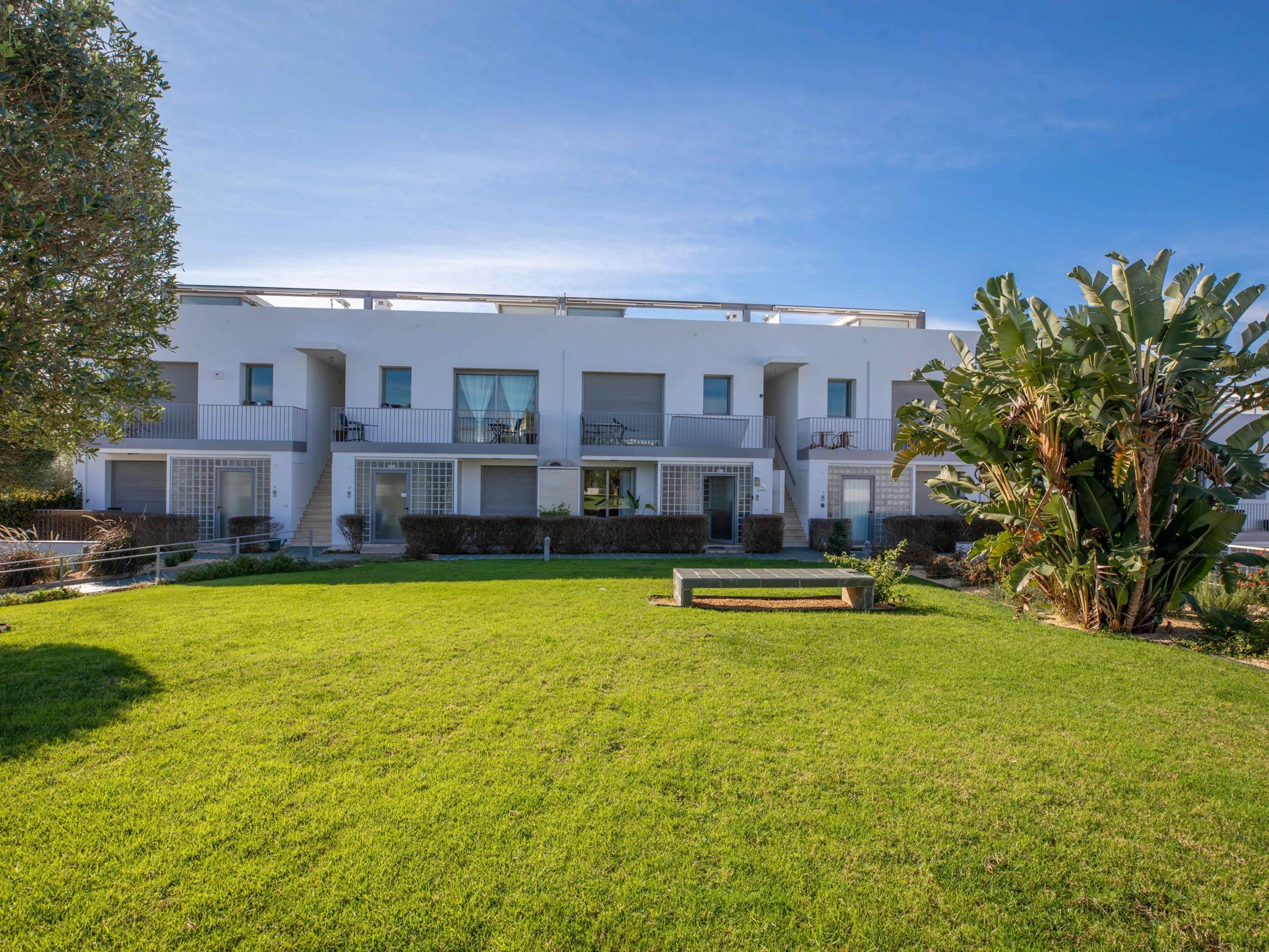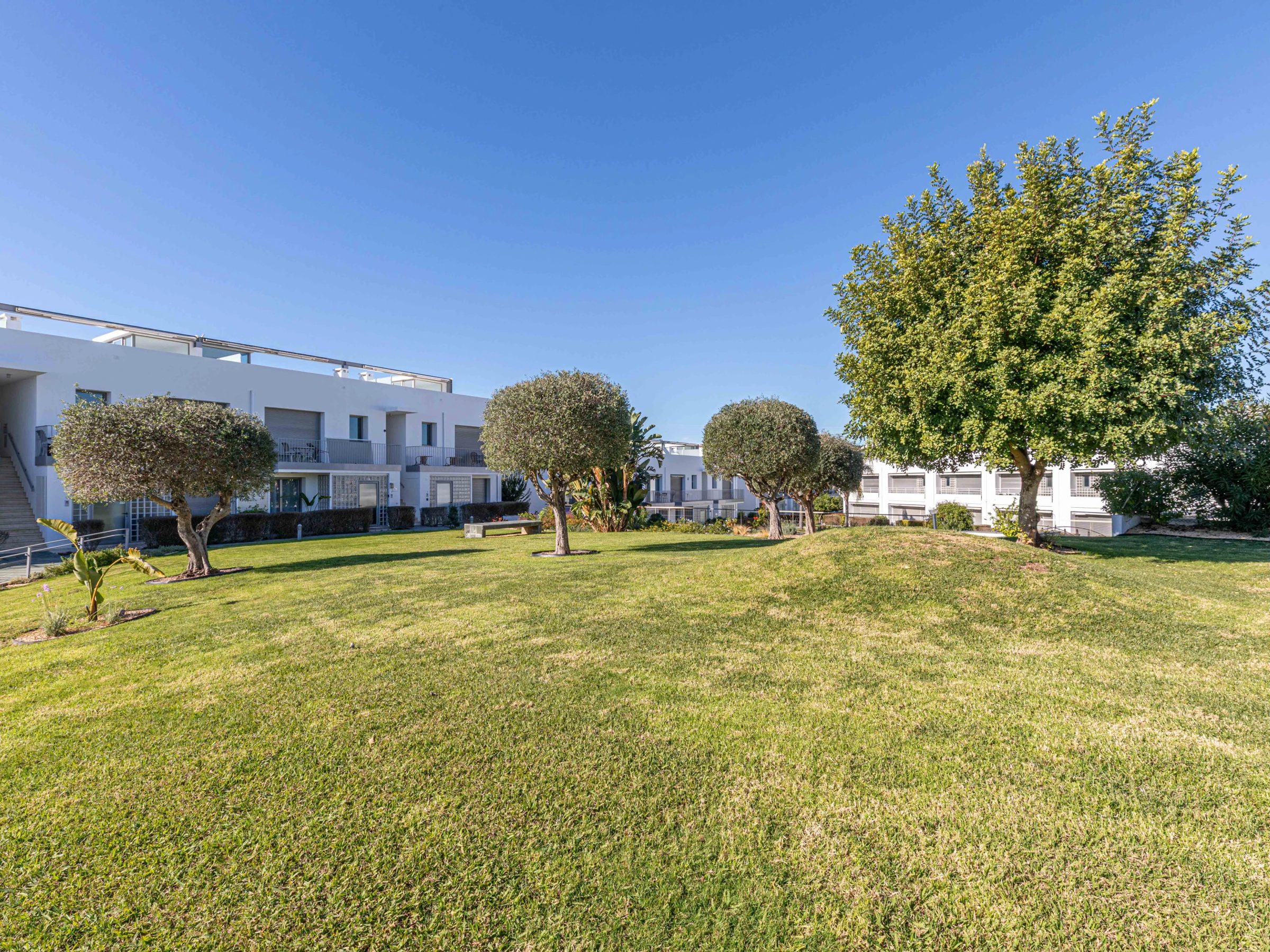 À l'avant de l'appartement se trouve une terrasse fraîche et ombragée, meublée d'une table de bistrot et de chaises, idéale pour profiter d'un ou deux verres au coucher du soleil tout en admirant les jardins verdoyants. La grande piscine, dotée d'un bassin pour enfants, offre le repos parfait à l'abri du soleil, où les enfants peuvent patauger toute la journée pendant que les adultes se détendent sur l'un des nombreux transats. La piscine et l'espace extérieur sont situés à quelques mètres de l'appartement, ce qui le rend pratique et sûr pour tous.
