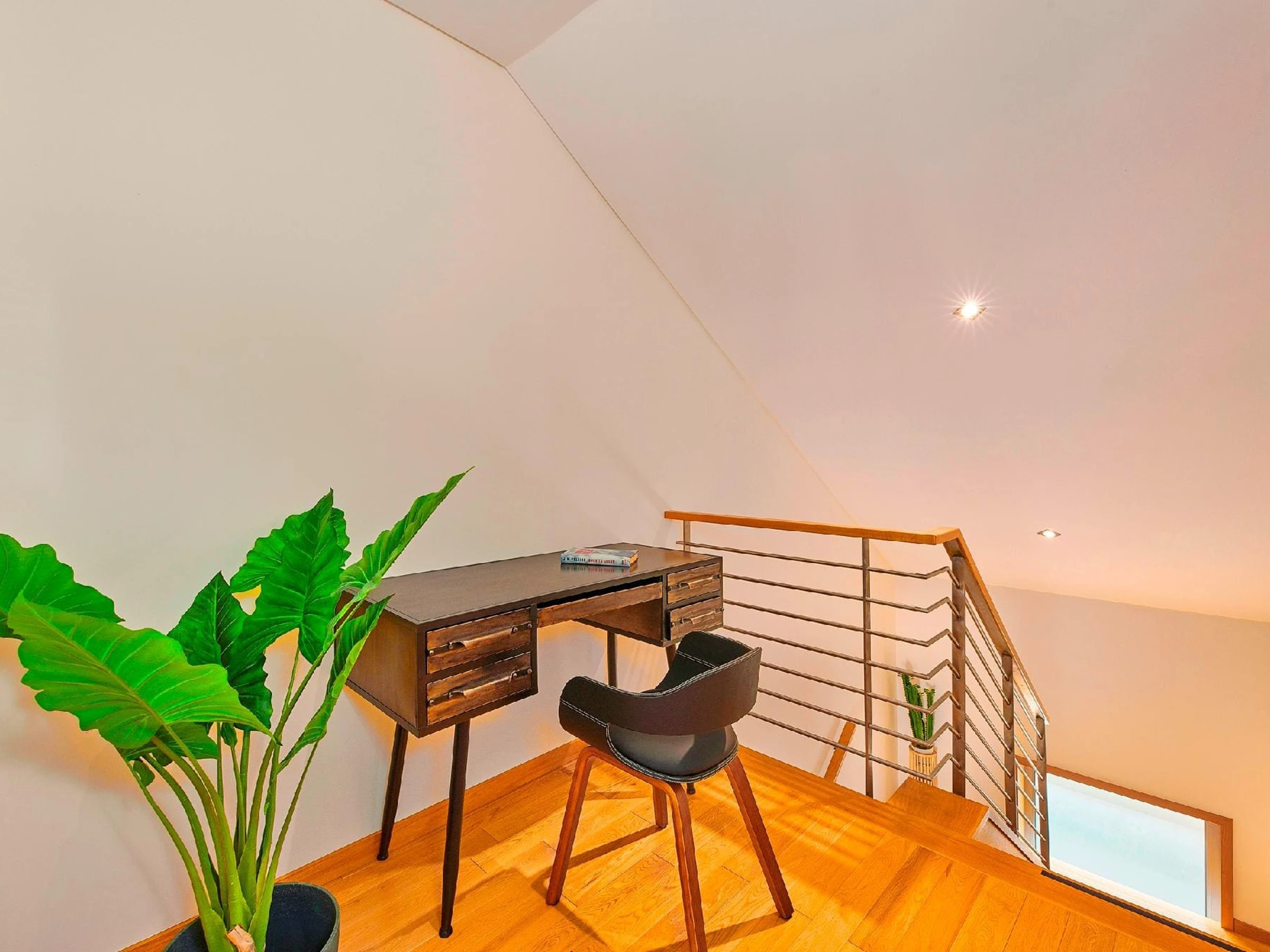 DEUXIÈME ÉTAGE : Le palier ouvert offre l'endroit idéal pour les emails et le temps administratif avec un espace de bureau et de travail. La suite de la chambre principale spacieuse dispose de sa propre salle de bain et de placards intégrés.
