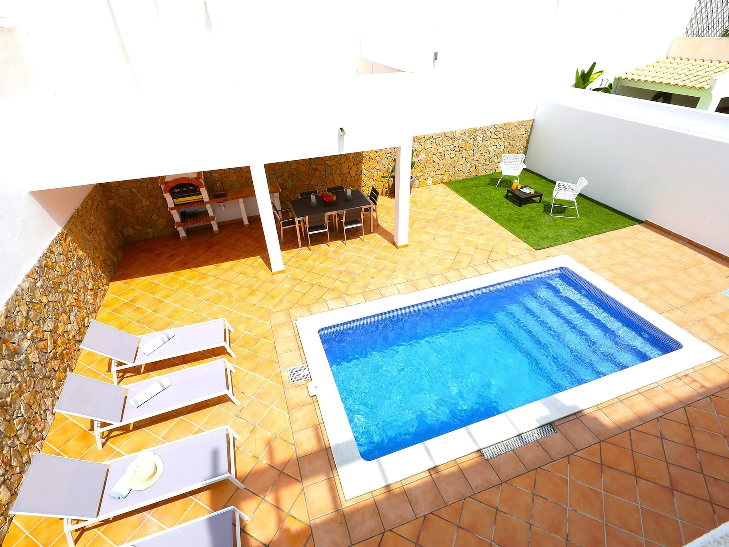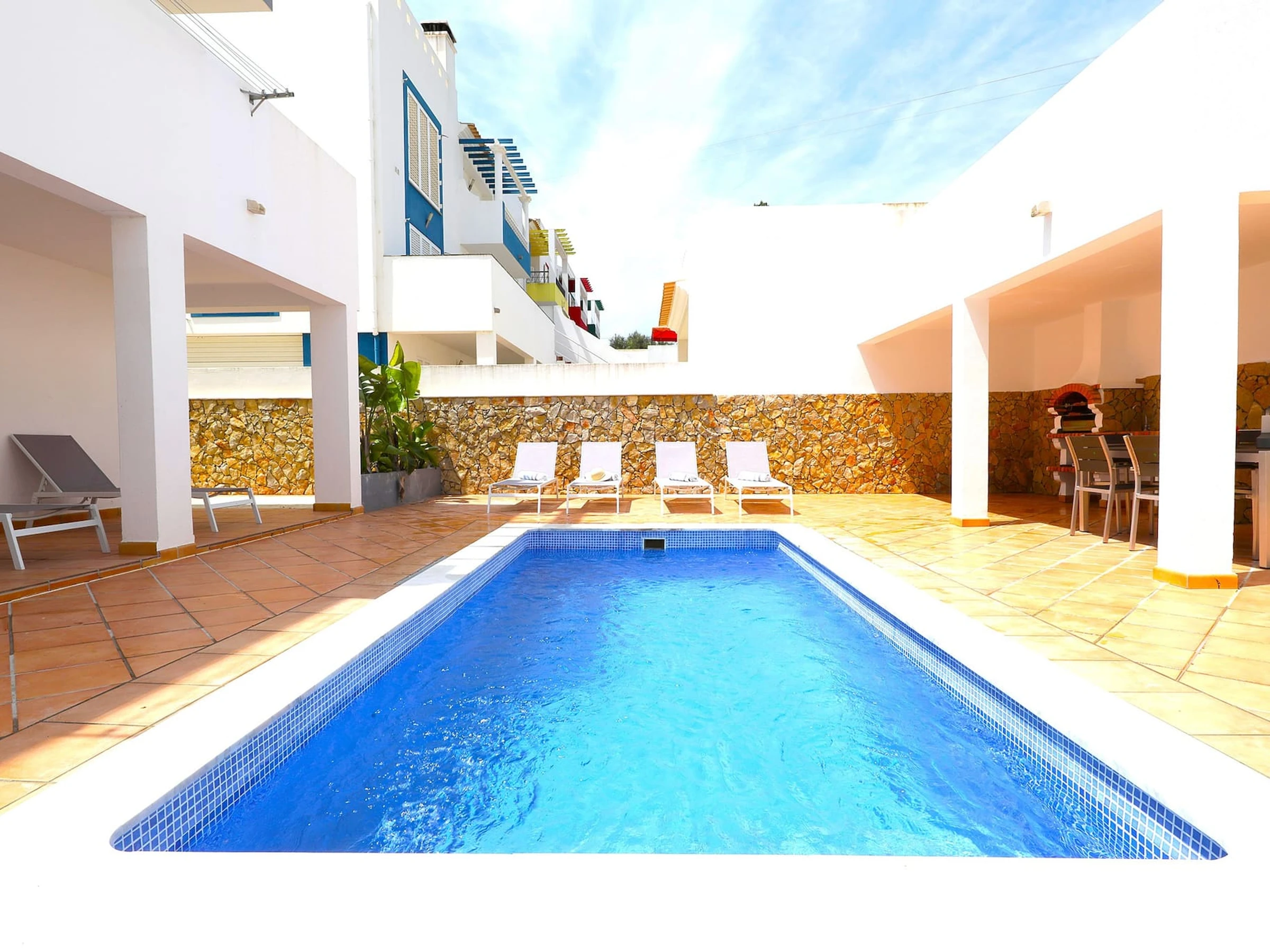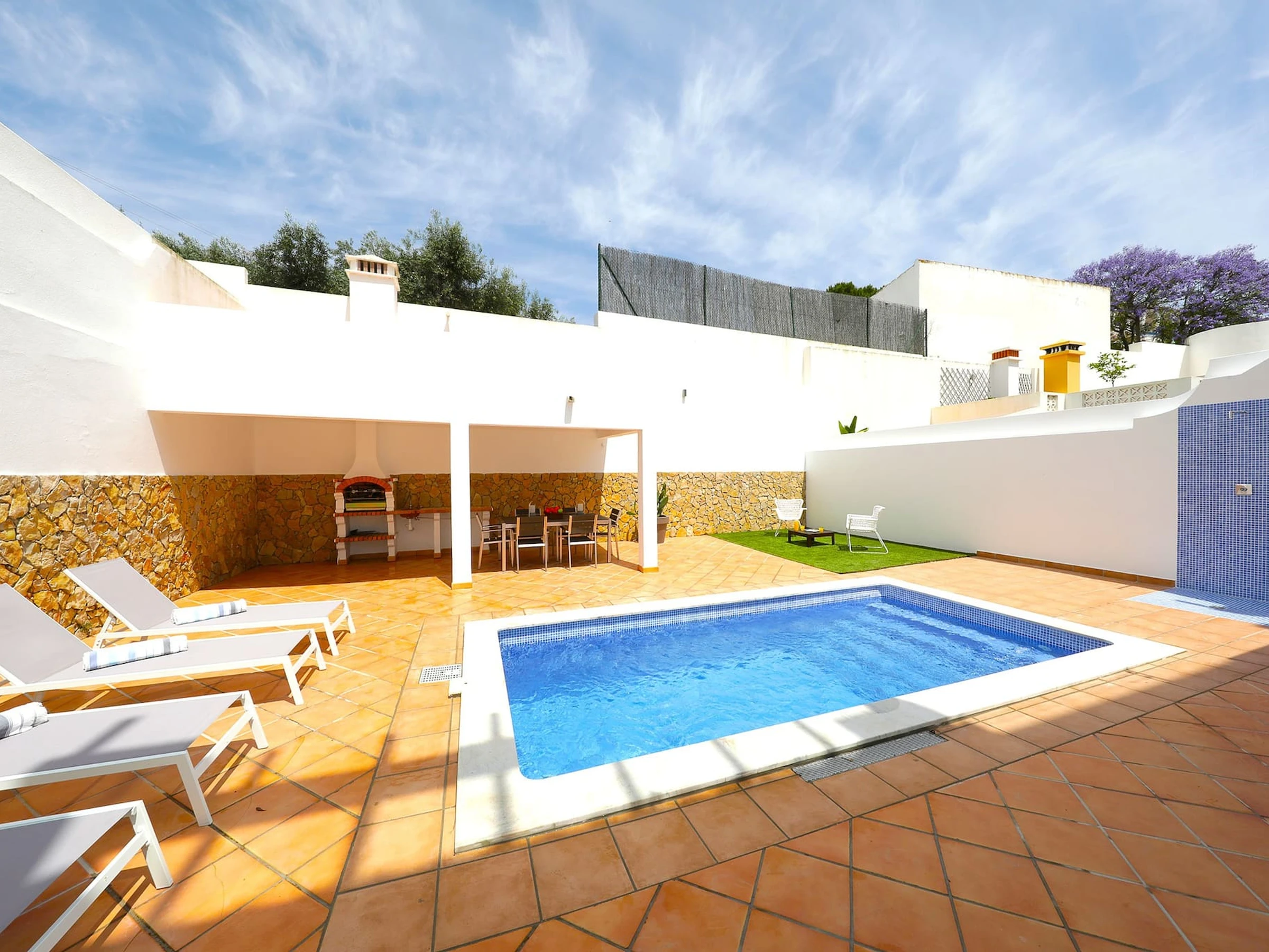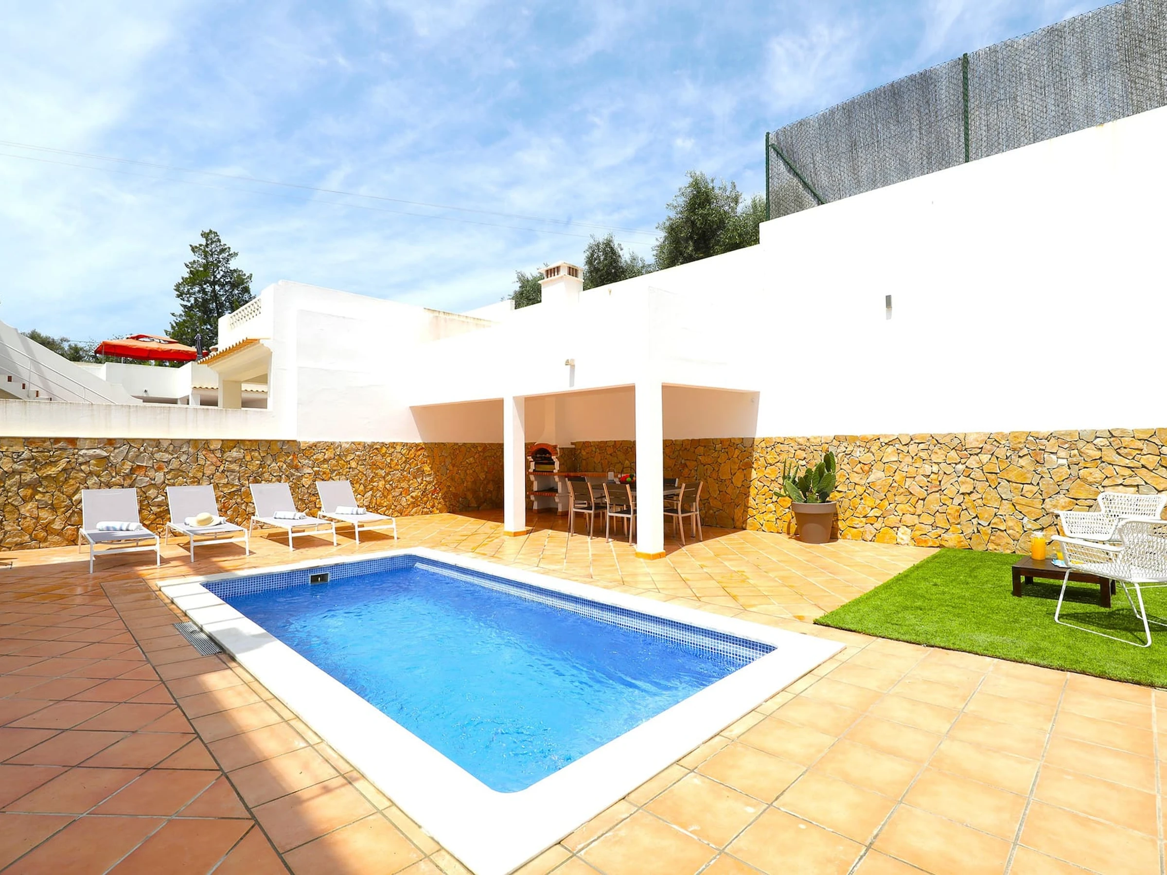 Villa moderne de 3 chambres dans un quartier résidentiel paisible près de Tavira. Le logement spacieux offre 3 chambres généreusement dimensionnées, un salon spacieux et une cuisine entièrement équipée. À l'arrière, un grand espace extérieur présente une piscine en terrasse, une aire de repas en plein air, des transats et un barbecue traditionnel parfait pour des rassemblements mémorables. À 10 minutes de marche, vous trouverez un éventail de restaurants éblouissants et un accès pratique à un bateau qui vous transportera vers l'île de la plage dorée pittoresque.