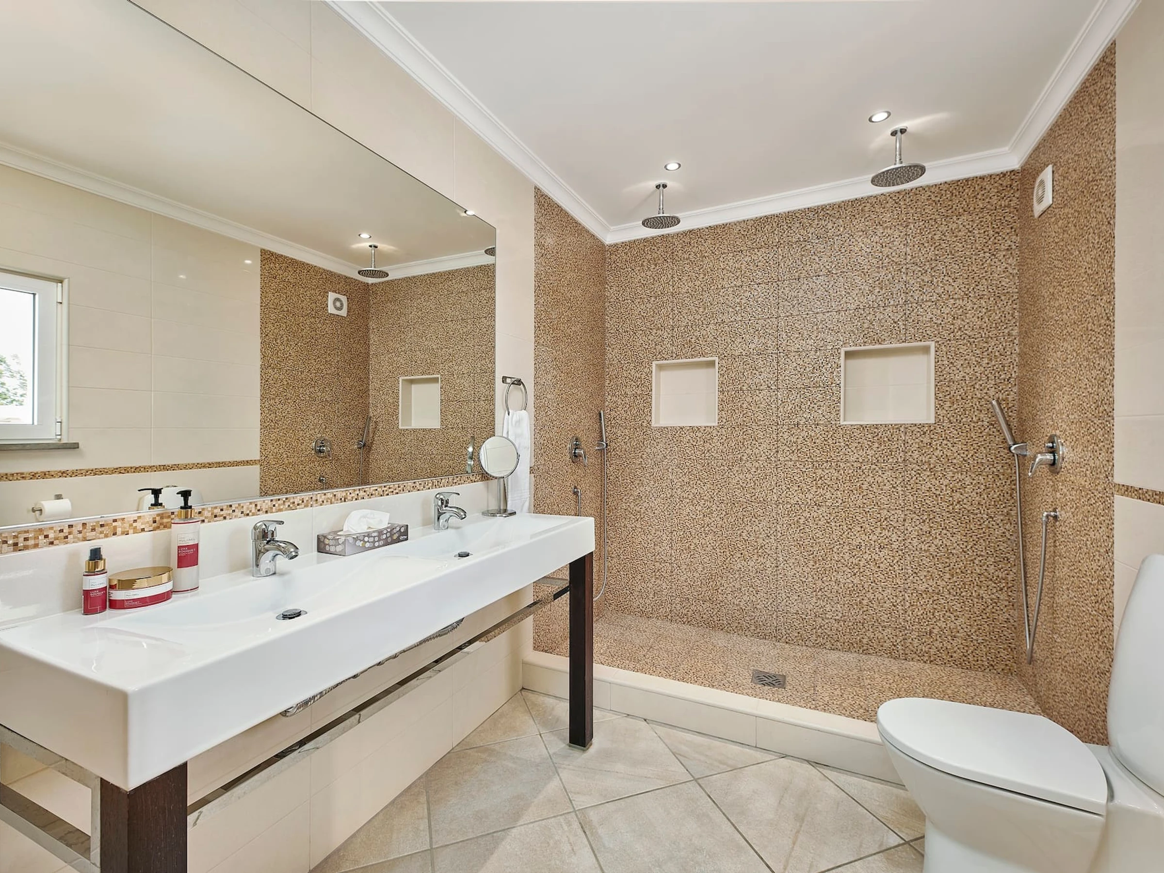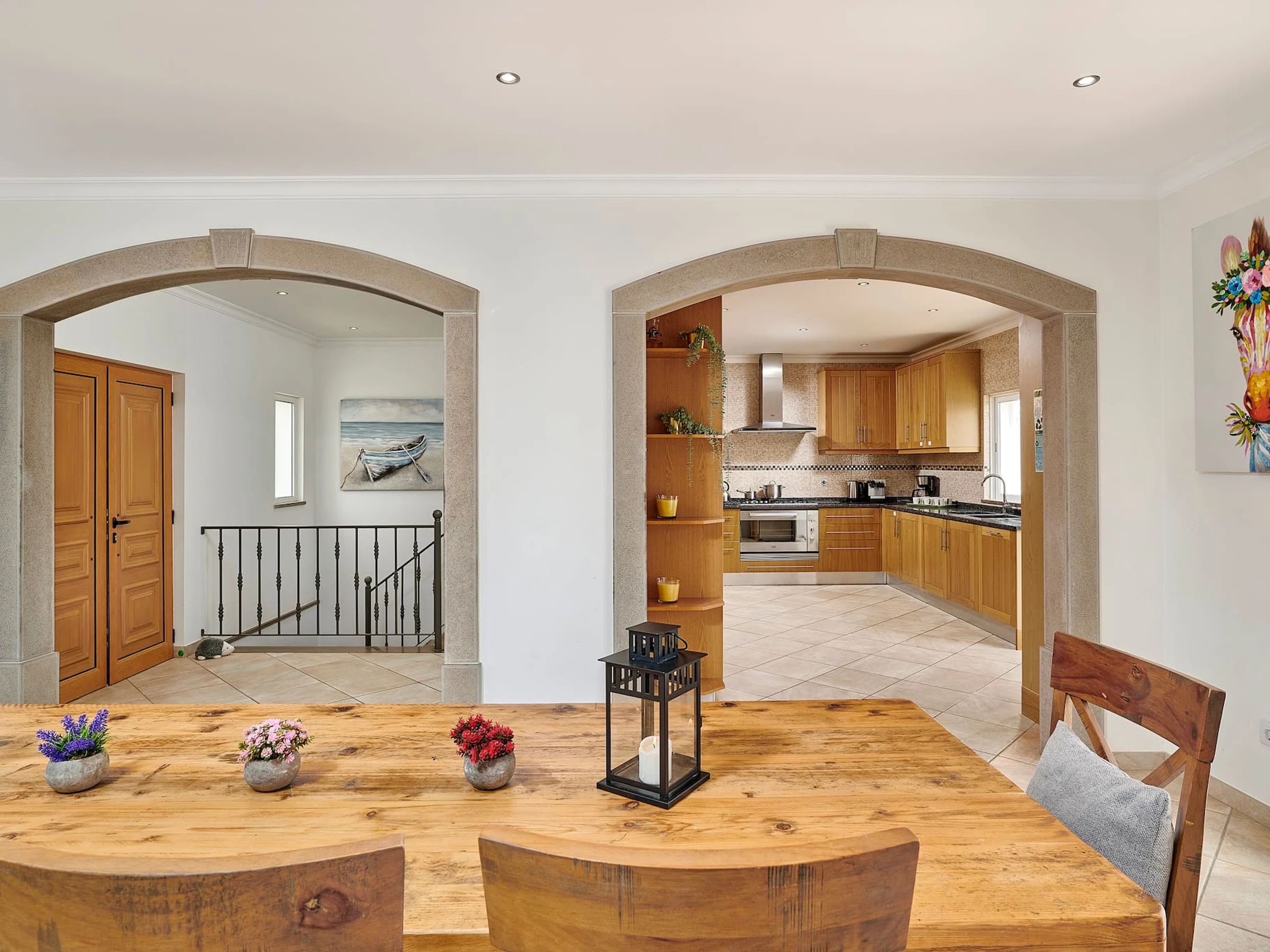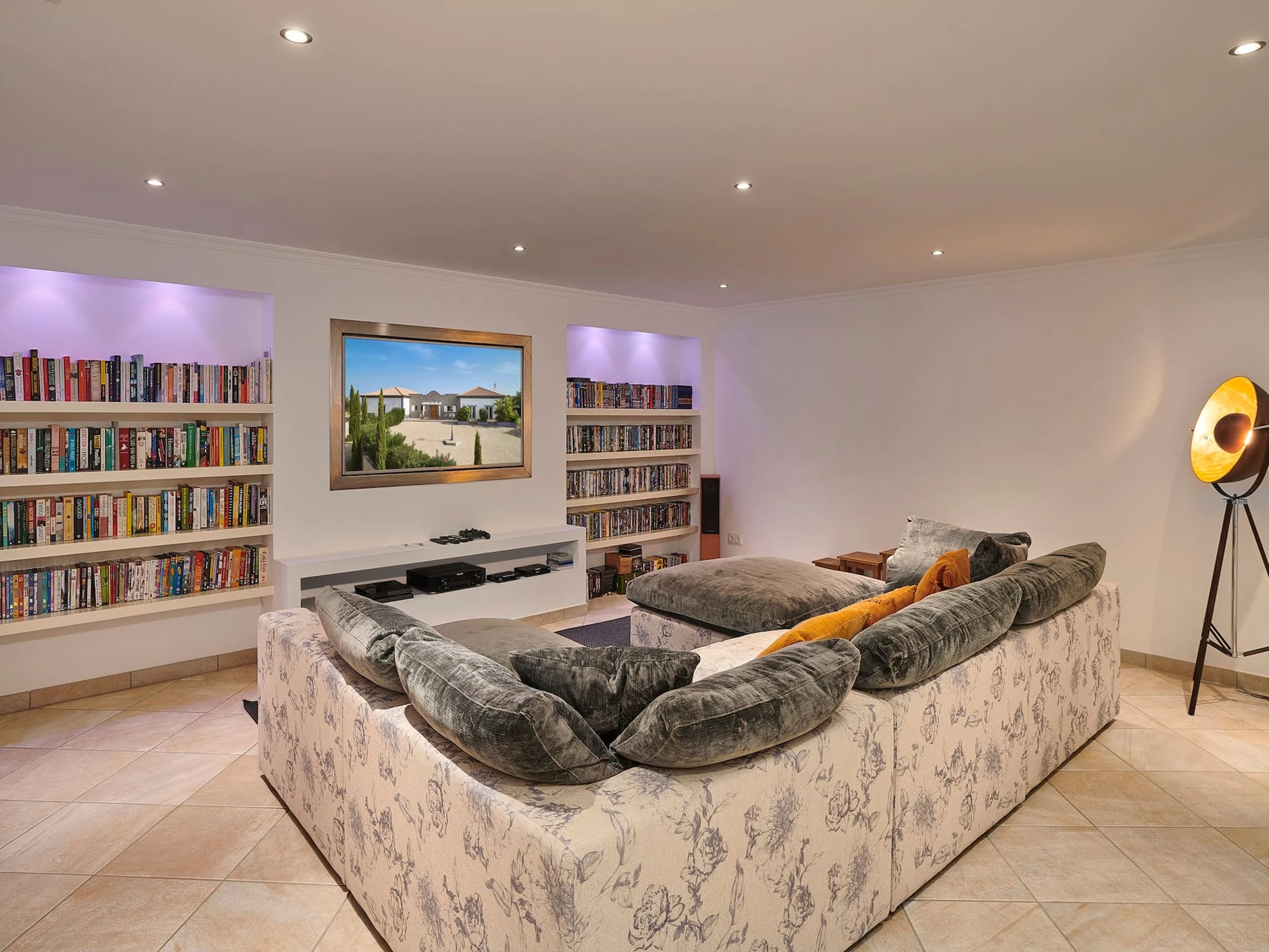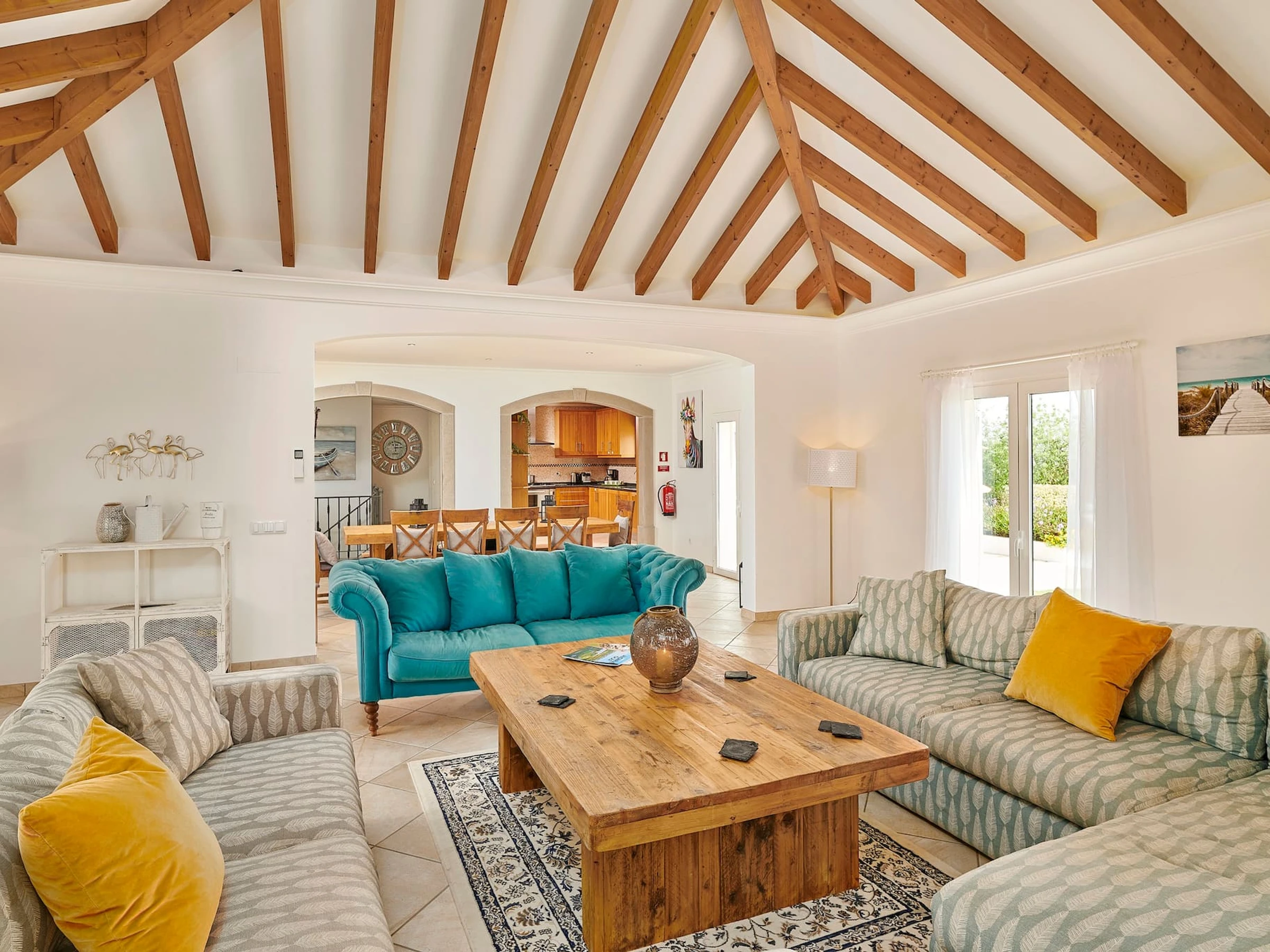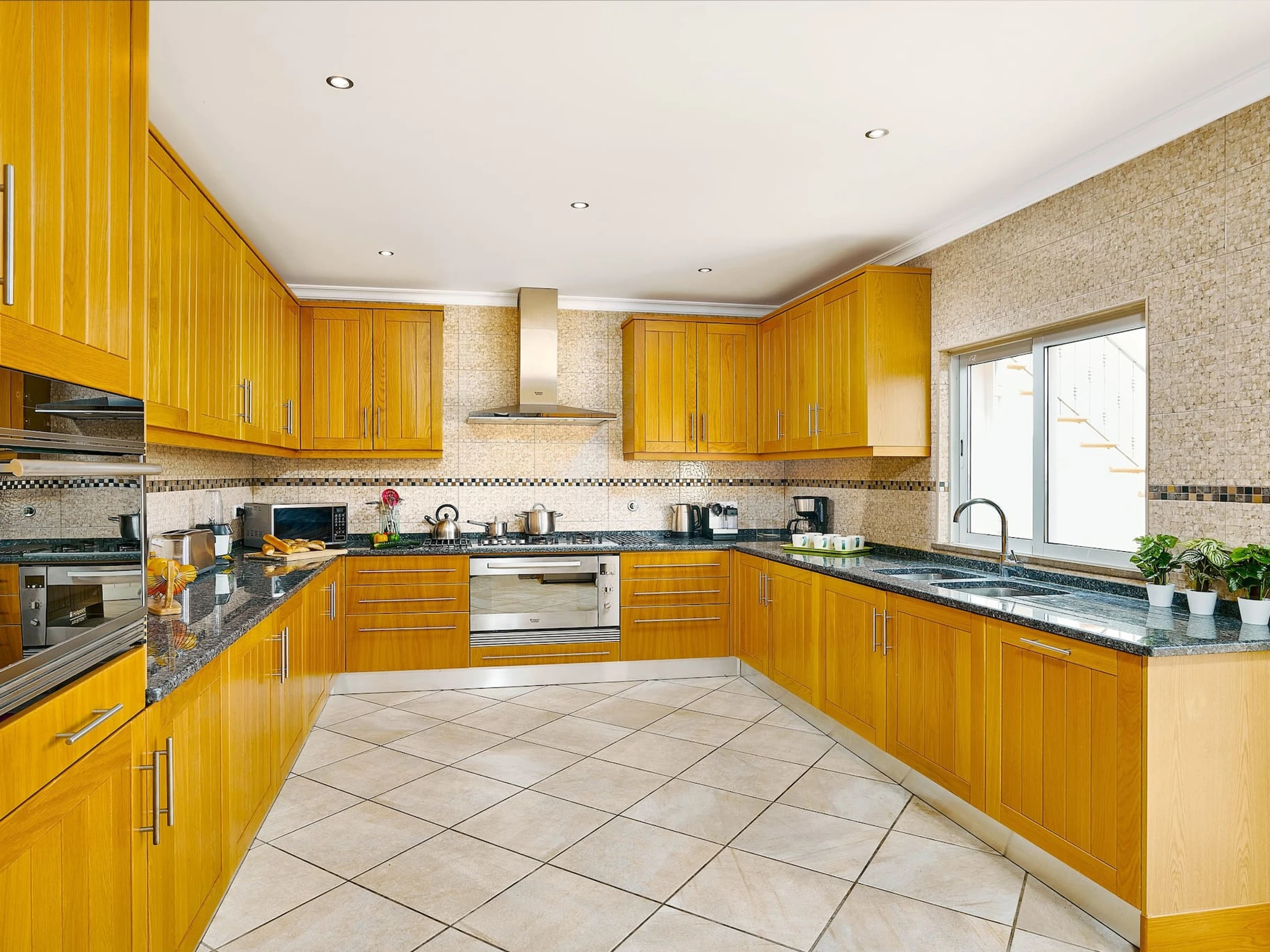 L'incroyable salon/salle à manger/cuisine ouvert comme point focal de la villa vous accueille avec ses élégants ameublements et sa grande table en bois. Équipée d'un approvisionnement sans fin en vaisselle, ustensiles, appareils et gadgets, la cuisine garantit que la préparation de repas à domicile pour de grands groupes est un plaisir. Le grand réfrigérateur de style américain, les machines à café et le presse-fruits ne sont que quelques-uns des délices de la cuisine. De là, vous passez au superbe salon avec son canapé infiniment confortable et son plafond magnifiquement ouvragé – un délice pour des soirées familiales chaleureuses à la maison.
