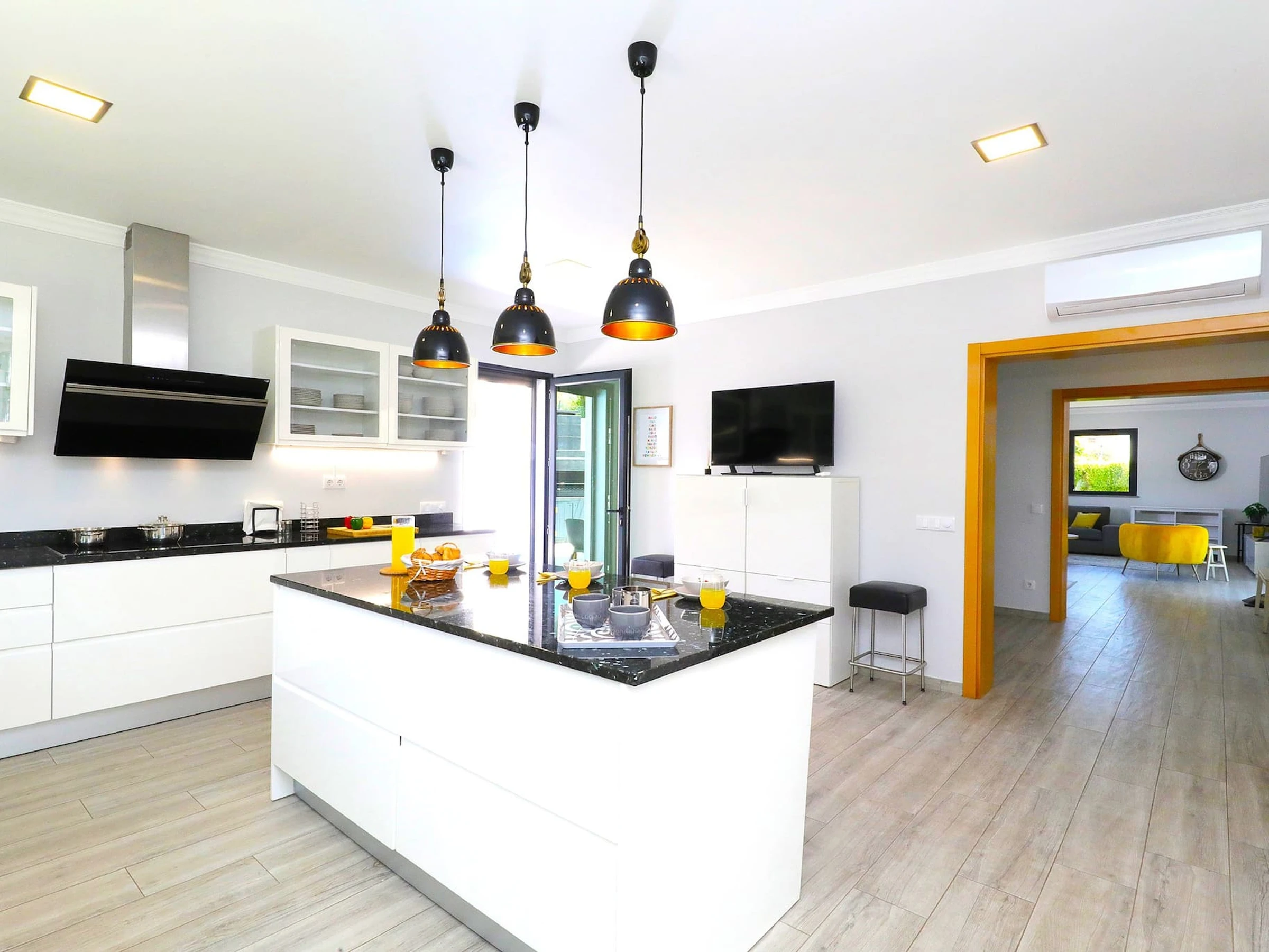 Pénétrez dans un monde de sophistication moderne avec cette location de villa de vacances. Dès votre entrée, vous serez enveloppé dans une atmosphère fraîche et spacieuse qui exhale une élégance contemporaine.